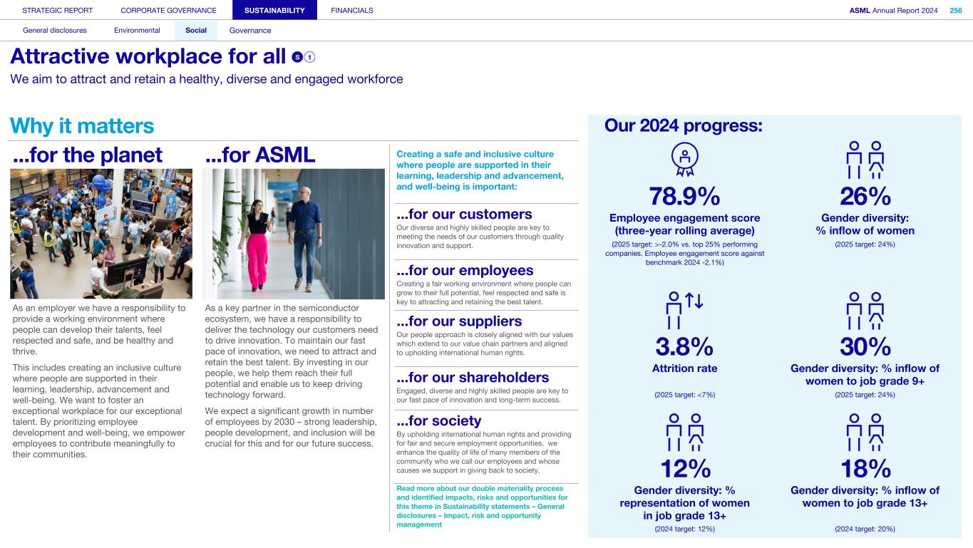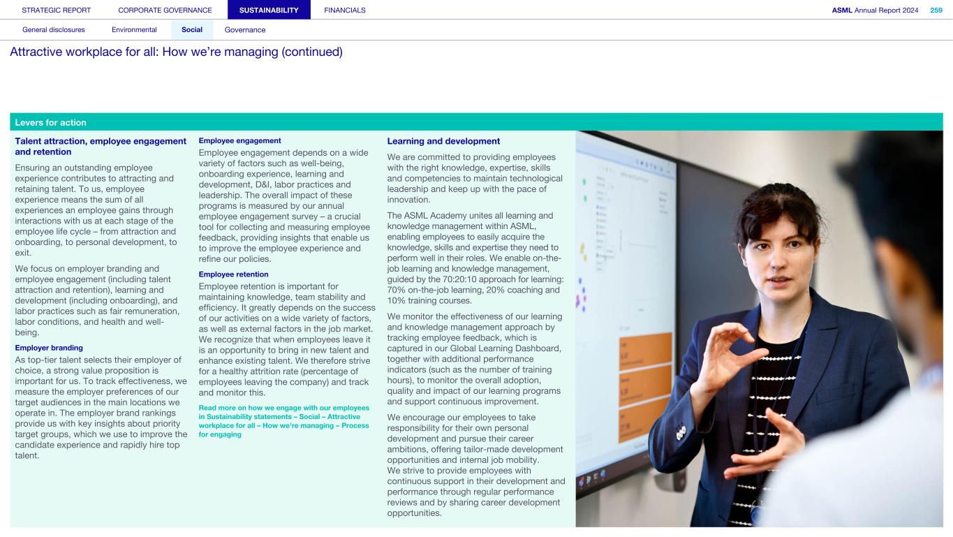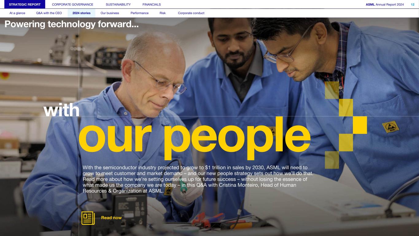 我们的员工为技术向前发展提供动力...随着半导体行业预计到2030年销售额将增长到1万亿美元,ASML将需要增长以满足客户和市场需求——而我们新的员工战略阐明了我们将如何做到这一点。在与ASML人力资源与组织主管Cristina Monteiro的问答中,阅读更多关于我们如何为未来的成功做好准备——同时又不会失去让我们成为今天这家公司的本质。立即阅读战略报告公司治理可持续发展财务ASML年度报告2024 12一览与CEO的问答2024故事我们的业务绩效风险公司行为