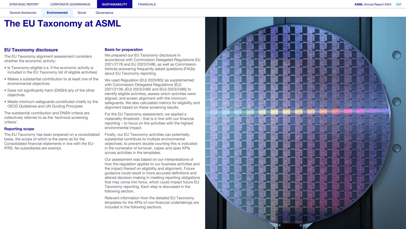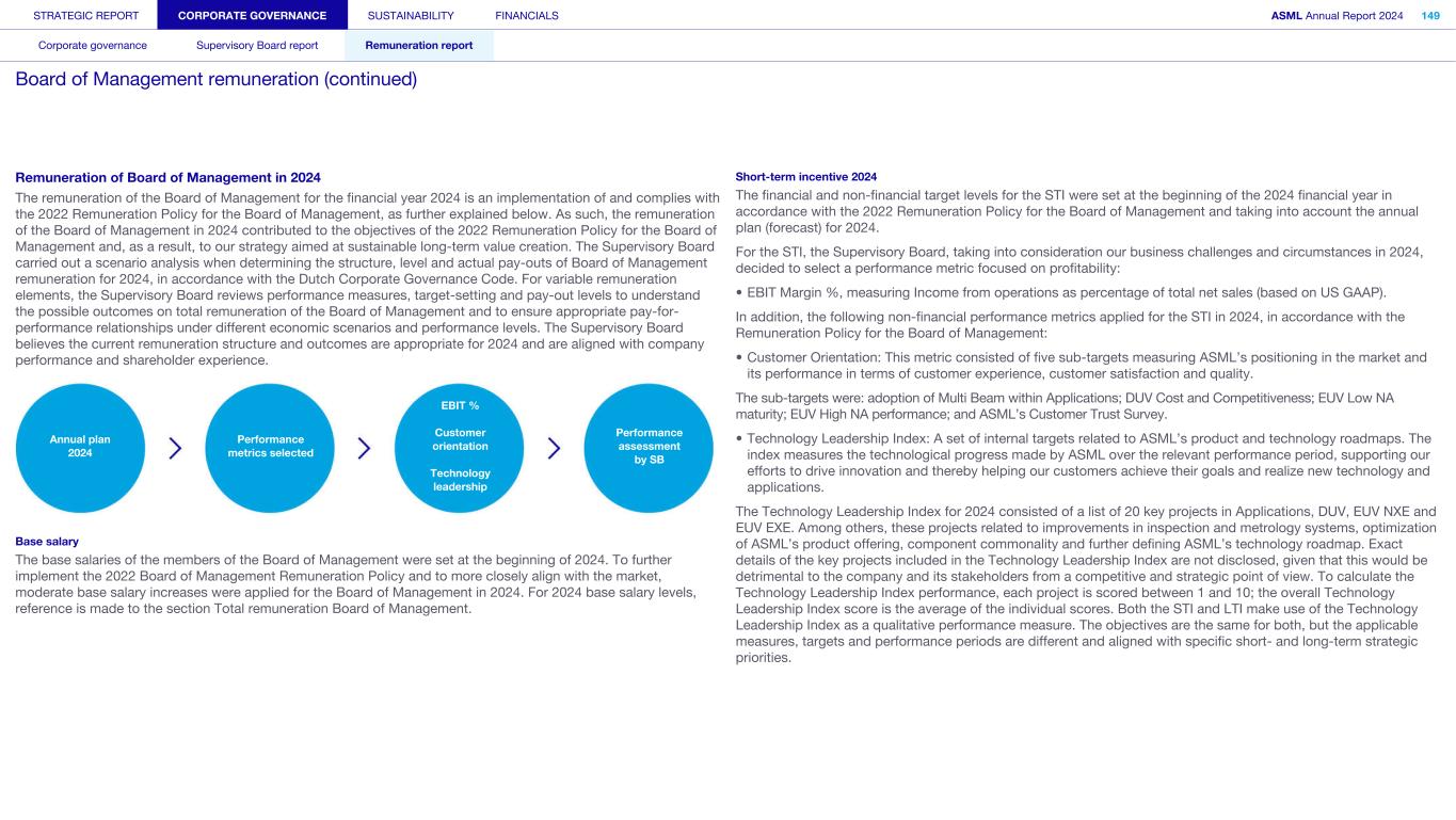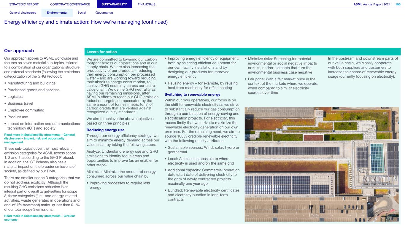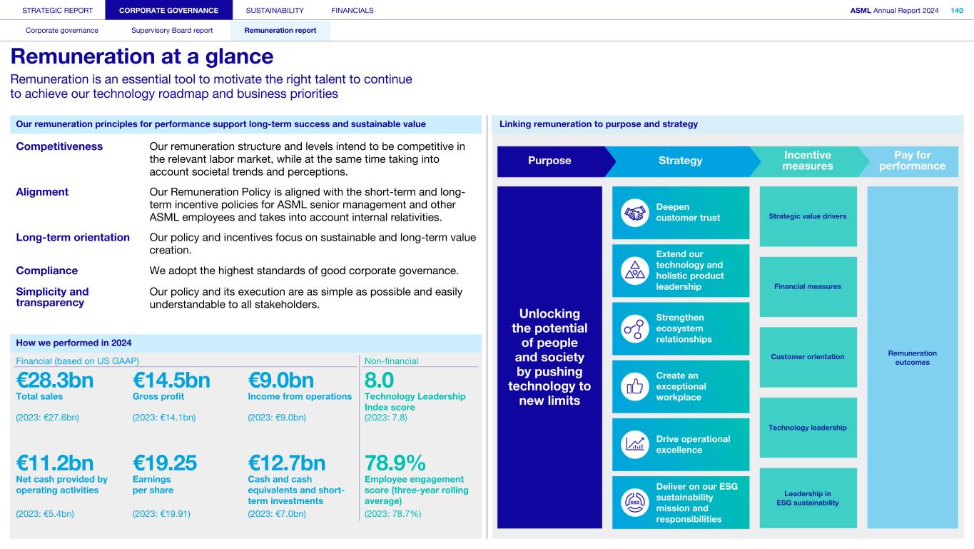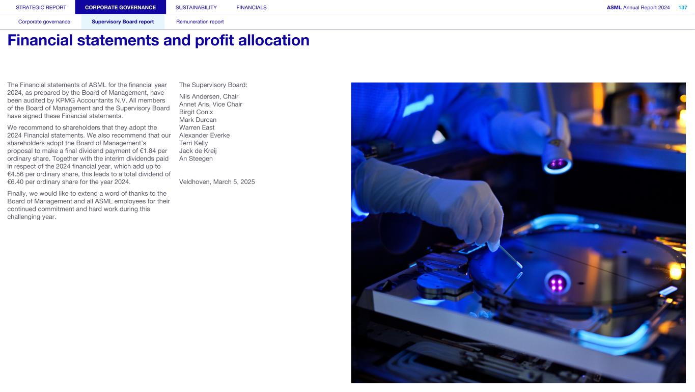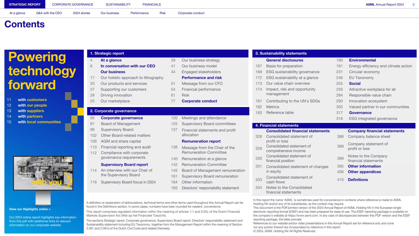 Powering technology forward 11 with customers 12 with our people 13 with suppliers 14 with partners 15 with local communities View our highlights online > Our 2024 online report highlights key information from this pdf with additional links to relevant information on our cor战略报告公司治理可持续发展财务ASML 2024年度报告3一览与CEO的问答2024故事我们的业务绩效风险公司行为内容1。战略报告4一览39我们的业务战略6与首席执行官的对话41我们的商业模式我们的业务44吸引了利益相关者17我们对光刻性能和风险的整体方法20我们的产品和服务51 CFO的信息27支持我们的客户54财务业绩28推动创新61风险33我们的市场77公司行为2。公司治理95公司治理120会议和出席情况97管理委员会125监事会委员会99监事会137财务报表和利润分配102其他董事会相关事项106年度股东大会和股本薪酬报告110财务报告和审计138薪酬委员会主席的信息112遵守公司治理要求140薪酬一览监事会报告142薪酬委员会114对我们监事会主席的采访145管理委员会薪酬161监事会薪酬116监事会2024年重点工作164其他信息165董事责任声明3。可持续发展声明一般披露190环境167编制基础191能源效率和气候行动169 ESG可持续发展治理231循环经济172 ESG可持续发展一览246欧盟分类法173我们的价值链概览255社会174影响、风险和机会管理256对所有人都有吸引力的工作场所284负责任的价值链181为联合国可持续发展目标作出贡献293创新生态系统182指标302我们社区中有价值的合作伙伴183参考表317治理318 ESG综合治理4。财务报表合并财务报表公司财务报表328合并损益表388公司资产负债表389公司损益表329合并综合收益表330合并财务状况表389公司财务报表附注331合并权益变动表395其他信息406其他附录333合并现金流量表410定义334合并财务报表附注本年度报告通篇使用的简称、技术术语和其他术语的定义或解释见定义部分。在某些情况下,为了方便读者,数字被四舍五入。本报告包含荷兰《金融市场监管法》(Wet op het Financieel Toezicht)第1:1和5:25c条含义内的受监管信息。包括欧盟分类法在内的战略报告、公司治理、监事会报告、董事责任声明和可持续发展声明等章节,共同构成荷兰民法典(以及相关法令)第2:391和2:391a节含义内的管理报告。在本报告中,有时会根据上下文可能需要,在提及阿斯麦 NV和/或其任何子公司的情况下,为方便起见使用“ASML”这一名称。本文件是欧洲单一电子报告格式(ESEF)的阿斯麦 NV 2024年年度报告的PDF/印刷版,为便于使用而编制。ESEF报告包可在公司网站https://www.asml.com上查阅。在此PDF版本与ESEF报告包之间存在任何差异的情况下,以后者为准。本年度报告中对我们网站和/或视频演示的引用仅供参考,其中没有任何或任何部分以引用方式并入本报告。©2024,阿斯麦 NV保留所有权利。