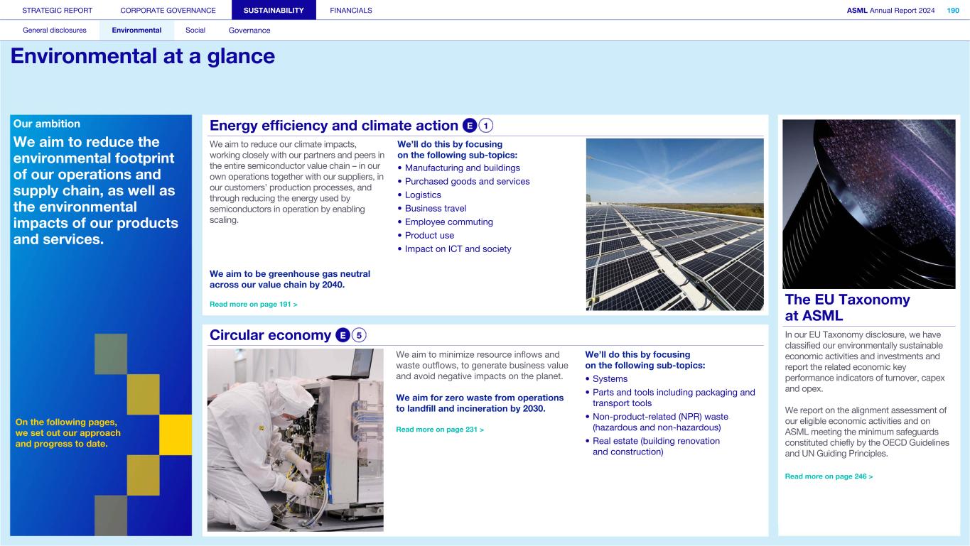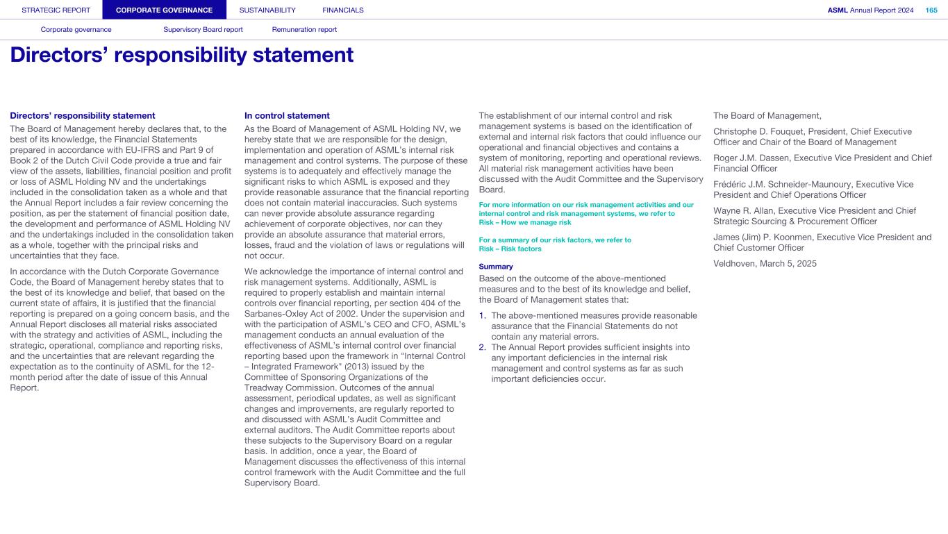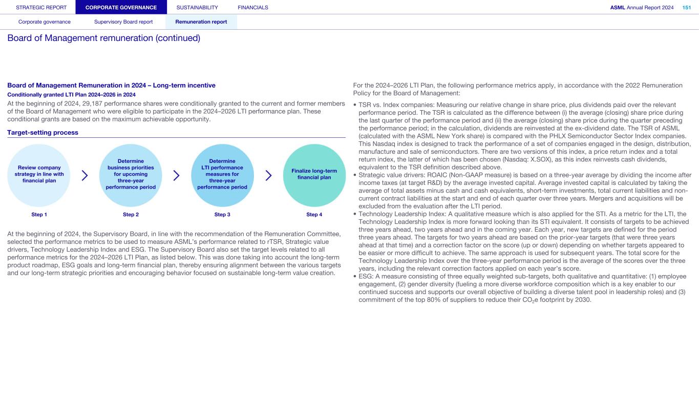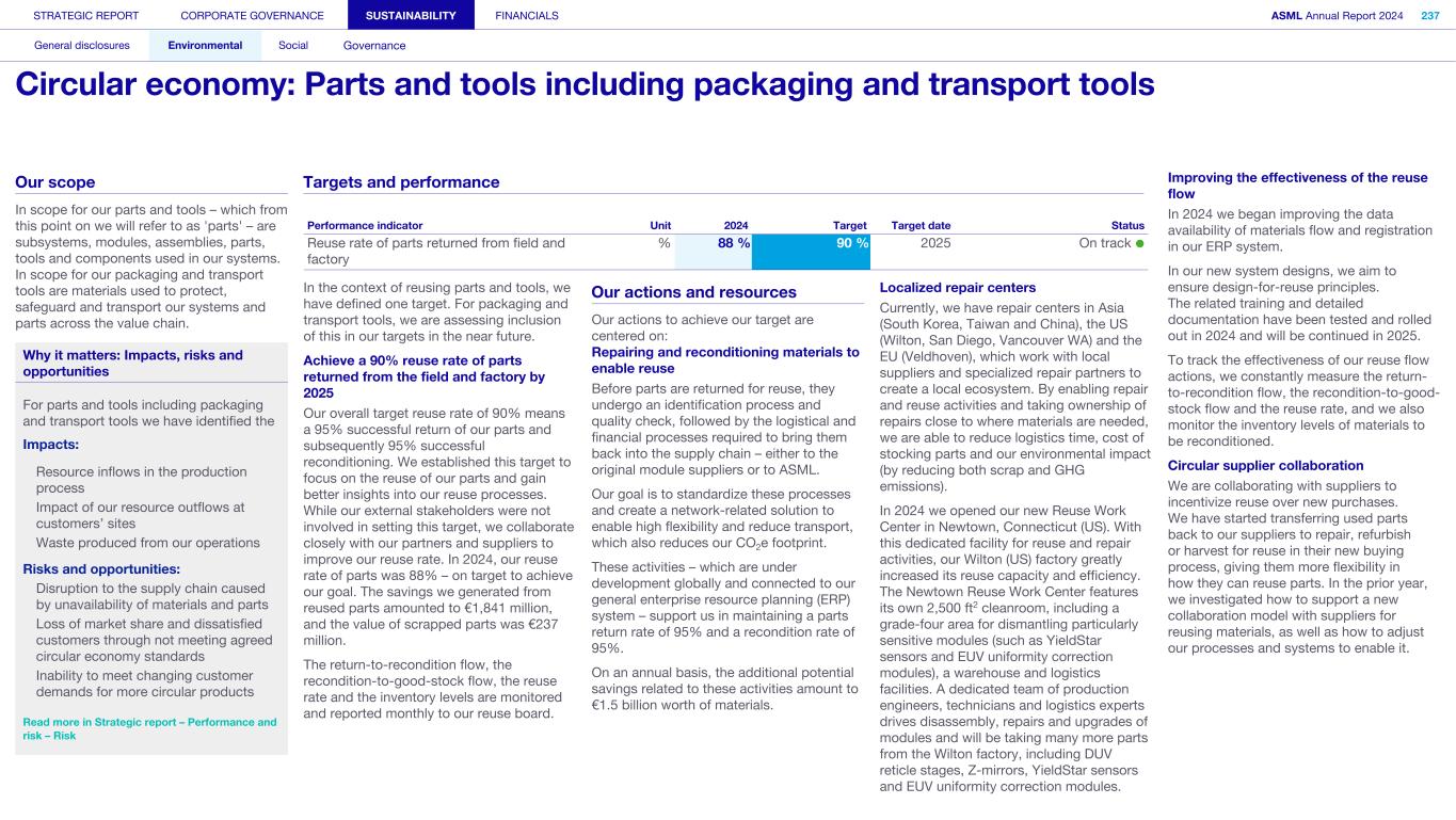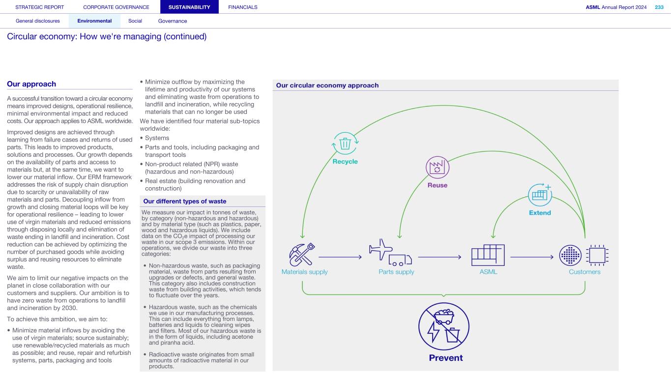 Powering technology forward 11 with customers 12 with our people 13 with suppliers 14 with partners 15 with local communities View our highlights online > Our 2024 online report highlights key information from this pdf with additional links to relevant information on our cor战略报告公司治理可持续发展财务ASML 2024年度报告3一览与CEO的问答2024故事我们的业务绩效风险公司行为内容1。战略报告4一览39我们的业务战略6与首席执行官的对话41我们的商业模式我们的业务44吸引了利益相关者17我们对光刻性能和风险的整体方法20我们的产品和服务51 CFO的信息27支持我们的客户54财务业绩28推动创新61风险33我们的市场77公司行为2。公司治理95公司治理120会议和出席情况97管理委员会125监事会委员会99监事会137财务报表和利润分配102其他董事会相关事项106年度股东大会和股本薪酬报告110财务报告和审计138薪酬委员会主席的信息112遵守公司治理要求140薪酬一览监事会报告142薪酬委员会114对我们监事会主席的采访145管理委员会薪酬161监事会薪酬116监事会2024年重点工作164其他信息165董事责任声明3。可持续发展声明一般披露190环境167编制基础191能源效率和气候行动169 ESG可持续发展治理231循环经济172 ESG可持续发展一览246欧盟分类法173我们的价值链概览255社会174影响、风险和机会管理256对所有人都有吸引力的工作场所284负责任的价值链181为联合国可持续发展目标作出贡献293创新生态系统182指标302我们社区中有价值的合作伙伴183参考表317治理318 ESG综合治理4。财务报表合并财务报表公司财务报表328合并损益表388公司资产负债表389公司损益表329合并综合收益表330合并财务状况表389公司财务报表附注331合并权益变动表395其他信息406其他附录333合并现金流量表410定义334合并财务报表附注本年度报告通篇使用的简称、技术术语和其他术语的定义或解释见定义部分。在某些情况下,为了方便读者,数字被四舍五入。本报告包含荷兰《金融市场监管法》(Wet op het Financieel Toezicht)第1:1和5:25c条含义内的受监管信息。包括欧盟分类法在内的战略报告、公司治理、监事会报告、董事责任声明和可持续发展声明等章节,共同构成荷兰民法典(以及相关法令)第2:391和2:391a节含义内的管理报告。在本报告中,有时会根据上下文可能需要,在提及阿斯麦 NV和/或其任何子公司的情况下,为方便起见使用“ASML”这一名称。本文件是欧洲单一电子报告格式(ESEF)的阿斯麦 NV 2024年年度报告的PDF/印刷版,为便于使用而编制。ESEF报告包可在公司网站https://www.asml.com上查阅。在此PDF版本与ESEF报告包之间存在任何差异的情况下,以后者为准。本年度报告中对我们网站和/或视频演示的引用仅供参考,其中没有任何或任何部分以引用方式并入本报告。©2024,阿斯麦 NV保留所有权利。