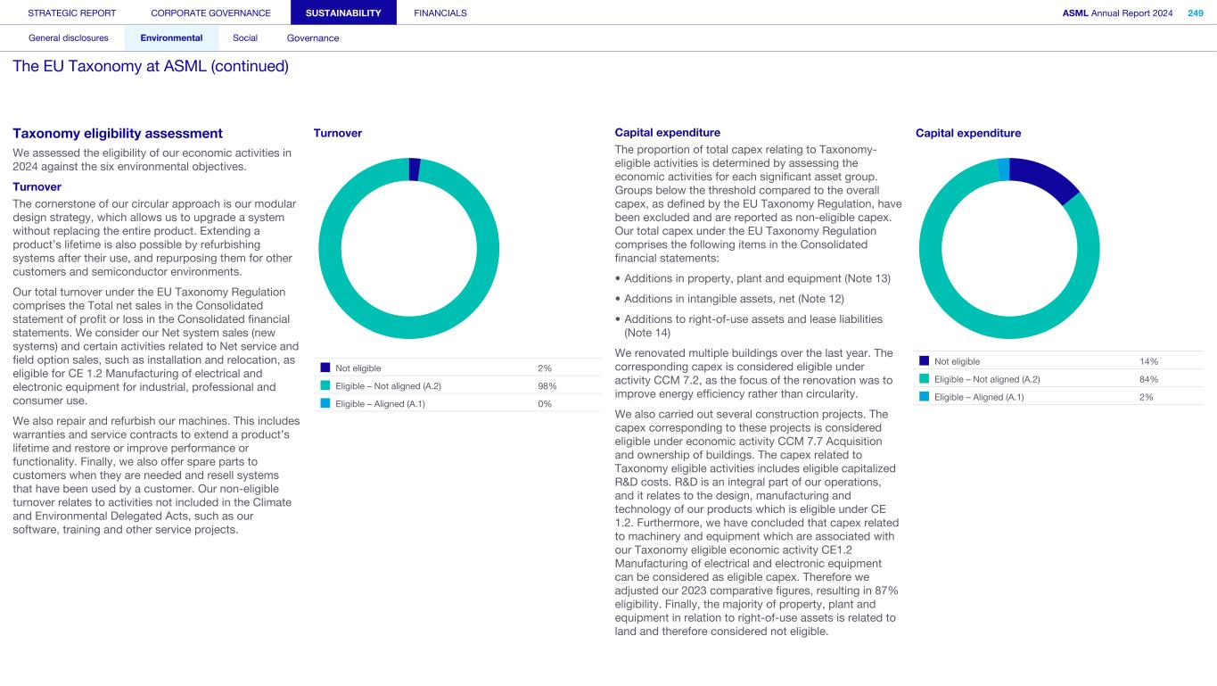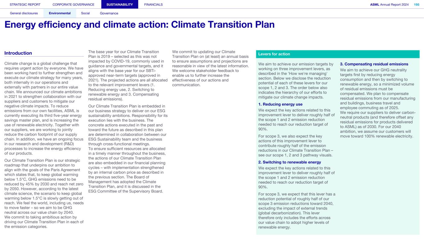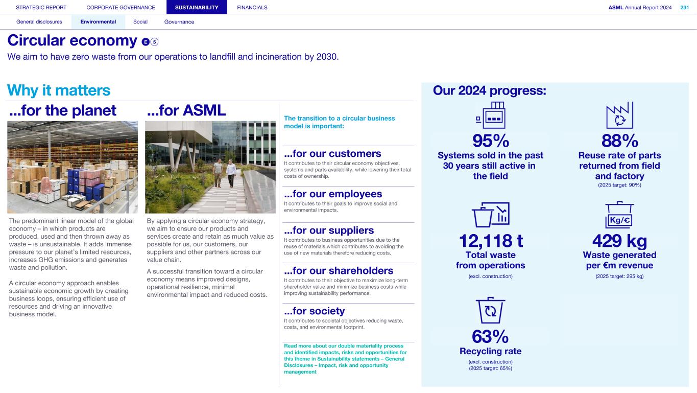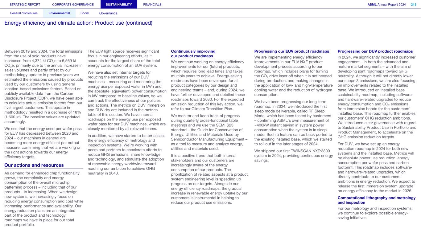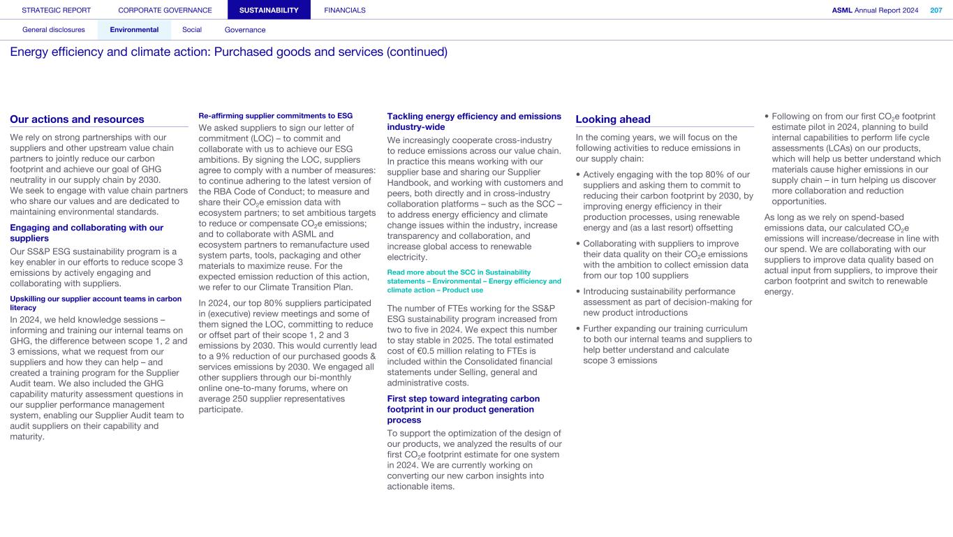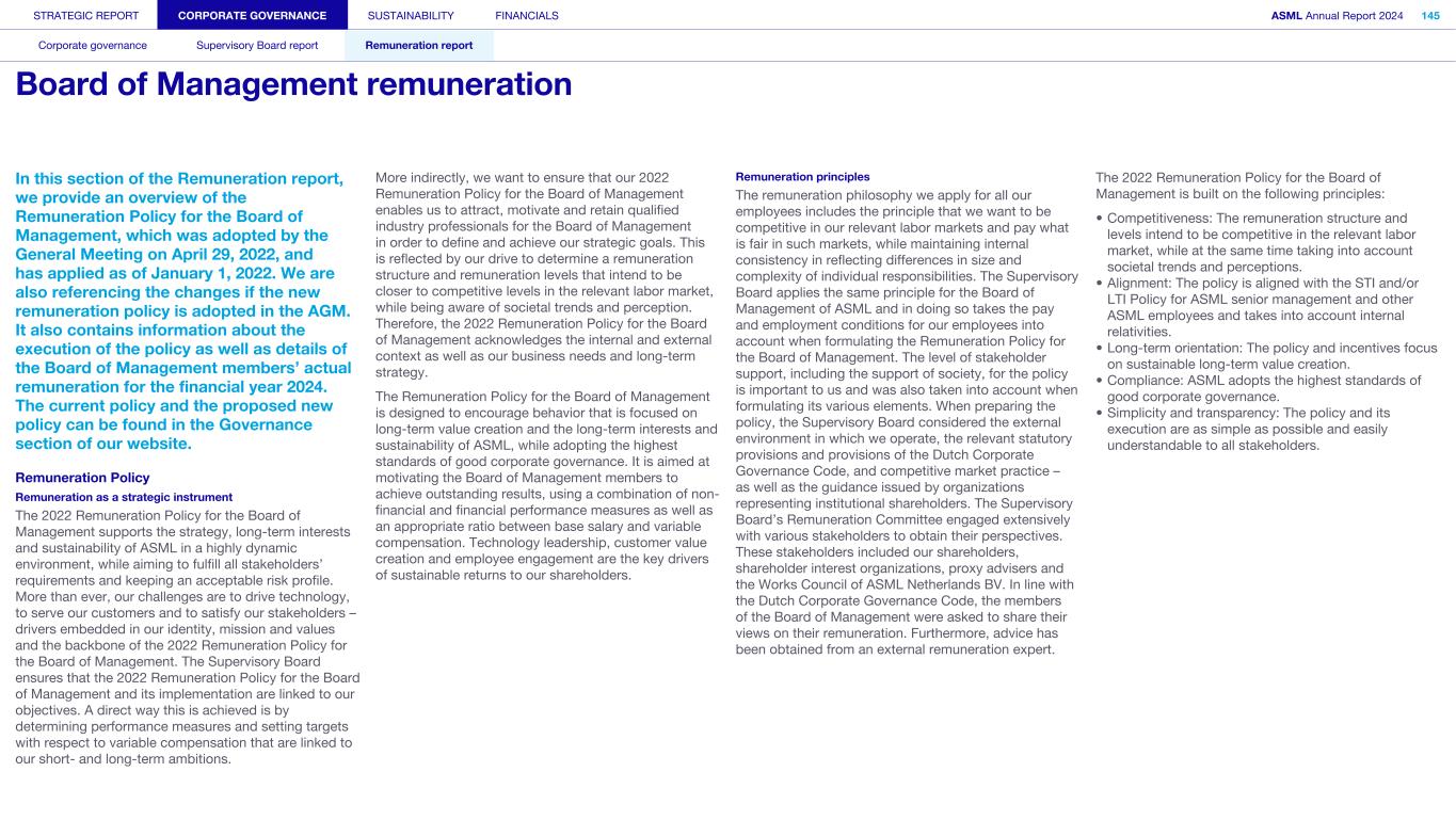 Powering technology forward 11 with customers 12 with our people 13 with suppliers 14 with partners 15 with local communities View our highlights online > Our 2024 online report highlights key information from this pdf with additional links to relevant information on our cor战略报告公司治理可持续发展财务ASML 2024年度报告3一览与CEO的问答2024故事我们的业务绩效风险公司行为内容1。战略报告4一览39我们的业务战略6与首席执行官的对话41我们的商业模式我们的业务44吸引了利益相关者17我们对光刻性能和风险的整体方法20我们的产品和服务51 CFO的信息27支持我们的客户54财务业绩28推动创新61风险33我们的市场77公司行为2。公司治理95公司治理120会议和出席情况97管理委员会125监事会委员会99监事会137财务报表和利润分配102其他董事会相关事项106年度股东大会和股本薪酬报告110财务报告和审计138薪酬委员会主席的信息112遵守公司治理要求140薪酬一览监事会报告142薪酬委员会114对我们监事会主席的采访145管理委员会薪酬161监事会薪酬116监事会2024年重点工作164其他信息165董事责任声明3。可持续发展声明一般披露190环境167编制基础191能源效率和气候行动169 ESG可持续发展治理231循环经济172 ESG可持续发展一览246欧盟分类法173我们的价值链概览255社会174影响、风险和机会管理256对所有人都有吸引力的工作场所284负责任的价值链181为联合国可持续发展目标作出贡献293创新生态系统182指标302我们社区中有价值的合作伙伴183参考表317治理318 ESG综合治理4。财务报表合并财务报表公司财务报表328合并损益表388公司资产负债表389公司损益表329合并综合收益表330合并财务状况表389公司财务报表附注331合并权益变动表395其他信息406其他附录333合并现金流量表410定义334合并财务报表附注本年度报告通篇使用的简称、技术术语和其他术语的定义或解释见定义部分。在某些情况下,为了方便读者,数字被四舍五入。本报告包含荷兰《金融市场监管法》(Wet op het Financieel Toezicht)第1:1和5:25c条含义内的受监管信息。包括欧盟分类法在内的战略报告、公司治理、监事会报告、董事责任声明和可持续发展声明等章节,共同构成荷兰民法典(以及相关法令)第2:391和2:391a节含义内的管理报告。在本报告中,有时会根据上下文可能需要,在提及阿斯麦 NV和/或其任何子公司的情况下,为方便起见使用“ASML”这一名称。本文件是欧洲单一电子报告格式(ESEF)的阿斯麦 NV 2024年年度报告的PDF/印刷版,为便于使用而编制。ESEF报告包可在公司网站https://www.asml.com上查阅。在此PDF版本与ESEF报告包之间存在任何差异的情况下,以后者为准。本年度报告中对我们网站和/或视频演示的引用仅供参考,其中没有任何或任何部分以引用方式并入本报告。©2024,阿斯麦 NV保留所有权利。