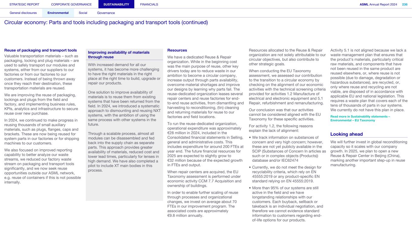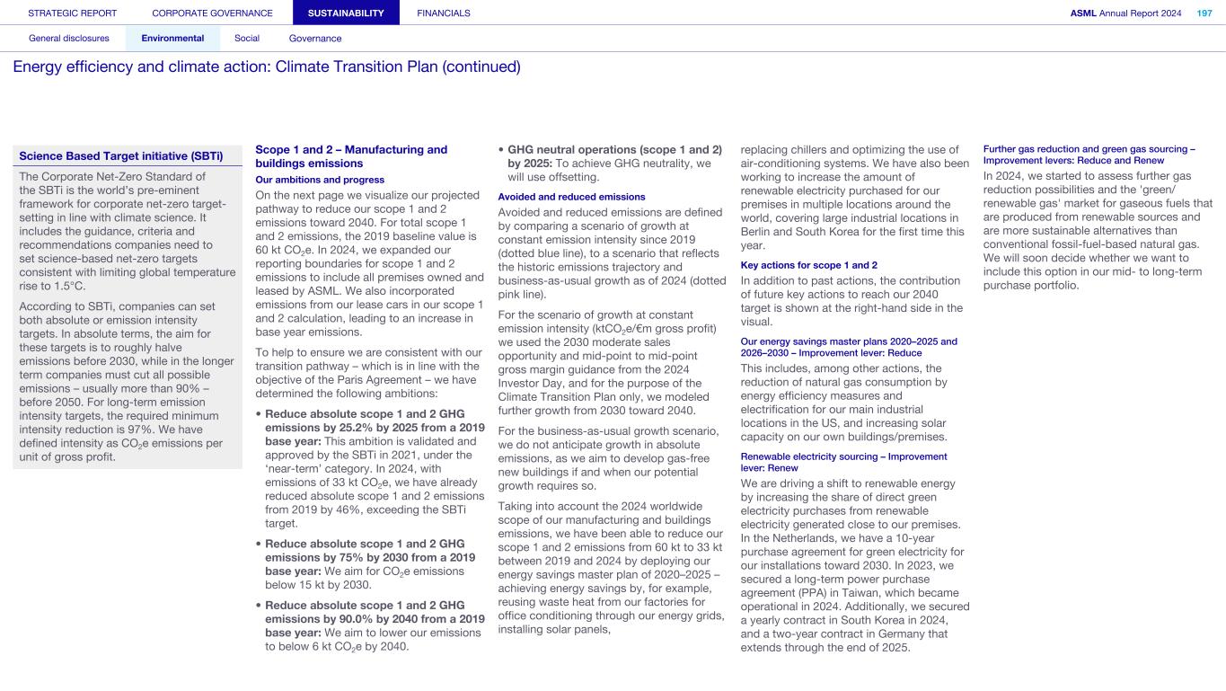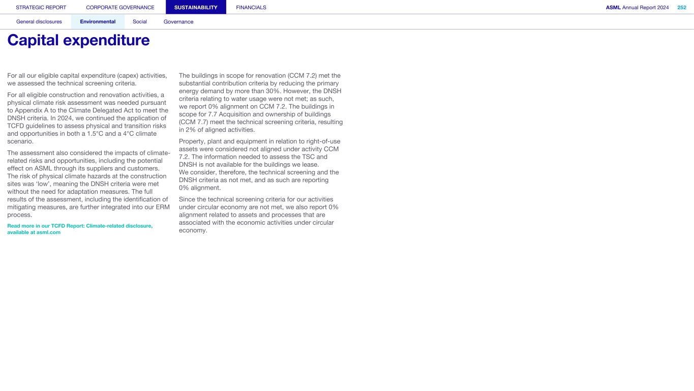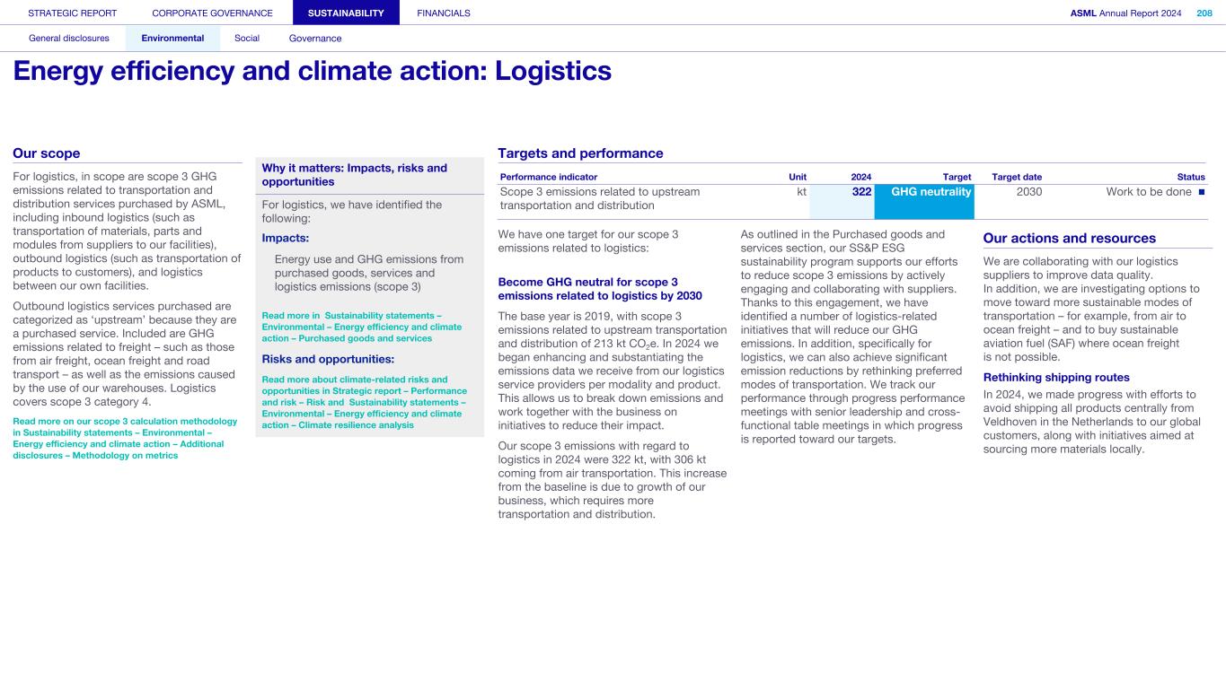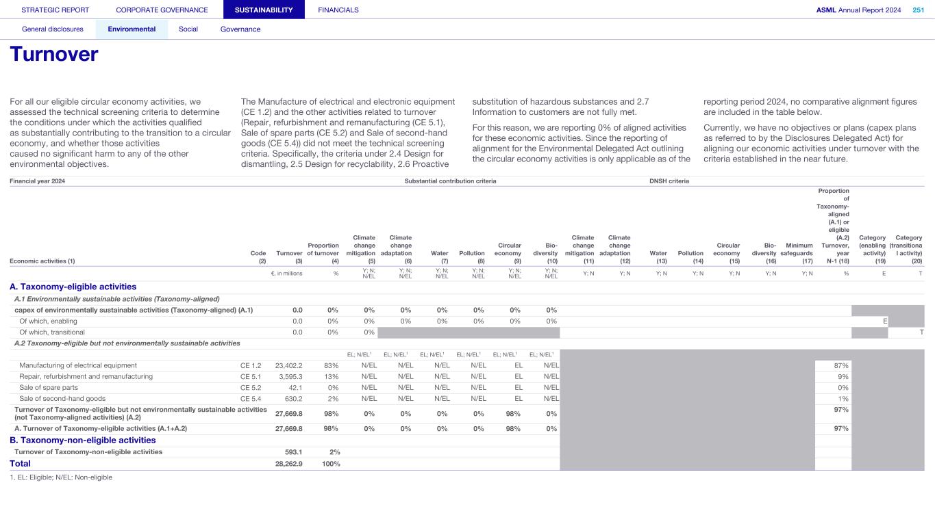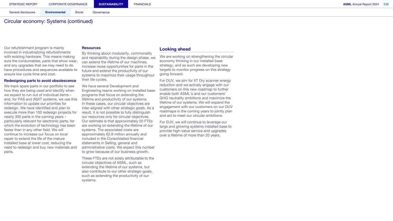 Powering technology forward 11 with customers 12 with our people 13 with suppliers 14 with partners 15 with local communities View our highlights online > Our 2024 online report highlights key information from this pdf with additional links to relevant information on our cor战略报告公司治理可持续发展财务ASML 2024年度报告3一览与CEO的问答2024故事我们的业务绩效风险公司行为内容1。战略报告4一览39我们的业务战略6与首席执行官的对话41我们的商业模式我们的业务44吸引了利益相关者17我们对光刻性能和风险的整体方法20我们的产品和服务51 CFO的信息27支持我们的客户54财务业绩28推动创新61风险33我们的市场77公司行为2。公司治理95公司治理120会议和出席情况97管理委员会125监事会委员会99监事会137财务报表和利润分配102其他董事会相关事项106年度股东大会和股本薪酬报告110财务报告和审计138薪酬委员会主席的信息112遵守公司治理要求140薪酬一览监事会报告142薪酬委员会114对我们监事会主席的采访145管理委员会薪酬161监事会薪酬116监事会2024年重点工作164其他信息165董事责任声明3。可持续发展声明一般披露190环境167编制基础191能源效率和气候行动169 ESG可持续发展治理231循环经济172 ESG可持续发展一览246欧盟分类法173我们的价值链概览255社会174影响、风险和机会管理256对所有人都有吸引力的工作场所284负责任的价值链181为联合国可持续发展目标作出贡献293创新生态系统182指标302我们社区中有价值的合作伙伴183参考表317治理318 ESG综合治理4。财务报表合并财务报表公司财务报表328合并损益表388公司资产负债表389公司损益表329合并综合收益表330合并财务状况表389公司财务报表附注331合并权益变动表395其他信息406其他附录333合并现金流量表410定义334合并财务报表附注本年度报告通篇使用的简称、技术术语和其他术语的定义或解释见定义部分。在某些情况下,为了方便读者,数字被四舍五入。本报告包含荷兰《金融市场监管法》(Wet op het Financieel Toezicht)第1:1和5:25c条含义内的受监管信息。包括欧盟分类法在内的战略报告、公司治理、监事会报告、董事责任声明和可持续发展声明等章节,共同构成荷兰民法典(以及相关法令)第2:391和2:391a节含义内的管理报告。在本报告中,有时会根据上下文可能需要,在提及阿斯麦 NV和/或其任何子公司的情况下,为方便起见使用“ASML”这一名称。本文件是欧洲单一电子报告格式(ESEF)的阿斯麦 NV 2024年年度报告的PDF/印刷版,为便于使用而编制。ESEF报告包可在公司网站https://www.asml.com上查阅。在此PDF版本与ESEF报告包之间存在任何差异的情况下,以后者为准。本年度报告中对我们网站和/或视频演示的引用仅供参考,其中没有任何或任何部分以引用方式并入本报告。©2024,阿斯麦 NV保留所有权利。
