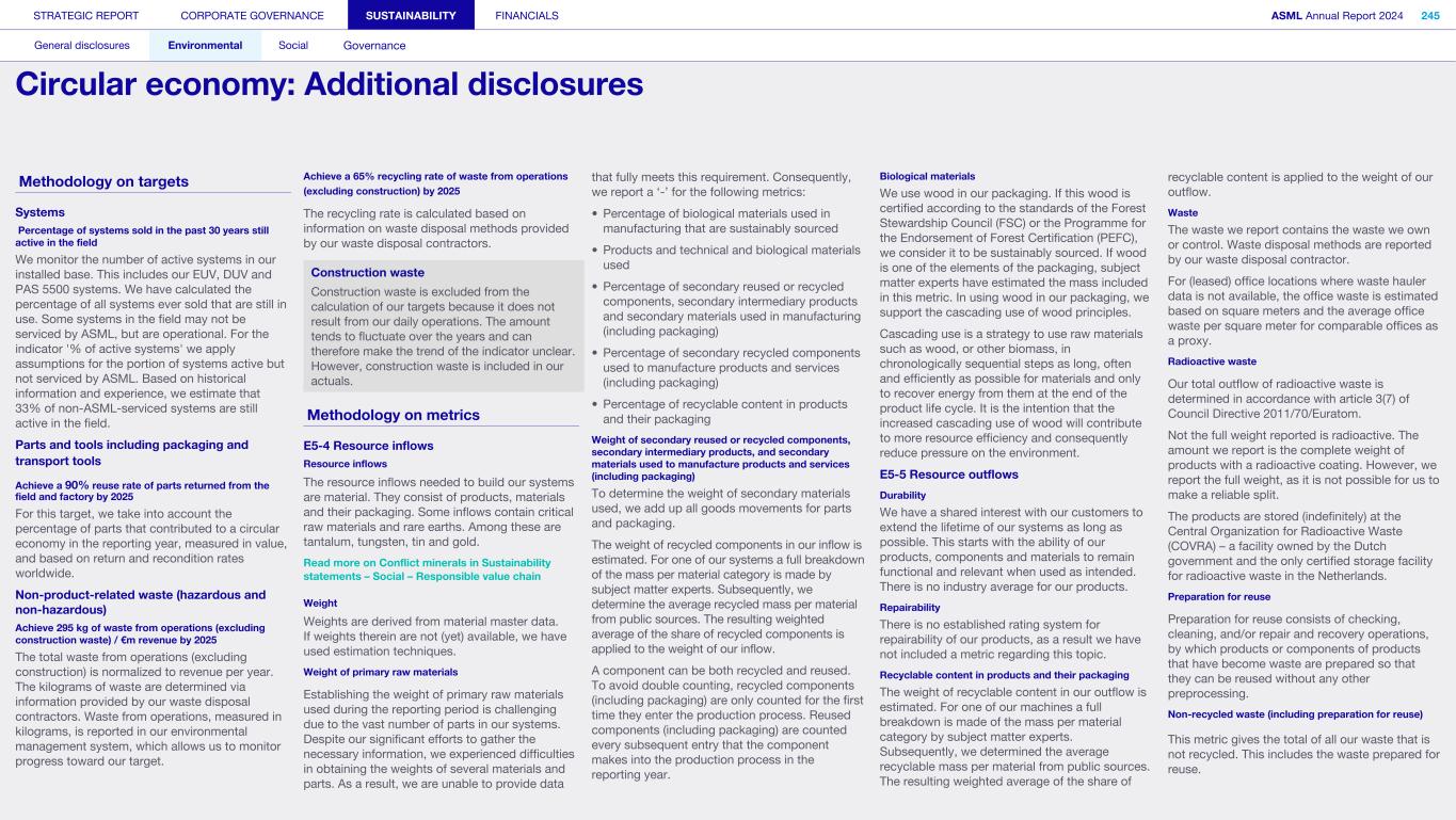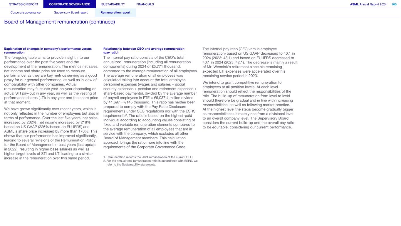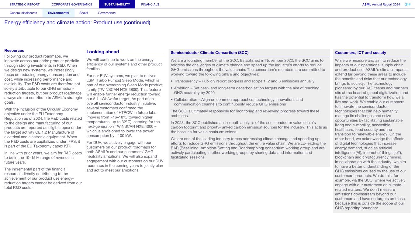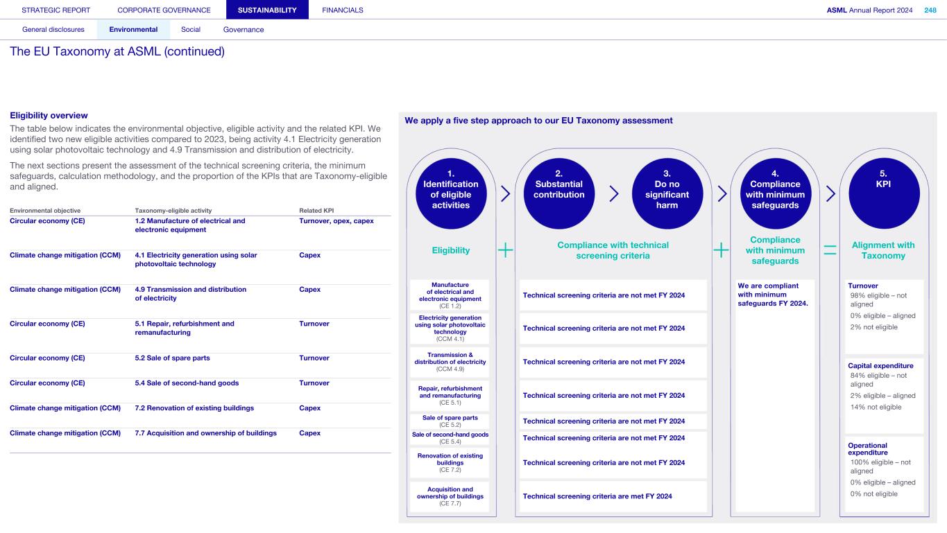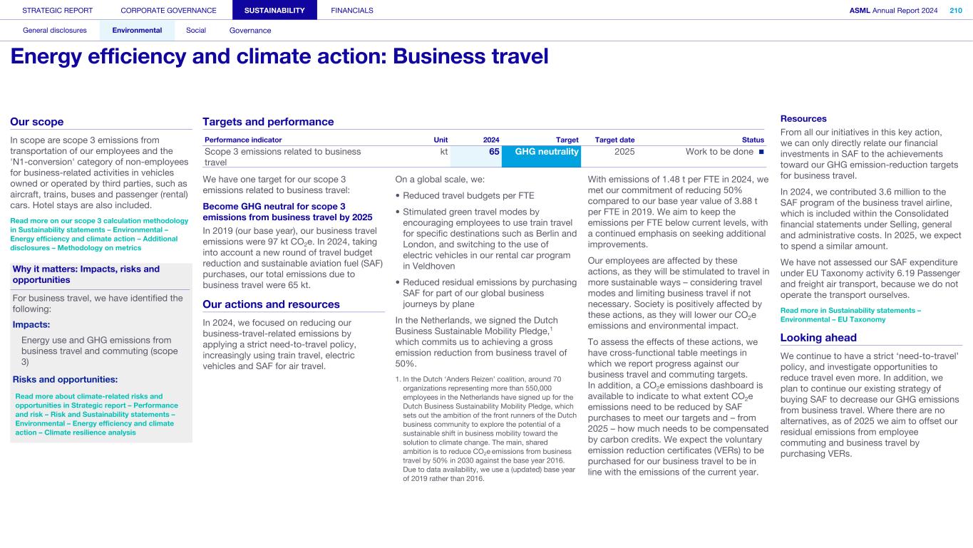 Powering technology forward 11 with customers 12 with our people 13 with suppliers 14 with partners 15 with local communities View our highlights online > Our 2024 online report highlights key information from this pdf with additional links to relevant information on our cor战略报告公司治理可持续发展财务ASML 2024年度报告3一览与CEO的问答2024故事我们的业务绩效风险公司行为内容1。战略报告4一览39我们的业务战略6与首席执行官的对话41我们的商业模式我们的业务44吸引了利益相关者17我们对光刻性能和风险的整体方法20我们的产品和服务51 CFO的信息27支持我们的客户54财务业绩28推动创新61风险33我们的市场77公司行为2。公司治理95公司治理120会议和出席情况97管理委员会125监事会委员会99监事会137财务报表和利润分配102其他董事会相关事项106年度股东大会和股本薪酬报告110财务报告和审计138薪酬委员会主席的信息112遵守公司治理要求140薪酬一览监事会报告142薪酬委员会114对我们监事会主席的采访145管理委员会薪酬161监事会薪酬116监事会2024年重点工作164其他信息165董事责任声明3。可持续发展声明一般披露190环境167编制基础191能源效率和气候行动169 ESG可持续发展治理231循环经济172 ESG可持续发展一览246欧盟分类法173我们的价值链概览255社会174影响、风险和机会管理256对所有人都有吸引力的工作场所284负责任的价值链181为联合国可持续发展目标作出贡献293创新生态系统182指标302我们社区中有价值的合作伙伴183参考表317治理318 ESG综合治理4。财务报表合并财务报表公司财务报表328合并损益表388公司资产负债表389公司损益表329合并综合收益表330合并财务状况表389公司财务报表附注331合并权益变动表395其他信息406其他附录333合并现金流量表410定义334合并财务报表附注本年度报告通篇使用的简称、技术术语和其他术语的定义或解释见定义部分。在某些情况下,为了方便读者,数字被四舍五入。本报告包含荷兰《金融市场监管法》(Wet op het Financieel Toezicht)第1:1和5:25c条含义内的受监管信息。包括欧盟分类法在内的战略报告、公司治理、监事会报告、董事责任声明和可持续发展声明等章节,共同构成荷兰民法典(以及相关法令)第2:391和2:391a节含义内的管理报告。在本报告中,有时会根据上下文可能需要,在提及阿斯麦 NV和/或其任何子公司的情况下,为方便起见使用“ASML”这一名称。本文件是欧洲单一电子报告格式(ESEF)的阿斯麦 NV 2024年年度报告的PDF/印刷版,为便于使用而编制。ESEF报告包可在公司网站https://www.asml.com上查阅。在此PDF版本与ESEF报告包之间存在任何差异的情况下,以后者为准。本年度报告中对我们网站和/或视频演示的引用仅供参考,其中没有任何或任何部分以引用方式并入本报告。©2024,阿斯麦 NV保留所有权利。