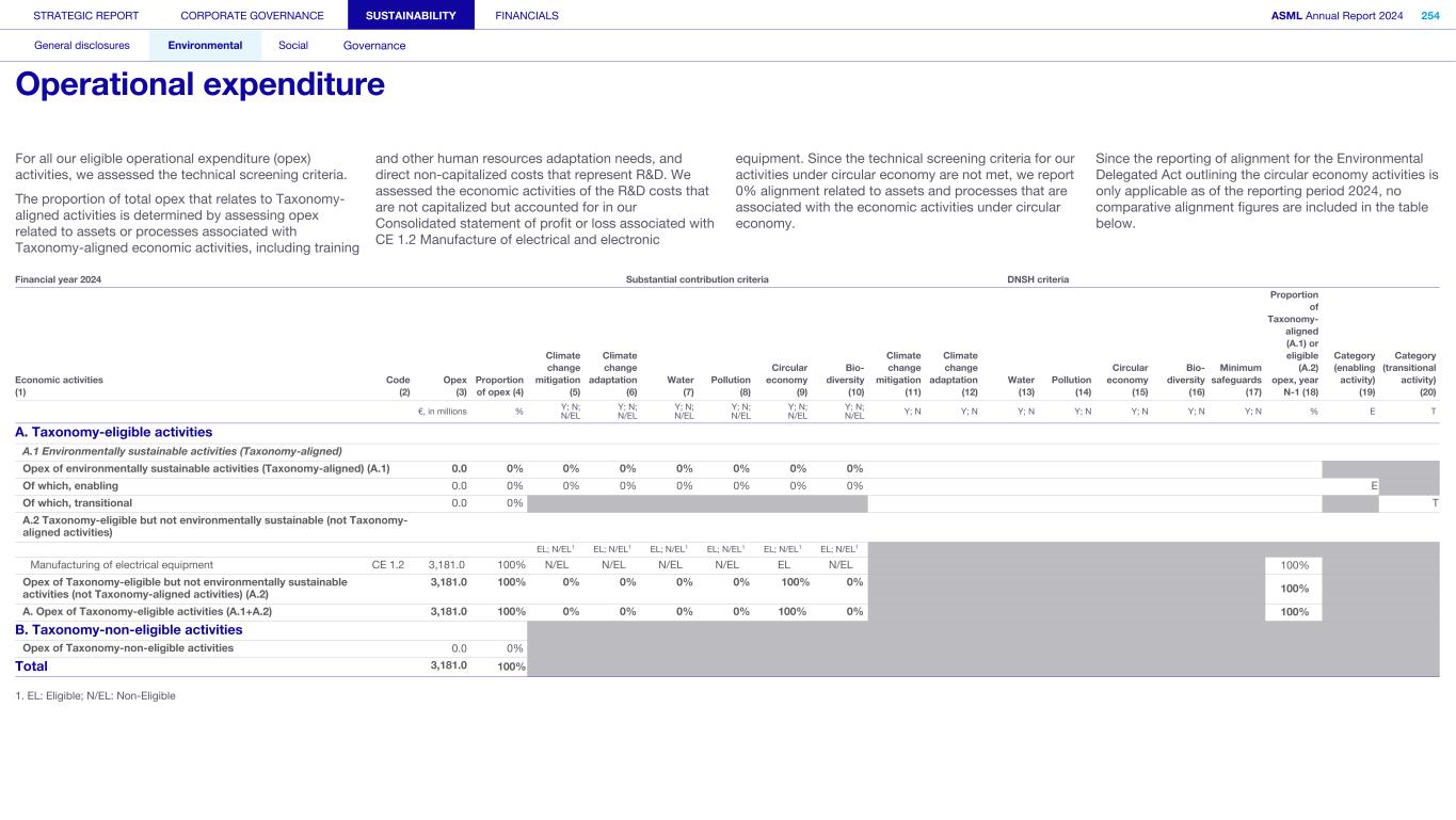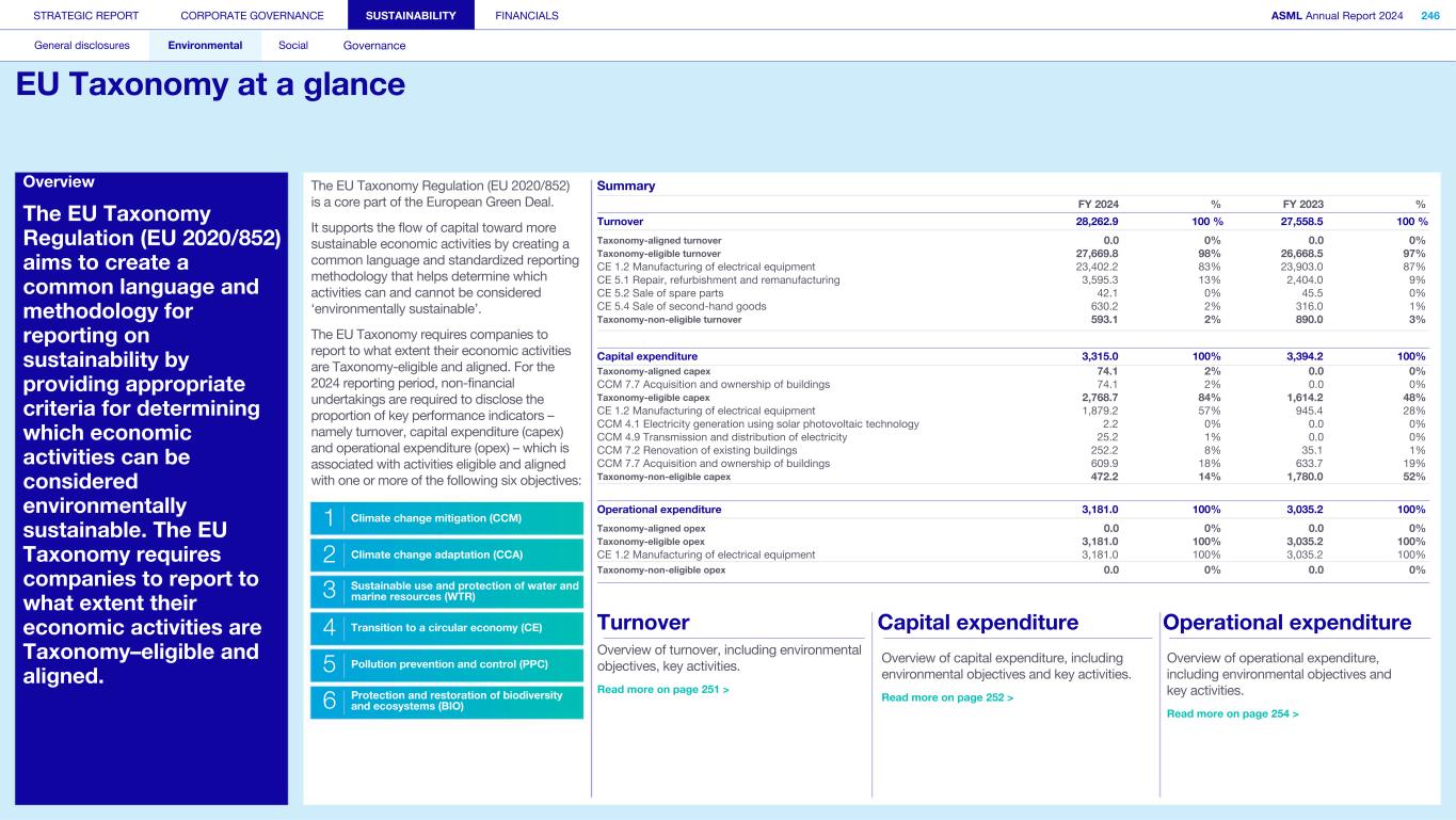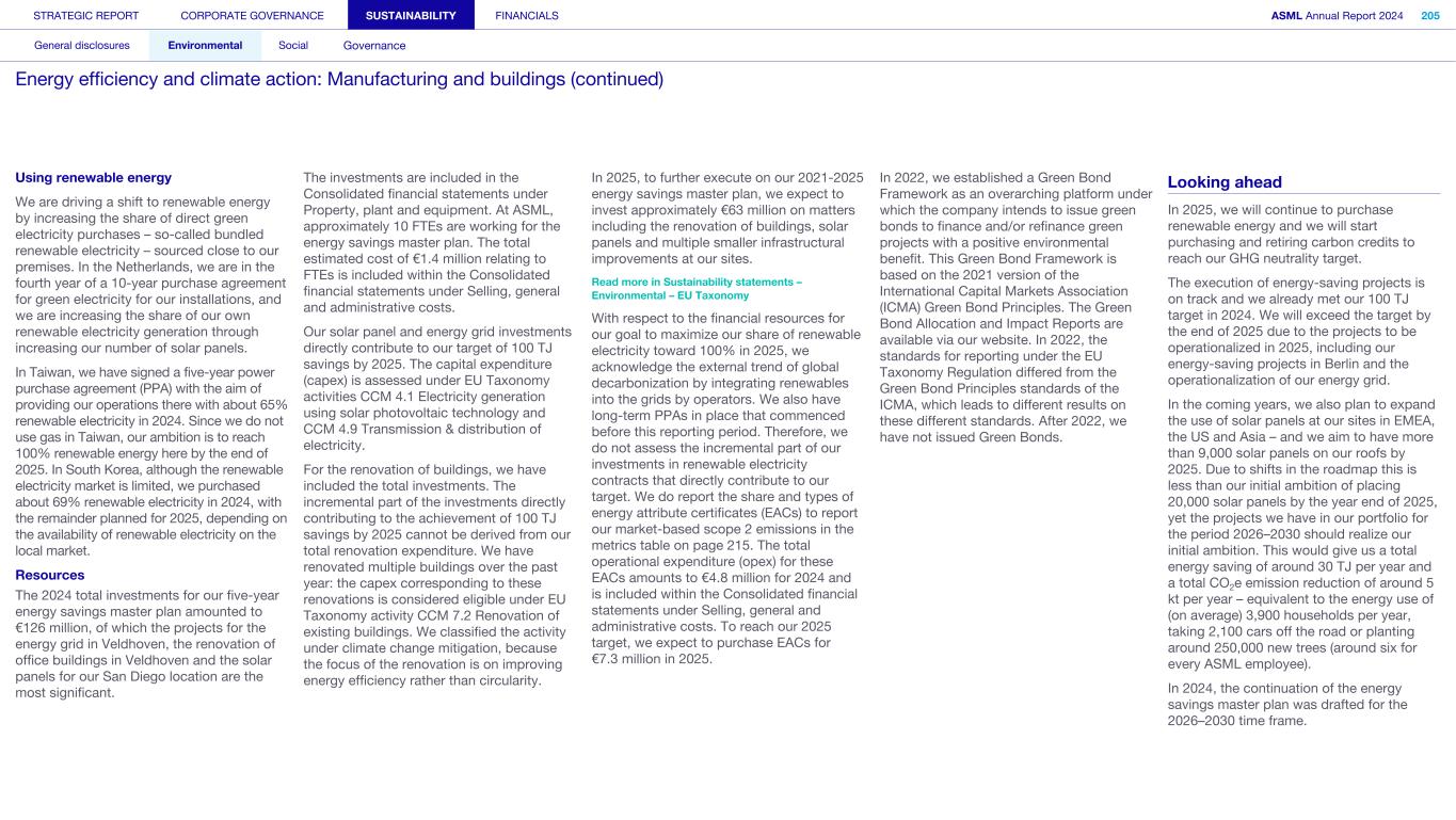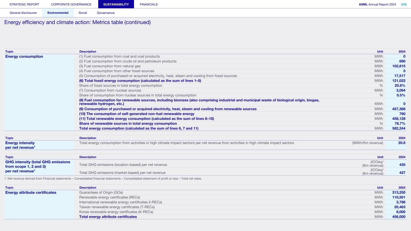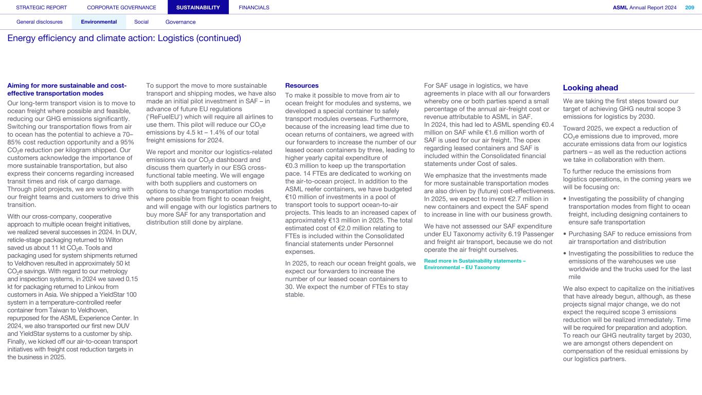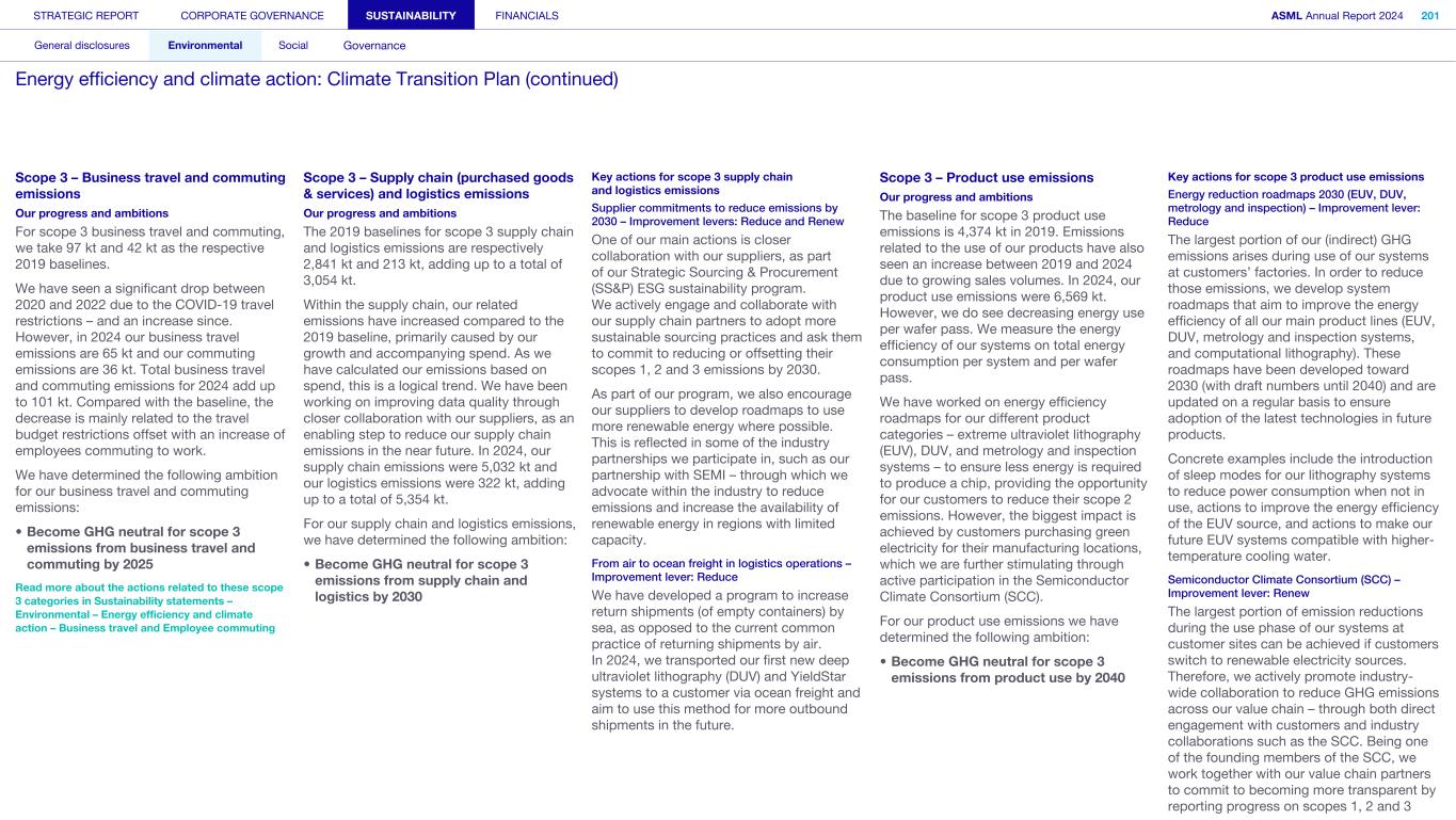 Powering technology forward 11 with customers 12 with our people 13 with suppliers 14 with partners 15 with local communities View our highlights online > Our 2024 online report highlights key information from this pdf with additional links to relevant information on our cor战略报告公司治理可持续发展财务ASML 2024年度报告3一览与CEO的问答2024故事我们的业务绩效风险公司行为内容1。战略报告4一览39我们的业务战略6与首席执行官的对话41我们的商业模式我们的业务44吸引了利益相关者17我们对光刻性能和风险的整体方法20我们的产品和服务51 CFO的信息27支持我们的客户54财务业绩28推动创新61风险33我们的市场77公司行为2。公司治理95公司治理120会议和出席情况97管理委员会125监事会委员会99监事会137财务报表和利润分配102其他董事会相关事项106年度股东大会和股本薪酬报告110财务报告和审计138薪酬委员会主席的信息112遵守公司治理要求140薪酬一览监事会报告142薪酬委员会114对我们监事会主席的采访145管理委员会薪酬161监事会薪酬116监事会2024年重点工作164其他信息165董事责任声明3。可持续发展声明一般披露190环境167编制基础191能源效率和气候行动169 ESG可持续发展治理231循环经济172 ESG可持续发展一览246欧盟分类法173我们的价值链概览255社会174影响、风险和机会管理256对所有人都有吸引力的工作场所284负责任的价值链181为联合国可持续发展目标作出贡献293创新生态系统182指标302我们社区中有价值的合作伙伴183参考表317治理318 ESG综合治理4。财务报表合并财务报表公司财务报表328合并损益表388公司资产负债表389公司损益表329合并综合收益表330合并财务状况表389公司财务报表附注331合并权益变动表395其他信息406其他附录333合并现金流量表410定义334合并财务报表附注本年度报告通篇使用的简称、技术术语和其他术语的定义或解释见定义部分。在某些情况下,为了方便读者,数字被四舍五入。本报告包含荷兰《金融市场监管法》(Wet op het Financieel Toezicht)第1:1和5:25c条含义内的受监管信息。包括欧盟分类法在内的战略报告、公司治理、监事会报告、董事责任声明和可持续发展声明等章节,共同构成荷兰民法典(以及相关法令)第2:391和2:391a节含义内的管理报告。在本报告中,有时会根据上下文可能需要,在提及阿斯麦 NV和/或其任何子公司的情况下,为方便起见使用“ASML”这一名称。本文件是欧洲单一电子报告格式(ESEF)的阿斯麦 NV 2024年年度报告的PDF/印刷版,为便于使用而编制。ESEF报告包可在公司网站https://www.asml.com上查阅。在此PDF版本与ESEF报告包之间存在任何差异的情况下,以后者为准。本年度报告中对我们网站和/或视频演示的引用仅供参考,其中没有任何或任何部分以引用方式并入本报告。©2024,阿斯麦 NV保留所有权利。