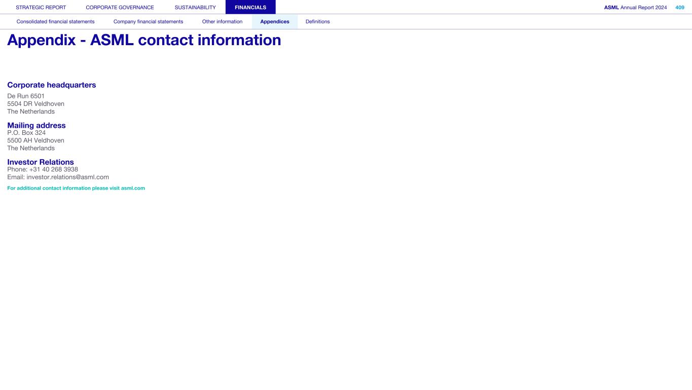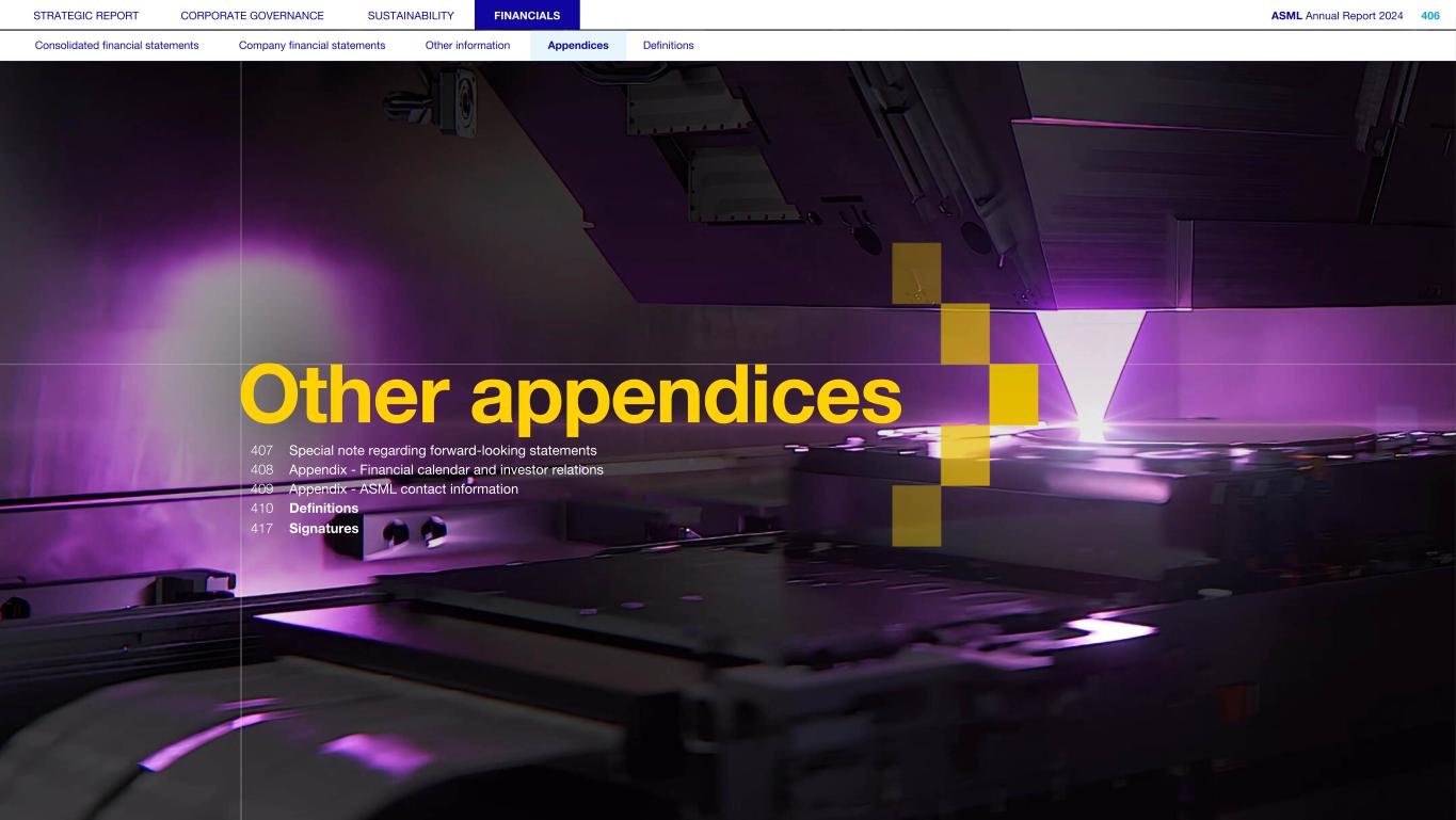 x战略报告公司治理可持续发展财务ASML年度报告2024406合并财务报表公司财务报表其他信息附录定义其他附录407关于前瞻性陈述的特别说明408附录-财务日历和投资者关系409附录-ASML联系方式410定义417签名