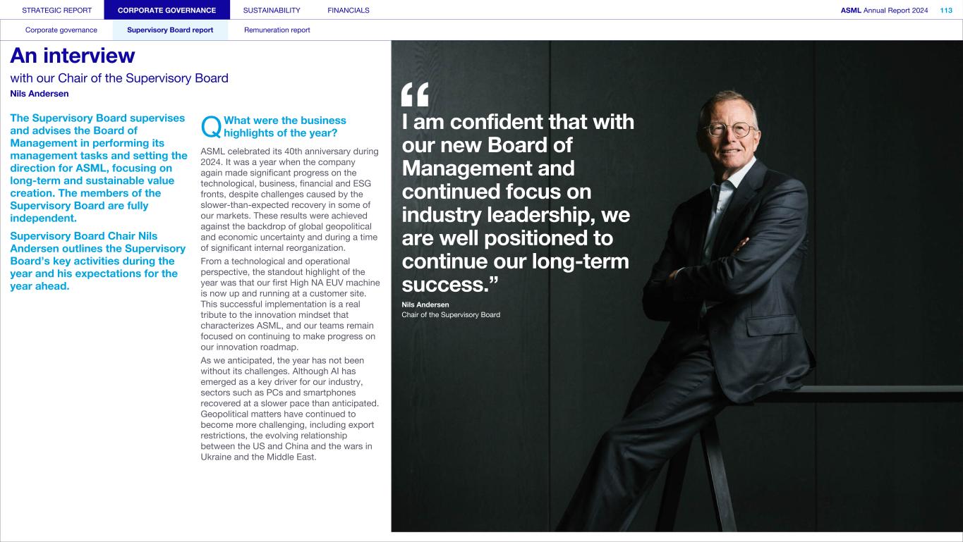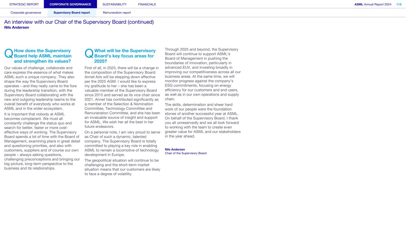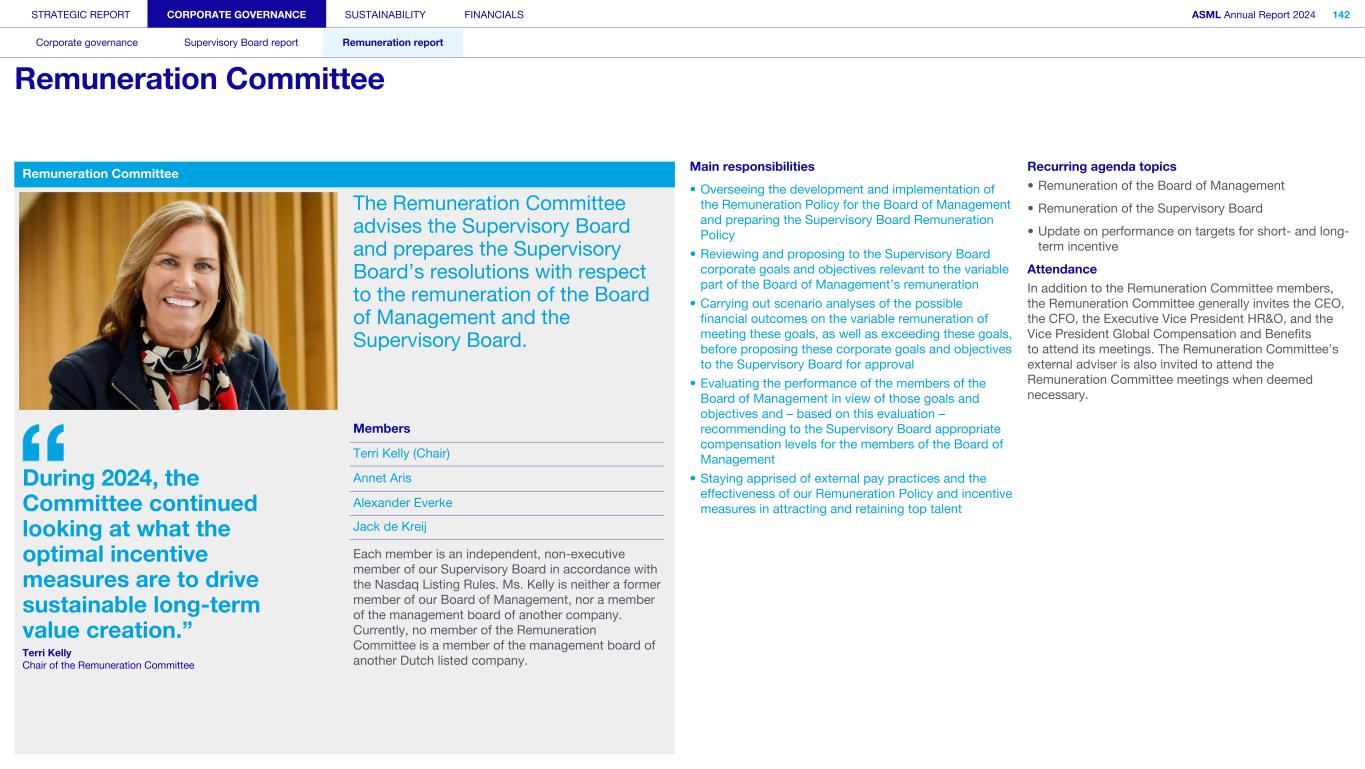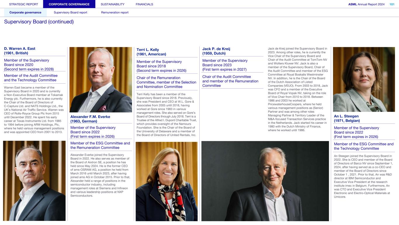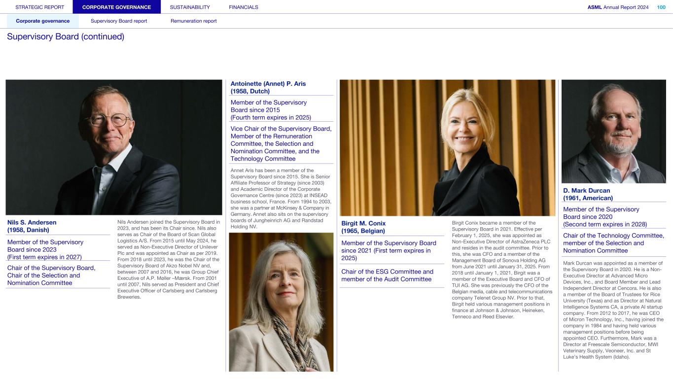 战略报告公司治理可持续发展财务ASML年度报告2024100公司治理监事会报告薪酬报告监事会(续)Nils S. Andersen(1958,丹麦语)Nils Andersen于2023年加入监事会,并自那时起担任主席。Nils还担任Scan Global Logistics A/S的董事会主席。从2015年到2024年5月,他担任联合利华 PLC的非执行董事,并于2019年被任命为主席。从2018年到2023年,他担任Akzo Nobel NV监事会主席,并在2007年至2016年期间担任A.P. M ø ller – M æ rsk的集团首席执行官。从2001年到2007年,尼尔斯担任嘉士伯和嘉士伯啤酒厂的总裁兼首席执行官。自2023年起担任监事会成员(第一任期于2027年届满)监事会主席、遴选和提名委员会主席Antoinette(Annet)P. Aris(1958,荷兰语)自2015年起担任监事会成员(第四任期于2025年届满)监事会副主席、薪酬委员会、遴选和提名委员会、技术委员会成员Annet Aris自2015年起担任监事会成员。她是法国INSEAD商学院战略学高级附属教授(自2003年起)和公司治理中心学术主任(自2023年起)。从1994年到2003年,她是德国麦肯锡公司的合伙人。Annet也是Jungheinrich AG和Randstad Holding NV的监事会成员。Birgit M. Conix(1965,比利时)Birgit Conix于2021年成为监事会成员。自2025年2月1日起生效,她被任命为阿斯利康 PLC的非执行董事,并在审计委员会任职。在此之前,她于2021年6月至2025年1月31日期间担任Sonova Holding AG的首席财务官和管理委员会成员。从2018年到2021年1月1日,Birgit是TUI AG的执行董事会成员和首席财务官。她之前是比利时媒体、有线电视和电信公司Telenet Group NV的首席财务官。在此之前,Birgit曾在强生、喜力、天纳克和Reed Elsevier担任多个财务管理职位。自2021年起担任监事会成员(第一任期于2025年届满)ESG委员会主席兼审计委员会成员D. Mark Durcan(1961,美籍)自2020年起担任监事会成员(第二任期于2028年届满)2020年起担任技术委员会主席、遴选和提名委员会成员丨马克·杜尔坎Mark Durcan于2020年被任命为监事会成员。他是超威半导体设备股份有限公司的非执行董事,以及Cencora的董事会成员和首席独立董事。他还是莱斯大学(德克萨斯州)董事会成员,以及私营人工智能创业公司Natural Intelligence Systems 加利福尼亚州的董事。2012年至2017年,他担任美光科技公司的首席执行官,于1984年加入公司,在被任命为首席执行官之前曾担任多个管理职位。此外,Mark还曾担任飞思卡尔、MWI动物医疗供应、TERM1Veterinary Supply、Veoneer,Inc.和ST Luke’s Health System(Idaho)的董事。