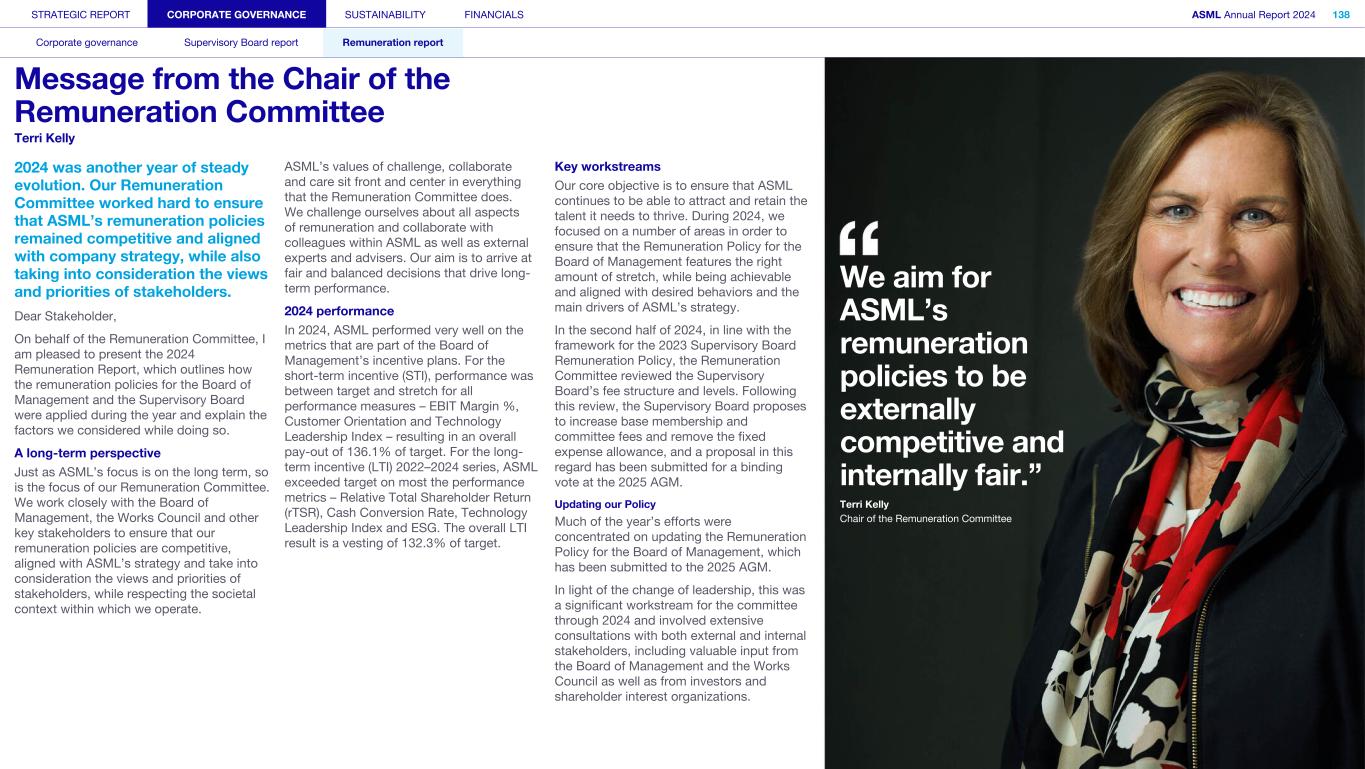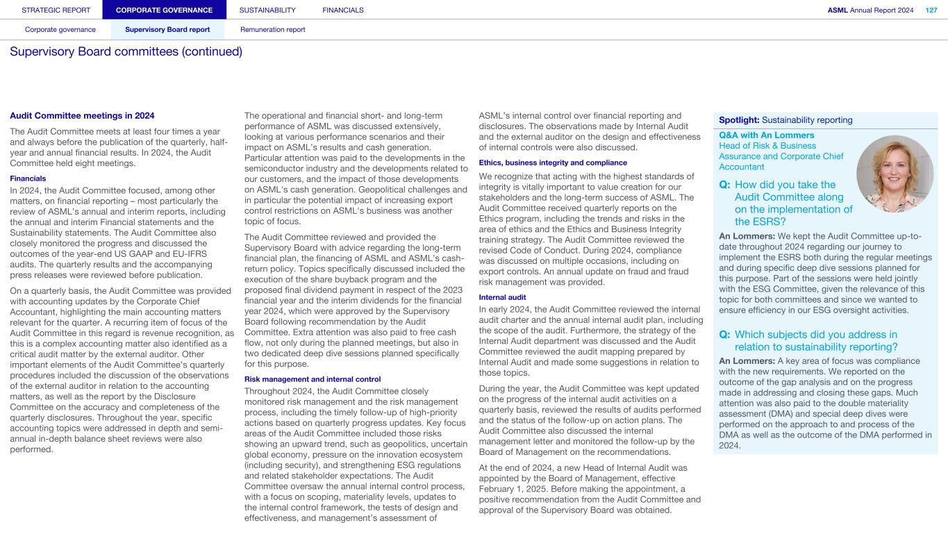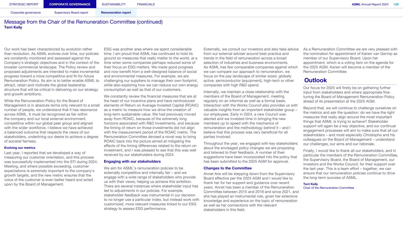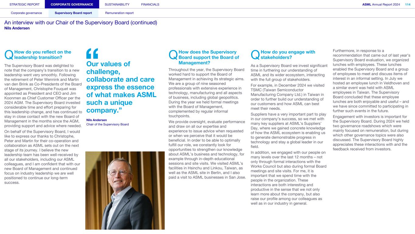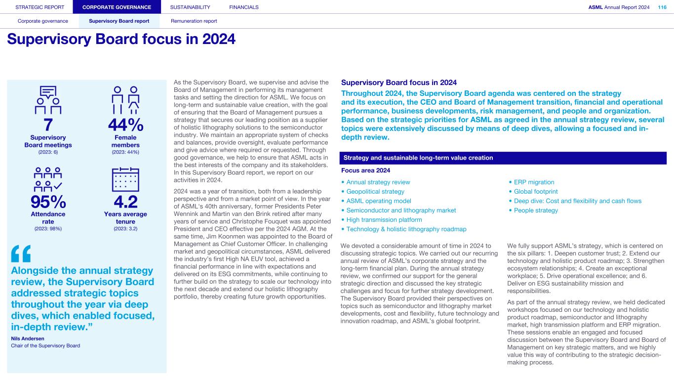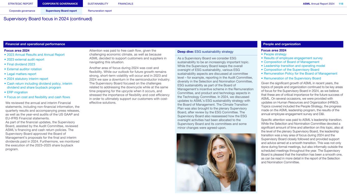 战略报告公司治理可持续发展财务ASML年度报告2024100公司治理监事会报告薪酬报告监事会(续)Nils S. Andersen(1958,丹麦语)Nils Andersen于2023年加入监事会,并自那时起担任主席。Nils还担任Scan Global Logistics A/S的董事会主席。从2015年到2024年5月,他担任联合利华 PLC的非执行董事,并于2019年被任命为主席。从2018年到2023年,他担任Akzo Nobel NV监事会主席,并在2007年至2016年期间担任A.P. M ø ller – M æ rsk的集团首席执行官。从2001年到2007年,尼尔斯担任嘉士伯和嘉士伯啤酒厂的总裁兼首席执行官。自2023年起担任监事会成员(第一任期于2027年届满)监事会主席、遴选和提名委员会主席Antoinette(Annet)P. Aris(1958,荷兰语)自2015年起担任监事会成员(第四任期于2025年届满)监事会副主席、薪酬委员会、遴选和提名委员会、技术委员会成员Annet Aris自2015年起担任监事会成员。她是法国INSEAD商学院战略学高级附属教授(自2003年起)和公司治理中心学术主任(自2023年起)。从1994年到2003年,她是德国麦肯锡公司的合伙人。Annet也是Jungheinrich AG和Randstad Holding NV的监事会成员。Birgit M. Conix(1965,比利时)Birgit Conix于2021年成为监事会成员。自2025年2月1日起生效,她被任命为阿斯利康 PLC的非执行董事,并在审计委员会任职。在此之前,她于2021年6月至2025年1月31日期间担任Sonova Holding AG的首席财务官和管理委员会成员。从2018年到2021年1月1日,Birgit是TUI AG的执行董事会成员和首席财务官。她之前是比利时媒体、有线电视和电信公司Telenet Group NV的首席财务官。在此之前,Birgit曾在强生、喜力、天纳克和Reed Elsevier担任多个财务管理职位。自2021年起担任监事会成员(第一任期于2025年届满)ESG委员会主席兼审计委员会成员D. Mark Durcan(1961,美籍)自2020年起担任监事会成员(第二任期于2028年届满)2020年起担任技术委员会主席、遴选和提名委员会成员丨马克·杜尔坎Mark Durcan于2020年被任命为监事会成员。他是超威半导体设备股份有限公司的非执行董事,以及Cencora的董事会成员和首席独立董事。他还是莱斯大学(德克萨斯州)董事会成员,以及私营人工智能创业公司Natural Intelligence Systems 加利福尼亚州的董事。2012年至2017年,他担任美光科技公司的首席执行官,于1984年加入公司,在被任命为首席执行官之前曾担任多个管理职位。此外,Mark还曾担任飞思卡尔、MWI动物医疗供应、TERM1Veterinary Supply、Veoneer,Inc.和ST Luke’s Health System(Idaho)的董事。