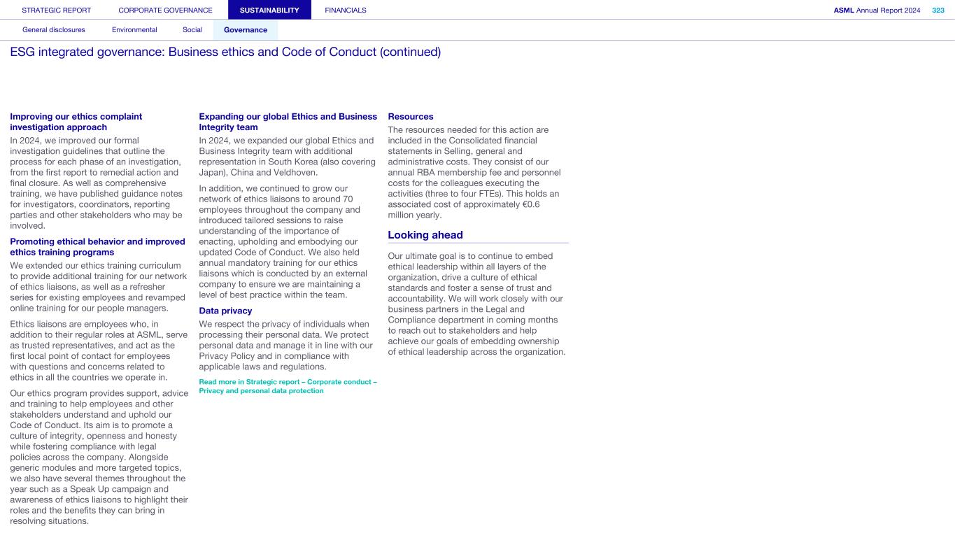 改进我们的道德投诉调查方法在2024年,我们改进了我们的正式调查指南,该指南概述了调查的每个阶段的过程,从第一次报告到补救行动和最终结束。除了全面的培训,我们还为调查人员、协调员、报告方和其他可能参与的利益相关者发布了指导说明。促进道德行为和改进道德培训计划我们扩展了道德培训课程,为我们的道德联络员网络提供额外培训,以及为现有员工提供的复习系列,并为我们的人事经理改进了在线培训。道德联络员是指除了在ASML担任常规角色外,还作为值得信赖的代表的员工,并在我们经营所在的所有国家/地区担任员工有关道德操守的问题和疑虑的第一当地联络点。我们的道德操守计划提供支持、建议和培训,以帮助员工和其他利益相关者理解和维护我们的行为准则。其目标是在全公司范围内促进遵守法律政策的同时,促进诚信、开放和诚实的文化。除了通用模块和更有针对性的主题外,我们全年还有几个主题,例如畅所欲言的活动和道德联络员意识,以突出他们的作用以及他们在解决情况时可以带来的好处。在2024年扩大了我们的全球道德和商业诚信团队,我们扩大了我们的全球道德和商业诚信团队,在韩国(也包括日本)、中国和Veldhoven增加了代表。此外,我们继续将道德联络员网络扩大到全公司约70名员工,并引入了量身定制的会议,以提高人们对制定、维护和体现我们更新的行为准则的重要性的理解。我们还为我们的道德联络员举办了年度强制性培训,该培训由外部公司进行,以确保我们在团队中保持最佳实践水平。数据隐私我们在处理个人数据时尊重个人隐私。我们保护个人数据,并根据我们的隐私政策和适用的法律法规对其进行管理。在战略报告–企业行为–隐私和个人数据保护资源中阅读更多信息这一行动所需的资源包含在合并财务报表的销售、一般和管理成本中。它们包括我们每年的澳洲联储会员费和执行活动的同事的人事费用(三到四个FTE)。这每年产生的相关成本约为60万欧元。展望未来我们的最终目标是继续将道德领导力嵌入组织的各个层面,推动道德标准文化,并培养信任感和责任感。在接下来的几个月里,我们将与法律和合规部门的业务合作伙伴密切合作,以接触利益相关者,并帮助实现我们在整个组织中嵌入道德领导所有权的目标。战略报告公司治理可持续发展金融公司ASML年度报告2024323一般披露环境社会治理ESG一体化治理:商业道德和行为准则(续)