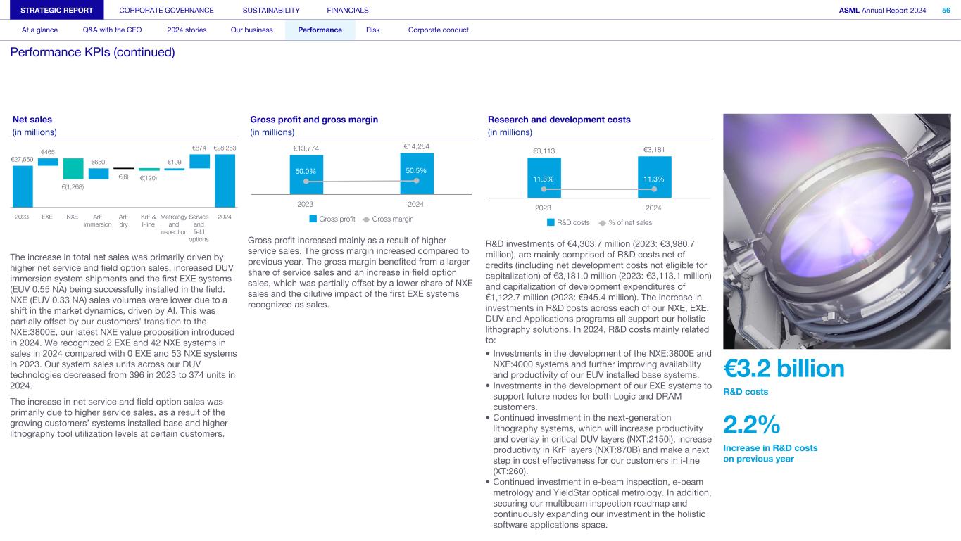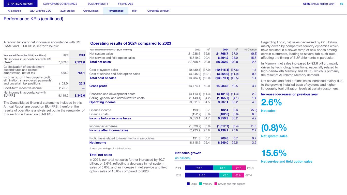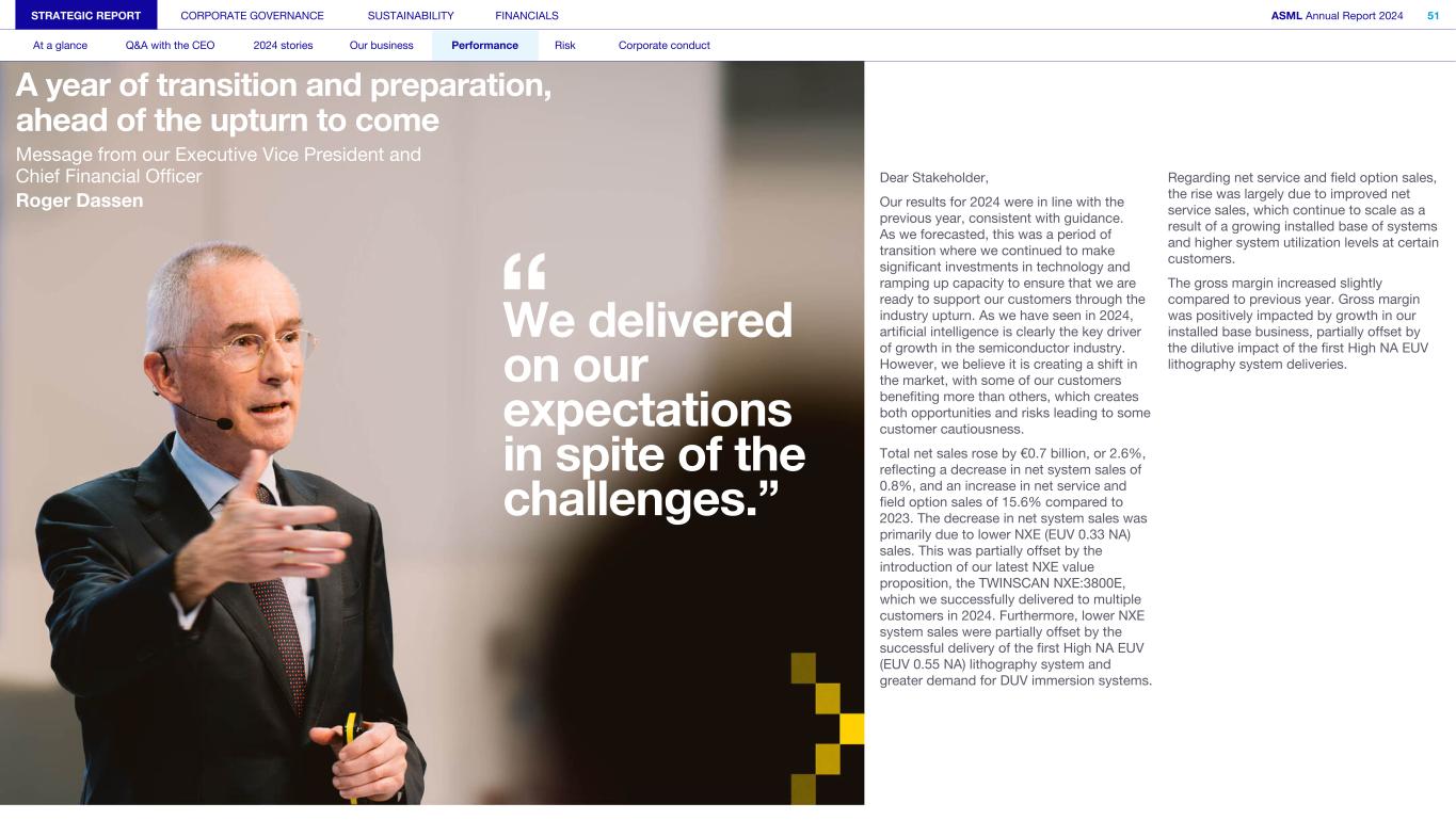 尊敬的利益相关者,我们2024年的结果与上一年一致,与指导一致。正如我们预测的那样,这是一个过渡时期,我们继续在技术和提高产能方面进行重大投资,以确保我们准备好支持我们的客户度过行业好转。正如我们在2024年看到的那样,人工智能显然是半导体行业增长的关键驱动力。然而,我们认为它正在创造市场的转变,我们的一些客户比其他客户受益更多,这既创造了机会,也带来了风险,导致了一些客户的谨慎。总净销售额增长了7亿欧元,即2.6%,反映出系统净销售额下降了0.8%,与2023年相比,服务和现场期权净销售额增长了15.6%。系统净销售额下降主要是由于NXE(EUV0.33NA)销售额下降。这部分被我们推出的最新NXE价值主张TWINSCAN NXE:3800E所抵消,我们于2024年成功地向多个客户交付了该产品。此外,较低的NXE系统销售额被首个高NAEUV(EUV0.55NA)光刻系统的成功交付以及对DUV浸没系统的更大需求部分抵消。关于净服务和现场期权销售,增长主要是由于净服务销售有所改善,由于系统安装基数不断增加和某些客户的系统利用率水平提高,净服务销售继续扩大。毛利率较上年略有提升。毛利率受到我们安装基础业务增长的积极影响,部分被首批High NA EUV光刻系统交付的稀释影响所抵消。战略报告公司治理可持续发展财务部ASML年度报告202451与首席执行官的问答一目了然2024年的故事我们的业务绩效风险公司进行了一年的过渡和准备,领先于未来的好转我们执行副总裁兼首席财务官 Roger Dassen的信息尽管面临挑战,我们仍实现了我们的期望。”