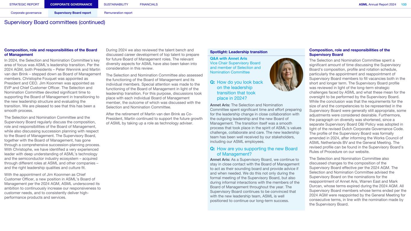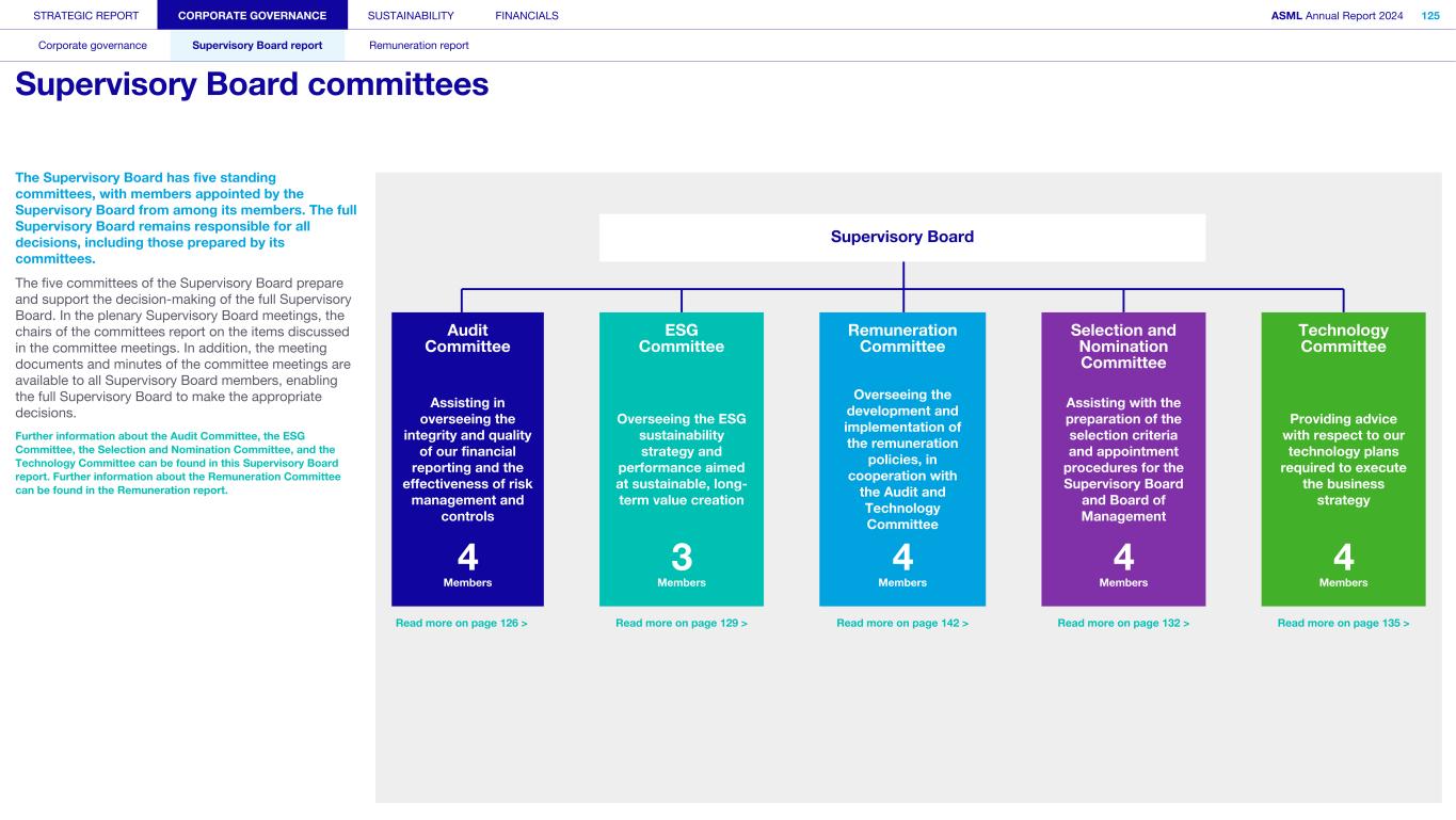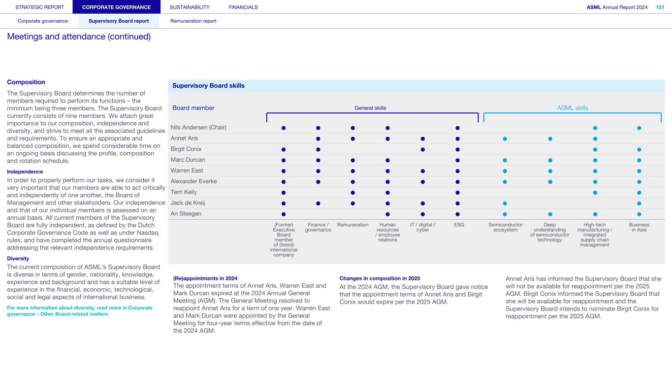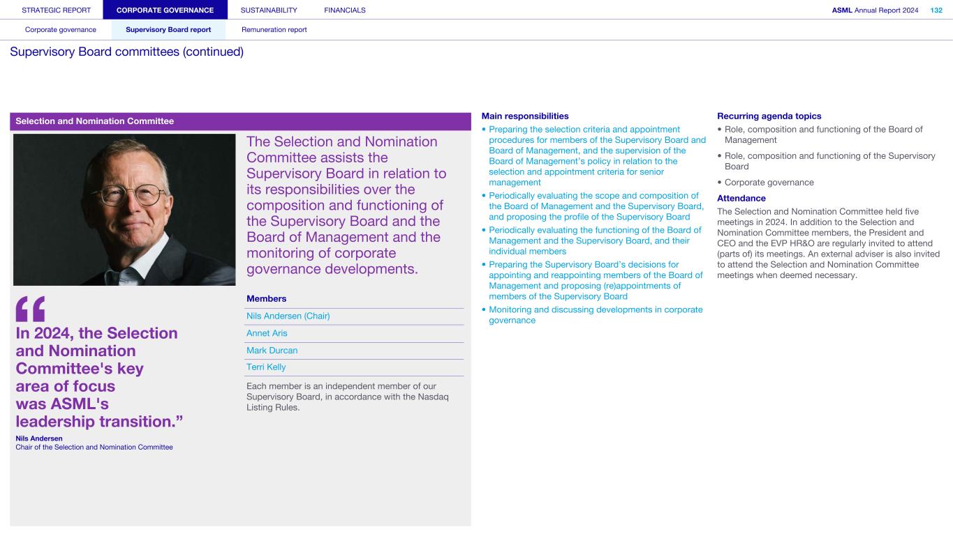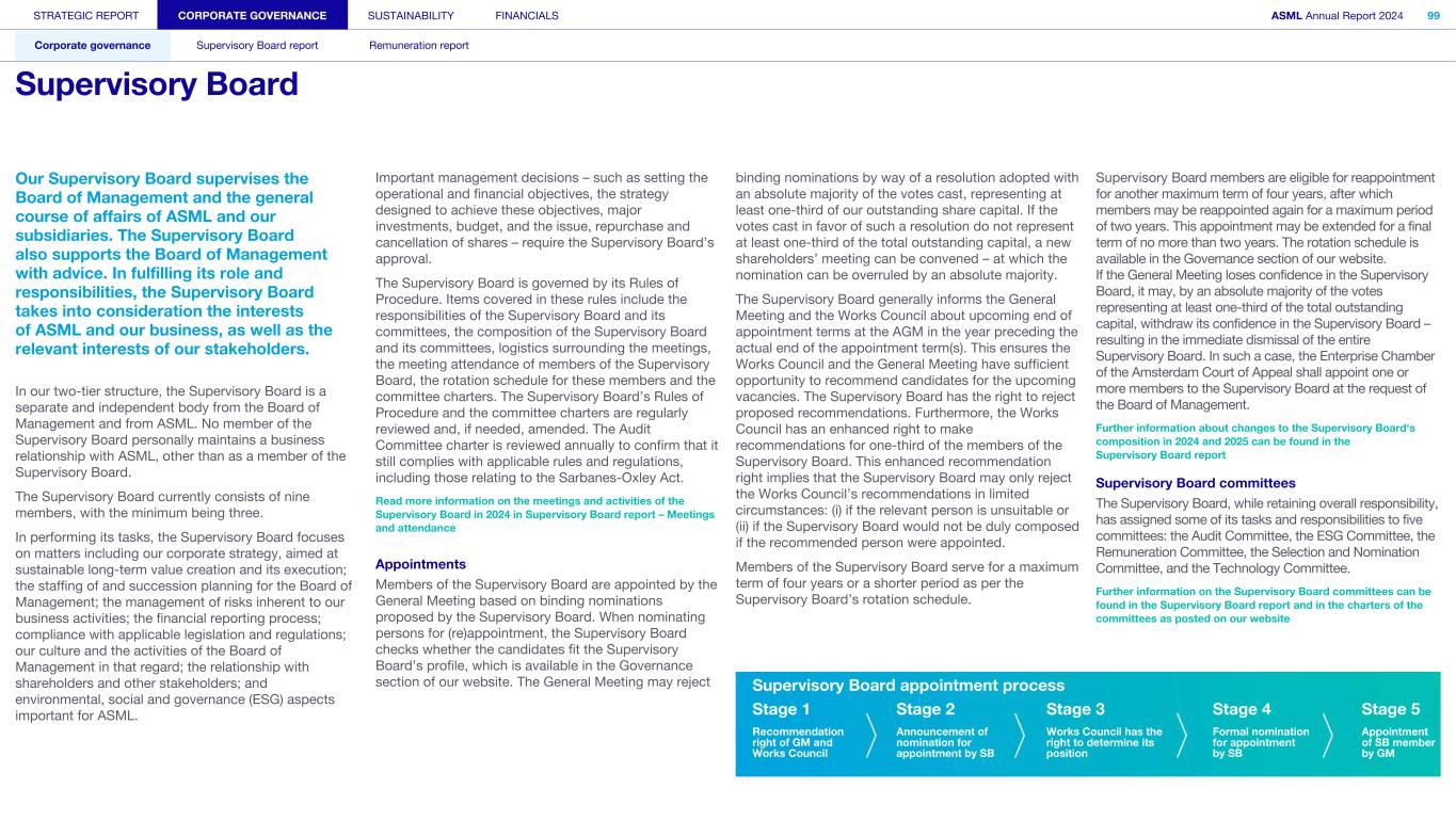 我们的监事会监督管理委员会以及ASML和我们子公司的一般事务过程。监事会还通过建议支持管理委员会。监事会在履行其作用和责任时,会考虑到ASML和我们业务的利益,以及我们利益相关者的相关利益。在我们的双层结构中,监事会是一个独立于管理委员会和ASML的独立机构。除作为监事会成员外,监事会成员均未亲自与ASML保持业务关系。监事会目前由九名成员组成,最少三名。在执行任务时,监事会关注的事项包括:我们的公司战略,旨在实现可持续的长期价值创造及其执行;管理委员会的人员配备和继任规划;管理我们业务活动固有风险的管理;财务报告流程;遵守适用的立法和法规;我们的文化和管理委员会在这方面的活动;与股东和其他利益相关者的关系;以及对ASML重要的环境、社会和治理(ESG)方面。重要的管理决策——例如设定运营和财务目标、为实现这些目标而设计的战略、重大投资、预算,以及发行、回购和注销股份——需要监事会的批准。监事会受其议事规则管辖。这些规则所涵盖的项目包括监事会及其委员会的职责、监事会及其委员会的组成、围绕会议的后勤工作、监事会成员的会议出席情况、这些成员的轮换时间表和委员会章程。监督委员会的议事规则和委员会章程定期审查,并在必要时进行修订。审计委员会章程每年进行审查,以确认其仍遵守适用的规则和条例,包括与《萨班斯-奥克斯利法案》有关的规则和条例。在监事会报告中阅读更多关于2024年监事会会议和活动的信息–会议和出席任命监事会成员由大会根据监事会提出的具有约束力的提名任命。在提名(重新)任命人员时,监事会会检查候选人是否符合监事会的概况,我们网站的治理部分提供了这一信息。股东大会可通过以绝对多数票通过的决议否决具有约束力的提名,该决议至少代表我们已发行股本的三分之一。如果赞成这样一项决议的票数至少不占未偿资本总额的三分之一,则可以召开新的股东大会——在该会议上可以以绝对多数否决提名。监事会一般会在任期实际结束前一年的年度股东大会上通知股东大会和劳资委员会即将结束的任期。这确保了工委会和大会有足够的机会为即将出现的空缺推荐候选人。监事会有权拒绝提议的建议。此外,劳资委员会有更大的权利为监事会三分之一的成员提出建议。这种增强的推荐权意味着,监事会只能在有限的情况下拒绝劳资委员会的建议:(i)如果相关人员不合适,或(ii)如果被推荐的人被任命,监事会将不会适当组成。监事会成员的任期最长为四年或根据监事会的轮换时间表更短。监事会委任程序第1阶段第2阶段第3阶段第4阶段第5阶段GM和劳资委员会的推荐权SB劳资委员会委任提名公告有权决定其职位SB委任SB成员的正式提名GM监事会成员有资格再获委任,最长任期四年,之后成员可再次获委任,最长任期两年。这一任命可以延长,最后任期不超过两年。轮调时间表可在我们网站的治理部分查阅。股东大会对监事会失去信任的,可以至少代表未偿资本总额三分之一的绝对多数票, 收回对监事会的信任——导致整个监事会立即被解职。在这种情况下,阿姆斯特丹上诉法院企业商会应应管理委员会的请求任命一名或多名监事会成员。有关2024年和2025年监事会组成变动的更多信息,请参见监事会报告监事会委员会监事会在保留全面责任的同时,将部分任务和职责分配给五个委员会:审计委员会、ESG委员会、薪酬委员会、遴选和提名委员会以及技术委员会。有关监事会委员会的更多信息,请参阅我们网站上发布的监事会报告和委员会章程战略报告公司治理可持续金融ASML年度报告202499公司治理监事会报告薪酬报告监事会