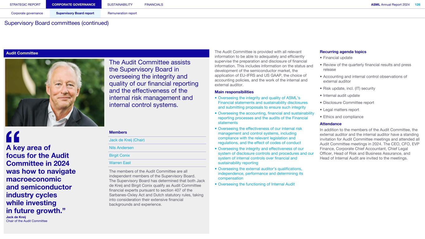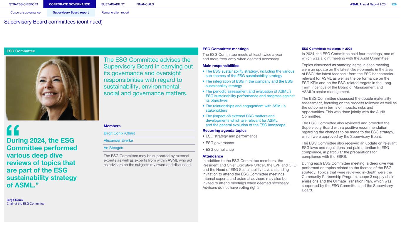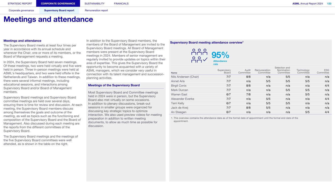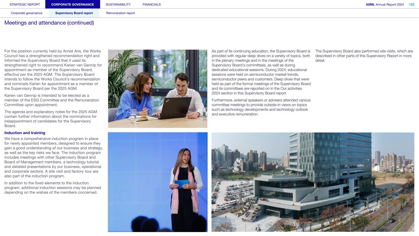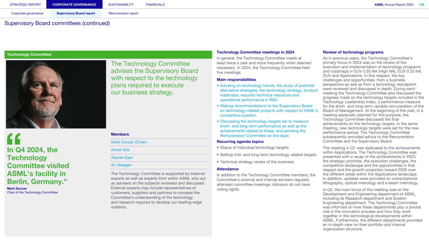 我们的监事会监督管理委员会以及ASML和我们子公司的一般事务过程。监事会还通过建议支持管理委员会。监事会在履行其作用和责任时,会考虑到ASML和我们业务的利益,以及我们利益相关者的相关利益。在我们的双层结构中,监事会是一个独立于管理委员会和ASML的独立机构。除作为监事会成员外,监事会成员均未亲自与ASML保持业务关系。监事会目前由九名成员组成,最少三名。在执行任务时,监事会关注的事项包括:我们的公司战略,旨在实现可持续的长期价值创造及其执行;管理委员会的人员配备和继任规划;管理我们业务活动固有风险的管理;财务报告流程;遵守适用的立法和法规;我们的文化和管理委员会在这方面的活动;与股东和其他利益相关者的关系;以及对ASML重要的环境、社会和治理(ESG)方面。重要的管理决策——例如设定运营和财务目标、为实现这些目标而设计的战略、重大投资、预算,以及发行、回购和注销股份——需要监事会的批准。监事会受其议事规则管辖。这些规则所涵盖的项目包括监事会及其委员会的职责、监事会及其委员会的组成、围绕会议的后勤工作、监事会成员的会议出席情况、这些成员的轮换时间表和委员会章程。监督委员会的议事规则和委员会章程定期审查,并在必要时进行修订。审计委员会章程每年进行审查,以确认其仍遵守适用的规则和条例,包括与《萨班斯-奥克斯利法案》有关的规则和条例。在监事会报告中阅读更多关于2024年监事会会议和活动的信息–会议和出席任命监事会成员由大会根据监事会提出的具有约束力的提名任命。在提名(重新)任命人员时,监事会会检查候选人是否符合监事会的概况,我们网站的治理部分提供了这一信息。股东大会可通过以绝对多数票通过的决议否决具有约束力的提名,该决议至少代表我们已发行股本的三分之一。如果赞成这样一项决议的票数至少不占未偿资本总额的三分之一,则可以召开新的股东大会——在该会议上可以以绝对多数否决提名。监事会一般会在任期实际结束前一年的年度股东大会上通知股东大会和劳资委员会即将结束的任期。这确保了工委会和大会有足够的机会为即将出现的空缺推荐候选人。监事会有权拒绝提议的建议。此外,劳资委员会有更大的权利为监事会三分之一的成员提出建议。这种增强的推荐权意味着,监事会只能在有限的情况下拒绝劳资委员会的建议:(i)如果相关人员不合适,或(ii)如果被推荐的人被任命,监事会将不会适当组成。监事会成员的任期最长为四年或根据监事会的轮换时间表更短。监事会委任程序第1阶段第2阶段第3阶段第4阶段第5阶段GM和劳资委员会的推荐权SB劳资委员会委任提名公告有权决定其职位SB委任SB成员的正式提名GM监事会成员有资格再获委任,最长任期四年,之后成员可再次获委任,最长任期两年。这一任命可以延长,最后任期不超过两年。轮调时间表可在我们网站的治理部分查阅。股东大会对监事会失去信任的,可以至少代表未偿资本总额三分之一的绝对多数票, 收回对监事会的信任——导致整个监事会立即被解职。在这种情况下,阿姆斯特丹上诉法院企业商会应应管理委员会的请求任命一名或多名监事会成员。有关2024年和2025年监事会组成变动的更多信息,请参见监事会报告监事会委员会监事会在保留全面责任的同时,将部分任务和职责分配给五个委员会:审计委员会、ESG委员会、薪酬委员会、遴选和提名委员会以及技术委员会。有关监事会委员会的更多信息,请参阅我们网站上发布的监事会报告和委员会章程战略报告公司治理可持续金融ASML年度报告202499公司治理监事会报告薪酬报告监事会