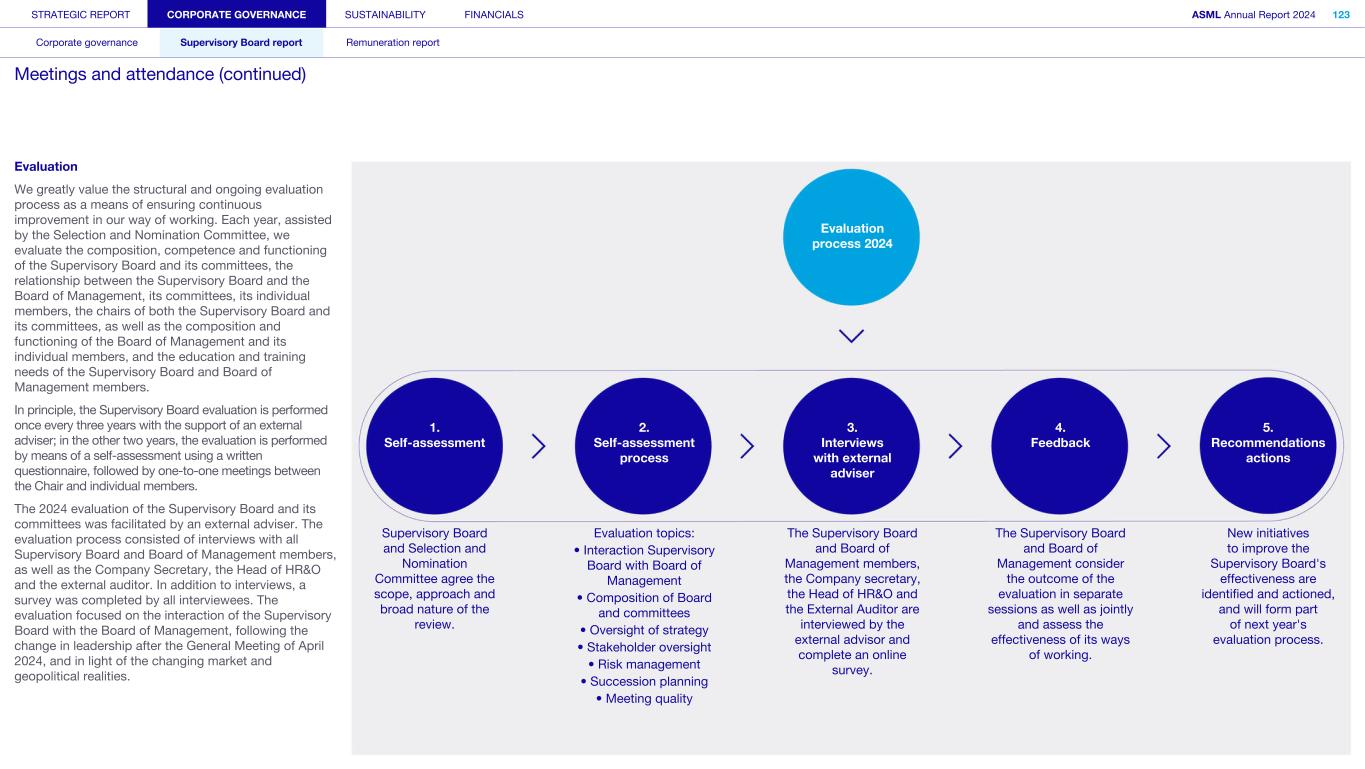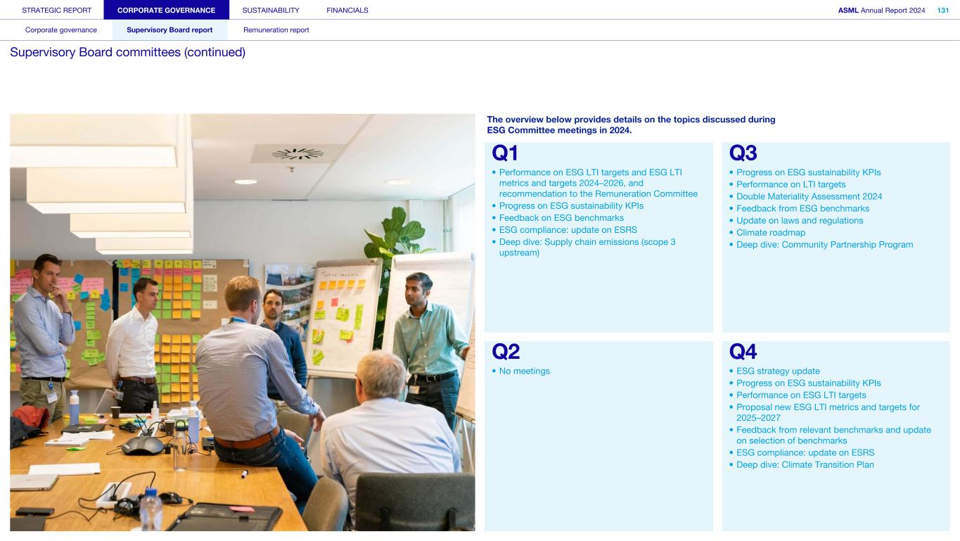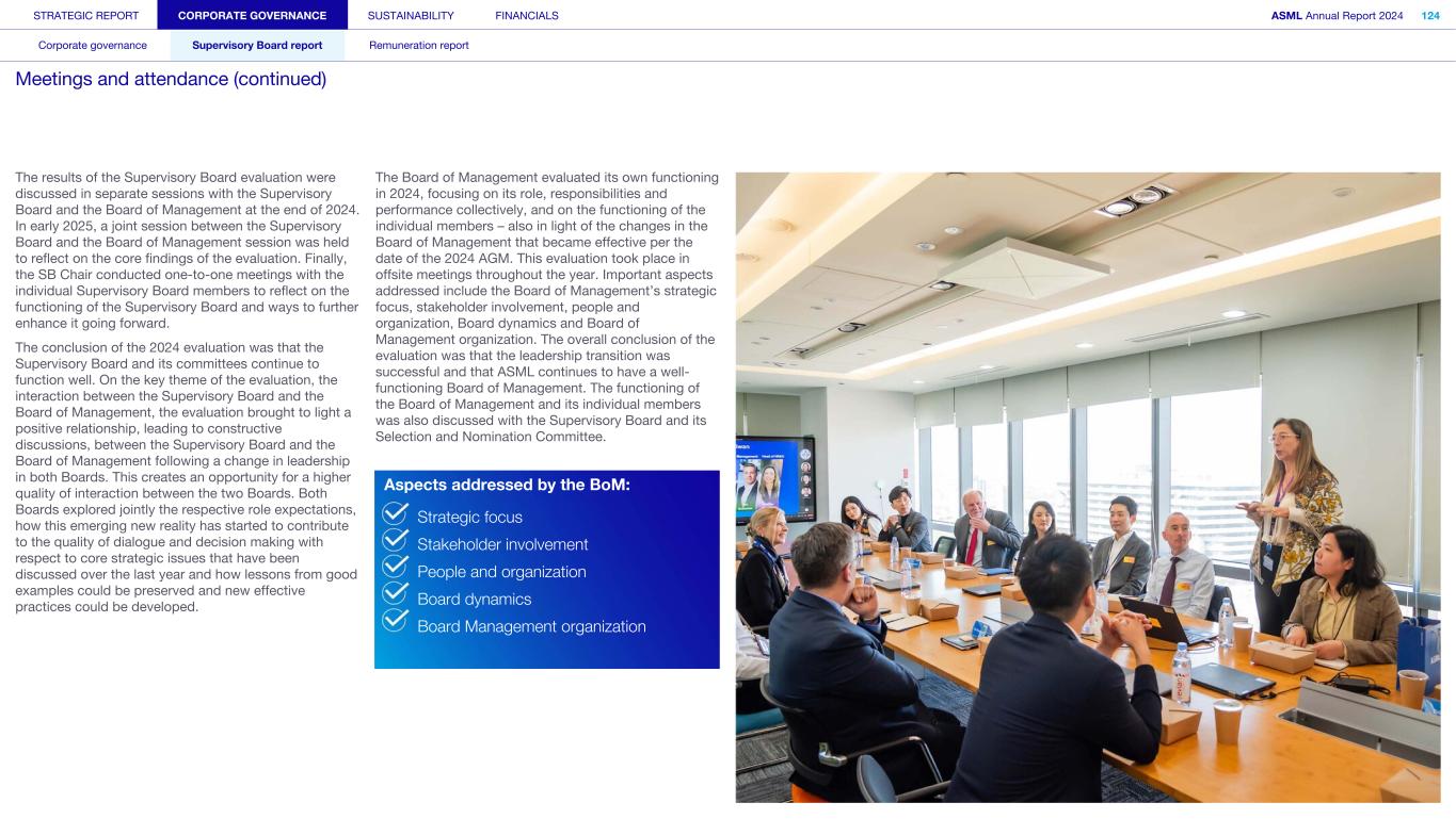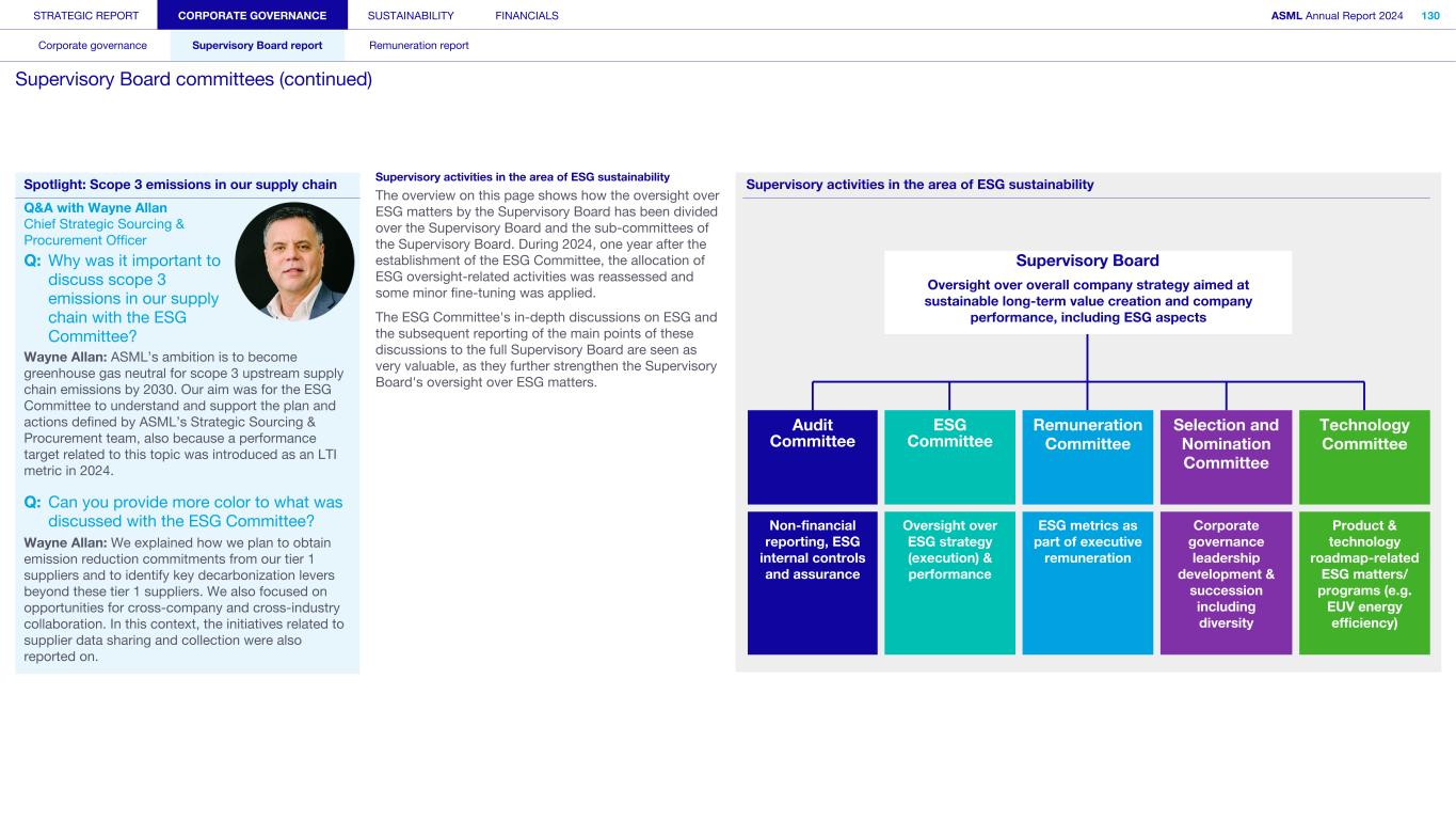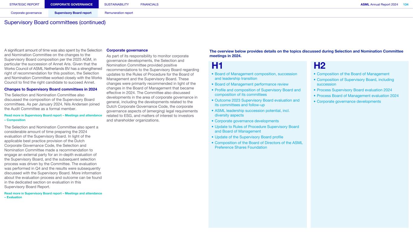 我们的监事会监督管理委员会以及ASML和我们子公司的一般事务过程。监事会还通过建议支持管理委员会。监事会在履行其作用和责任时,会考虑到ASML和我们业务的利益,以及我们利益相关者的相关利益。在我们的双层结构中,监事会是一个独立于管理委员会和ASML的独立机构。除作为监事会成员外,监事会成员均未亲自与ASML保持业务关系。监事会目前由九名成员组成,最少三名。在执行任务时,监事会关注的事项包括:我们的公司战略,旨在实现可持续的长期价值创造及其执行;管理委员会的人员配备和继任规划;管理我们业务活动固有风险的管理;财务报告流程;遵守适用的立法和法规;我们的文化和管理委员会在这方面的活动;与股东和其他利益相关者的关系;以及对ASML重要的环境、社会和治理(ESG)方面。重要的管理决策——例如设定运营和财务目标、为实现这些目标而设计的战略、重大投资、预算,以及发行、回购和注销股份——需要监事会的批准。监事会受其议事规则管辖。这些规则所涵盖的项目包括监事会及其委员会的职责、监事会及其委员会的组成、围绕会议的后勤工作、监事会成员的会议出席情况、这些成员的轮换时间表和委员会章程。监督委员会的议事规则和委员会章程定期审查,并在必要时进行修订。审计委员会章程每年进行审查,以确认其仍遵守适用的规则和条例,包括与《萨班斯-奥克斯利法案》有关的规则和条例。在监事会报告中阅读更多关于2024年监事会会议和活动的信息–会议和出席任命监事会成员由大会根据监事会提出的具有约束力的提名任命。在提名(重新)任命人员时,监事会会检查候选人是否符合监事会的概况,我们网站的治理部分提供了这一信息。股东大会可通过以绝对多数票通过的决议否决具有约束力的提名,该决议至少代表我们已发行股本的三分之一。如果赞成这样一项决议的票数至少不占未偿资本总额的三分之一,则可以召开新的股东大会——在该会议上可以以绝对多数否决提名。监事会一般会在任期实际结束前一年的年度股东大会上通知股东大会和劳资委员会即将结束的任期。这确保了工委会和大会有足够的机会为即将出现的空缺推荐候选人。监事会有权拒绝提议的建议。此外,劳资委员会有更大的权利为监事会三分之一的成员提出建议。这种增强的推荐权意味着,监事会只能在有限的情况下拒绝劳资委员会的建议:(i)如果相关人员不合适,或(ii)如果被推荐的人被任命,监事会将不会适当组成。监事会成员的任期最长为四年或根据监事会的轮换时间表更短。监事会委任程序第1阶段第2阶段第3阶段第4阶段第5阶段GM和劳资委员会的推荐权SB劳资委员会委任提名公告有权决定其职位SB委任SB成员的正式提名GM监事会成员有资格再获委任,最长任期四年,之后成员可再次获委任,最长任期两年。这一任命可以延长,最后任期不超过两年。轮调时间表可在我们网站的治理部分查阅。股东大会对监事会失去信任的,可以至少代表未偿资本总额三分之一的绝对多数票, 收回对监事会的信任——导致整个监事会立即被解职。在这种情况下,阿姆斯特丹上诉法院企业商会应应管理委员会的请求任命一名或多名监事会成员。有关2024年和2025年监事会组成变动的更多信息,请参见监事会报告监事会委员会监事会在保留全面责任的同时,将部分任务和职责分配给五个委员会:审计委员会、ESG委员会、薪酬委员会、遴选和提名委员会以及技术委员会。有关监事会委员会的更多信息,请参阅我们网站上发布的监事会报告和委员会章程战略报告公司治理可持续金融ASML年度报告202499公司治理监事会报告薪酬报告监事会