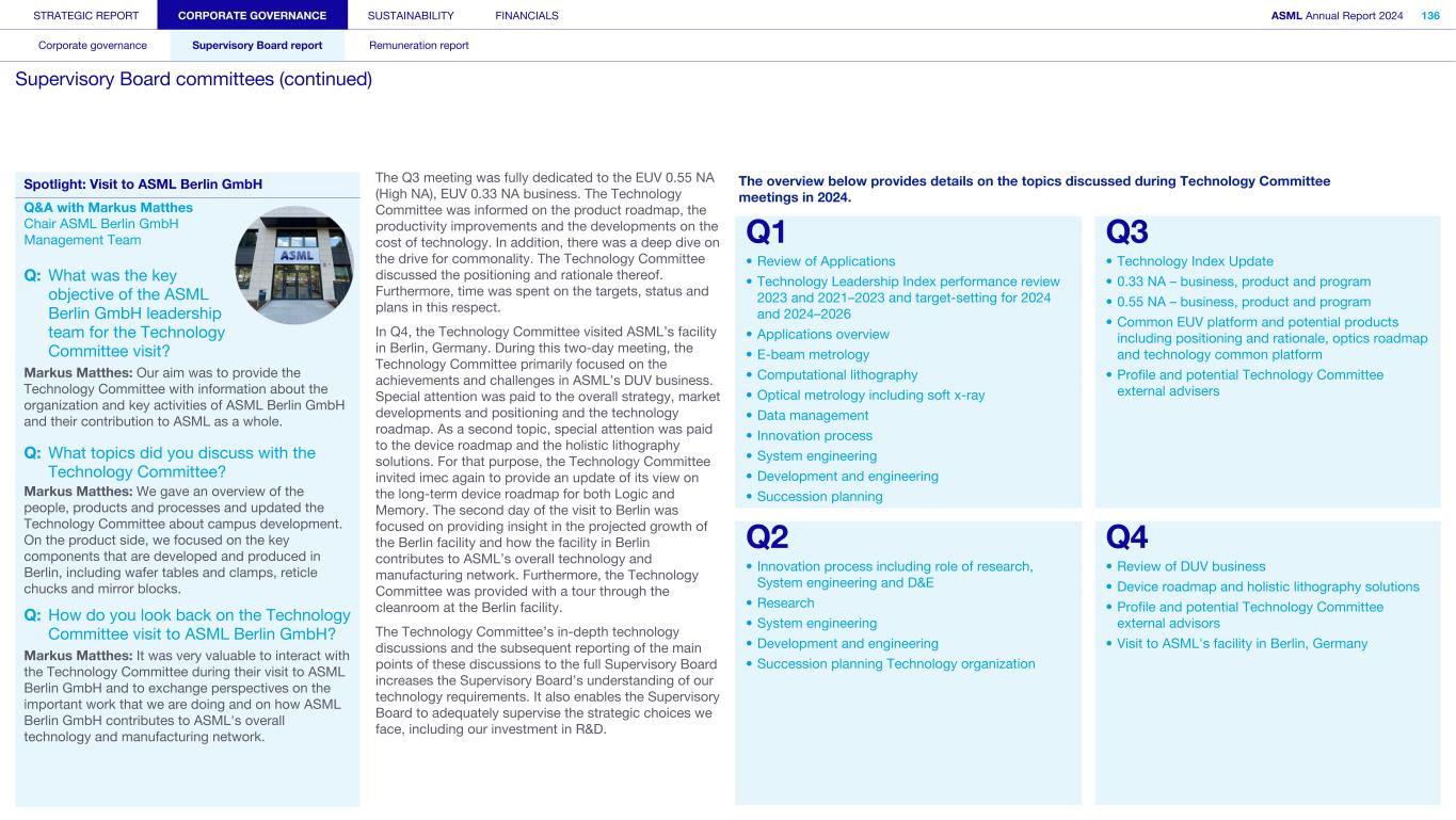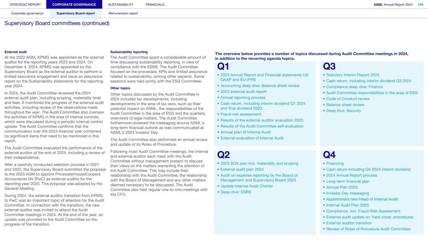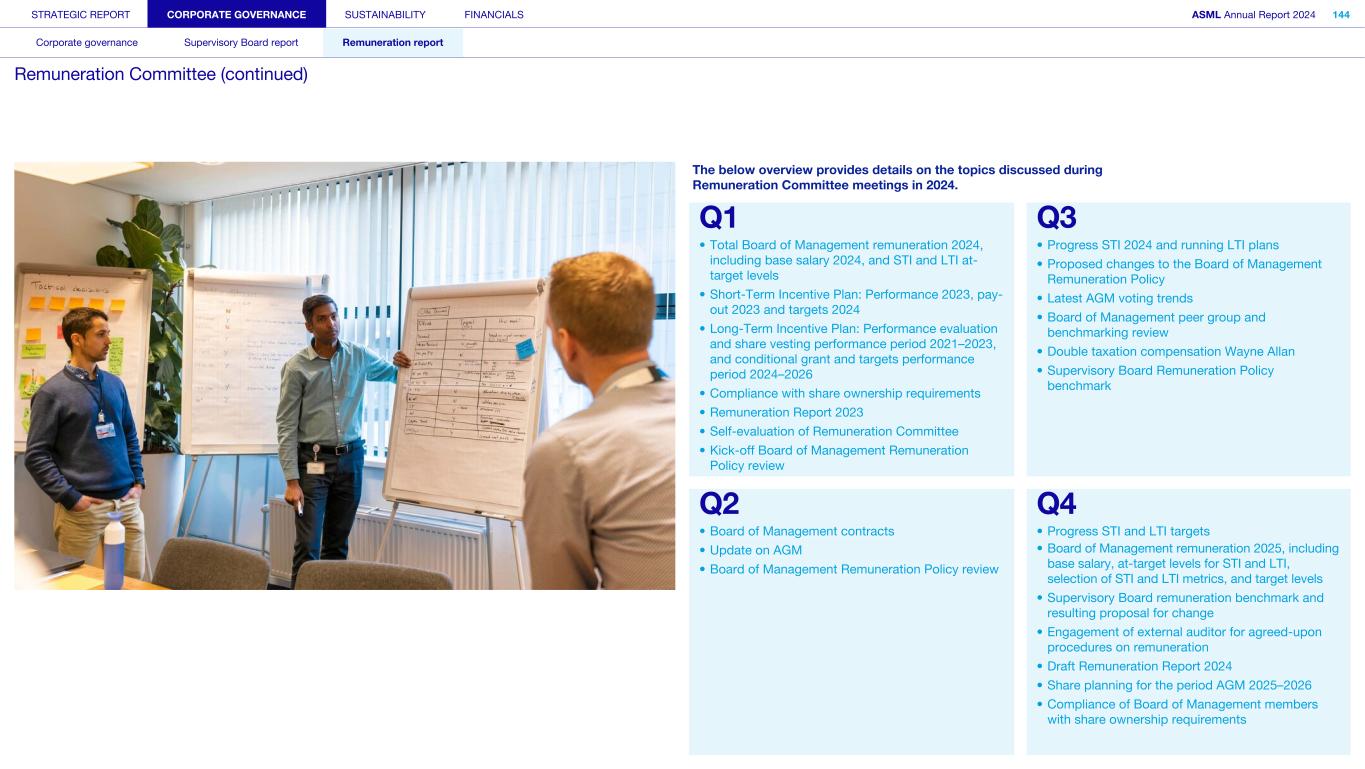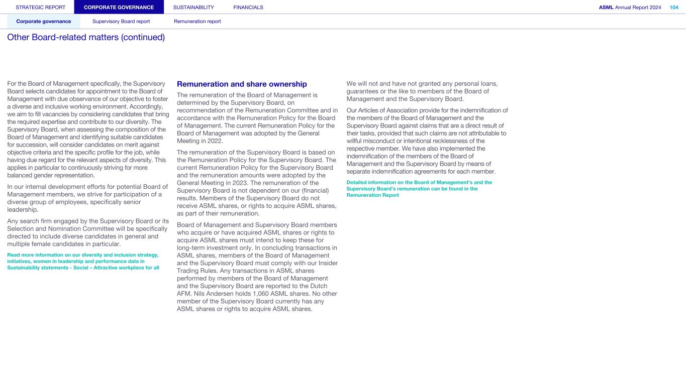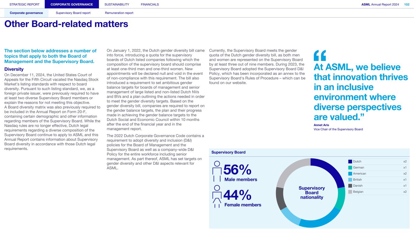 我们的监事会监督管理委员会以及ASML和我们子公司的一般事务过程。监事会还通过建议支持管理委员会。监事会在履行其作用和责任时,会考虑到ASML和我们业务的利益,以及我们利益相关者的相关利益。在我们的双层结构中,监事会是一个独立于管理委员会和ASML的独立机构。除作为监事会成员外,监事会成员均未亲自与ASML保持业务关系。监事会目前由九名成员组成,最少三名。在执行任务时,监事会关注的事项包括:我们的公司战略,旨在实现可持续的长期价值创造及其执行;管理委员会的人员配备和继任规划;管理我们业务活动固有风险的管理;财务报告流程;遵守适用的立法和法规;我们的文化和管理委员会在这方面的活动;与股东和其他利益相关者的关系;以及对ASML重要的环境、社会和治理(ESG)方面。重要的管理决策——例如设定运营和财务目标、为实现这些目标而设计的战略、重大投资、预算,以及发行、回购和注销股份——需要监事会的批准。监事会受其议事规则管辖。这些规则所涵盖的项目包括监事会及其委员会的职责、监事会及其委员会的组成、围绕会议的后勤工作、监事会成员的会议出席情况、这些成员的轮换时间表和委员会章程。监督委员会的议事规则和委员会章程定期审查,并在必要时进行修订。审计委员会章程每年进行审查,以确认其仍遵守适用的规则和条例,包括与《萨班斯-奥克斯利法案》有关的规则和条例。在监事会报告中阅读更多关于2024年监事会会议和活动的信息–会议和出席任命监事会成员由大会根据监事会提出的具有约束力的提名任命。在提名(重新)任命人员时,监事会会检查候选人是否符合监事会的概况,我们网站的治理部分提供了这一信息。股东大会可通过以绝对多数票通过的决议否决具有约束力的提名,该决议至少代表我们已发行股本的三分之一。如果赞成这样一项决议的票数至少不占未偿资本总额的三分之一,则可以召开新的股东大会——在该会议上可以以绝对多数否决提名。监事会一般会在任期实际结束前一年的年度股东大会上通知股东大会和劳资委员会即将结束的任期。这确保了工委会和大会有足够的机会为即将出现的空缺推荐候选人。监事会有权拒绝提议的建议。此外,劳资委员会有更大的权利为监事会三分之一的成员提出建议。这种增强的推荐权意味着,监事会只能在有限的情况下拒绝劳资委员会的建议:(i)如果相关人员不合适,或(ii)如果被推荐的人被任命,监事会将不会适当组成。监事会成员的任期最长为四年或根据监事会的轮换时间表更短。监事会委任程序第1阶段第2阶段第3阶段第4阶段第5阶段GM和劳资委员会的推荐权SB劳资委员会委任提名公告有权决定其职位SB委任SB成员的正式提名GM监事会成员有资格再获委任,最长任期四年,之后成员可再次获委任,最长任期两年。这一任命可以延长,最后任期不超过两年。轮调时间表可在我们网站的治理部分查阅。股东大会对监事会失去信任的,可以至少代表未偿资本总额三分之一的绝对多数票, 收回对监事会的信任——导致整个监事会立即被解职。在这种情况下,阿姆斯特丹上诉法院企业商会应应管理委员会的请求任命一名或多名监事会成员。有关2024年和2025年监事会组成变动的更多信息,请参见监事会报告监事会委员会监事会在保留全面责任的同时,将部分任务和职责分配给五个委员会:审计委员会、ESG委员会、薪酬委员会、遴选和提名委员会以及技术委员会。有关监事会委员会的更多信息,请参阅我们网站上发布的监事会报告和委员会章程战略报告公司治理可持续金融ASML年度报告202499公司治理监事会报告薪酬报告监事会