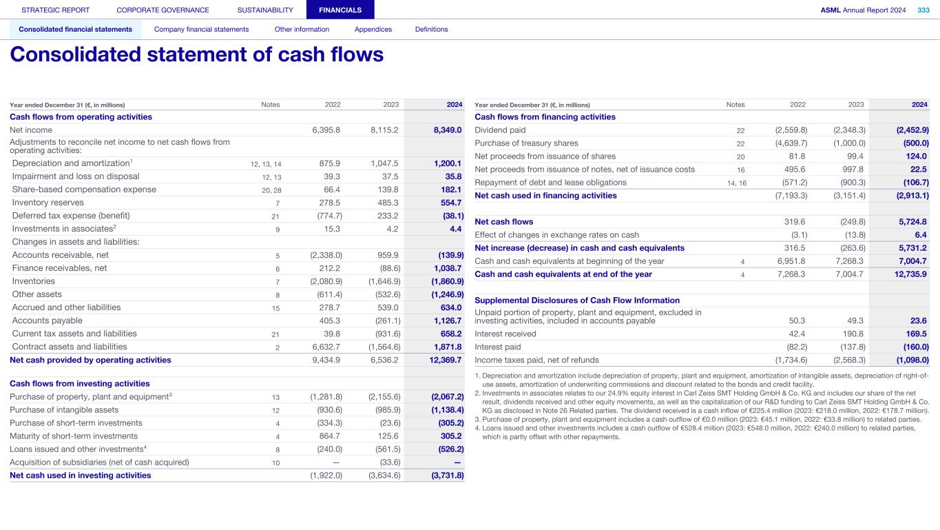 经营活动产生的现金流量净收益6,395.88,115.28,349.0调整净收益与经营活动产生的现金流量净额:折旧和摊销112,13,14875.91,047.51,200.1处置减值和损失12,1339.33 7.5 35.8股份报酬费用20,2866.41 39.8 18 2.1存货准备金7278.54 85.3554.7递延所得税费用(收益)21(774.7)233.2(38.1)对联营企业的投资2915.3 4.24.4资产负债变动:应收账款净额5(2,338.0)959.9(139.9)应收融资款,净额6212.2(88.6)1,038.7存货7(2,080.9)(1,646.9)(1,860.9)其他资产8(611.4)(532.6)(1,246.9)应计及其他负债15278.75 39.06 34.0应付账款405.3(261.1)1,126.7当期税项资产和负债2139.8(931.6)658.2合同资产和负债26,632.7(1,564.6)1,871.8经营活动提供的现金净额9,434.96,536.212,369.7投资活动产生的现金流量购买物业,厂房及设备313(1,281.8)(2,155.6)(2,067.2)购买无形资产12(930.6)(985.9)(1,138.4)购买短期投资4(334.3)(23.6)(305.2)短期投资到期4864.71 25.6 305.2发放贷款及其他投资48(240.0)(56 1.5)(526.2)收购子公司(扣除取得的现金)10 —(33.6)—投资活动使用的现金净额(1,922.0)(3,634.6)(3,731.8)截至12月31日止年度(欧元,百万元)票据202220232024筹资活动产生的现金流量支付股利22(2,559.8)(2,348.3)(2,452.9)购买库存股22(4,639.7)(1,000.0)(500.0)发行股票所得款项净额2081.899.41 24.0发行票据所得款项净额,扣除发行费用16495.69 97.82 2.5偿还债务和租赁义务14,16(571.2)(900.3)(106.7)筹资活动使用的现金净额(7,193.3)(3,151.4)(2,913.1)现金流量净额319.6(249.8)5,724.8汇率变动对现金的影响(3.1)(13.8)6.4现金及现金等价物净增加(减少)316.5(263.6)5,731.2年初现金及现金等价物46,951.87,268.37,004.7年末现金及现金等价物47,268.37,004.712,735.9补充披露现金流量信息不计入投资活动的物业、厂房及设备未支付部分,计入应付账款50.34 9.32 3.6已收利息42.41 90.81 69.5已付利息(82.2)(137.8)(160.0)已付所得税,扣除退款(1,734.6)(2,568.3)(1,098.0)截至12月31日止年度(欧元,单位:百万)票据2022202320241。折旧和摊销包括物业、厂房和设备的折旧、无形资产的摊销、使用权资产的折旧、承销佣金的摊销以及与债券和信贷融资相关的折扣。2.对联营公司的投资涉及我们在Carl Zeiss SMT Holding GmbH & Co. KG的24.9%股权,包括我们在净业绩中所占的份额、收到的股息和其他股权变动,以及我们对Carl Zeiss SMT Holding GmbH & Co. KG的研发资金的资本化,如附注26中披露的关联方。收到的股息是2.254亿欧元的现金流入(2023年:2.18亿欧元,2022年:1.787亿欧元)。3.购买物业、厂房和设备包括对关联方的现金流出0.0百万欧元(2023年:4510万欧元,2022年:3380万欧元)。4.发放的贷款和其他投资包括对关联方的现金流出5.284亿欧元(2023年:5.480亿欧元,2022年:2.400亿欧元),这部分被其他还款所抵消。战略报告公司治理可持续发展财务ASML年度报告2024333合并财务报表公司财务报表其他信息附录定义合并现金流量表