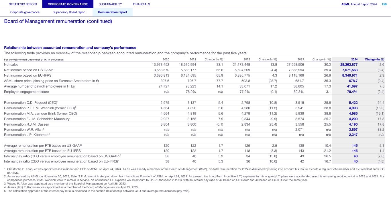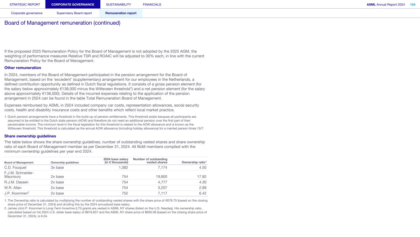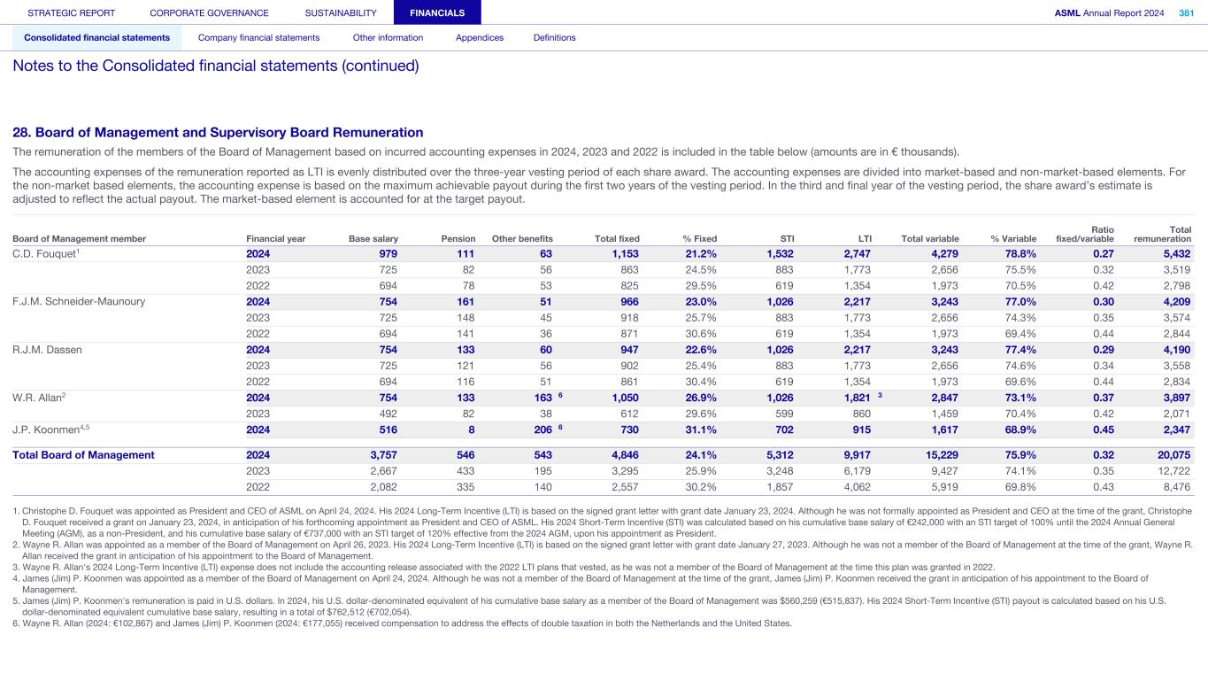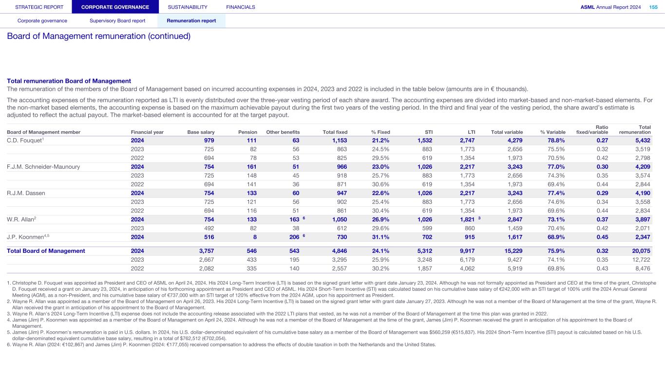 28.管理委员会和监事会薪酬根据2024年、2023年和2022年发生的会计费用计算的管理委员会成员薪酬见下表(金额单位:千欧元)。作为LTI报告的薪酬的会计费用在每笔股份奖励的三年归属期内平均分配。会计费用分为市场化要素和非市场化要素。对于非市场为基础的要素,会计费用基于归属期前两年可实现的最大支出。在归属期的第三年,也是最后一年,股份奖励的估计数将进行调整,以反映实际支出。以市场为基础的要素在目标支出中核算。管理委员会成员财政年度基本工资养老金其他福利总额固定%固定STI LTI总变动%可变比率固定/可变薪酬总额C.D. Fouquet1 2024979111631,15321.2% 1,5322,7474,27978.8% 0.27 5,4322023725825686324.5% 8831,7732,65675.5% 0.323,5192022694785382529.5% 6191,3541,97370.5% 0.422,798 F.J.M. Schneider-Maunoury 20247541615196623.0% 1,0262,2173,24377.0% 0.304,20920237251484591825.7% 8831,7732,65674.3% 0.353,57420226941413687130.6% 6191,0.442,844 R.J.M.达森20247541336094722.6% 1,0262,2173,24377.4% 0.294,19020237251215690225.4% 8831,7732,65674.6% 0.343,55820226941165186130.4% 6191,3541,97369.6% 0.442,834 W.R. Allan2 202475413316361,05026.9% 1,0261,82132,84773.1% 0.373,8972023492823861229.6% 5998601,45970.4% 0.422,071 J.P. Koonmen4,520245168206673031.1% 7029151,61768.9% 0.452,347管理委员会总数20243,7575465434,84624.1%2023 2,667 433 195 3,295 25.9% 3,248 6,179 9,427 74.1% 0.35 12,722 2022 2,082 335 140 2,557 30.2% 1,857 4,062 5,919 69.8% 0.43 8,476 1.Christophe D. Fouquet于2024年4月24日被任命为ASML总裁兼首席执行官。他的2024年长期激励(LTI)基于已签署的授予书,授予日期为2024年1月23日。尽管在获得赠款时并未被正式任命为总裁兼首席执行官,但Christophe D. Fouquet还是在2024年1月23日获得了赠款,这是因为预计他即将被任命为ASML的总裁兼首席执行官。他的2024年短期激励(STI)是根据他以非总裁身份在2024年年度股东大会(AGM)之前的累计基本工资为242,000欧元、STI目标为100%以及在他被任命为总裁后自2024年年度股东大会起生效的累计基本工资为737,000欧元、STI目标为120%计算得出的。2.Wayne R. Allan于2023年4月26日被任命为管理委员会成员。他的2024年长期激励(LTI)基于已签署的授予书,授予日期为2023年1月27日。尽管在获得赠款时他还不是管理委员会的成员,但Wayne R. Allan收到了这笔赠款,因为他预计将被任命为管理委员会成员。3.Wayne R. Allan的2024年长期激励(LTI)费用不包括与归属的2022年LTI计划相关的会计发布,因为他在2022年授予该计划时不是管理委员会成员。4.James(Jim)P. Koonmen于2024年4月24日被任命为管理委员会成员。尽管在获得赠款时他还不是管理委员会的成员,但James(Jim)P. Koonmen收到了这笔赠款,因为他预计将被任命为管理委员会成员。5.James(Jim)P. Koonmen的薪酬以美元支付。2024年,他作为管理委员会成员的累计基本工资以美元计价的等值为560,259美元(515,837欧元)。他的2024年短期激励(STI)支出是根据他以美元计价的等值累计基本工资计算的,总计762,512美元(702,054欧元)。6.Wayne R. Allan(2024年:102,867欧元)和James(Jim)P. Koonmen(2024年:177,055欧元)获得赔偿,以解决荷兰和美国双重征税的影响。战略报告公司治理可持续发展财务ASML年度报告2024381合并财务报表公司财务报表其他信息附录定义合并财务报表附注(续)