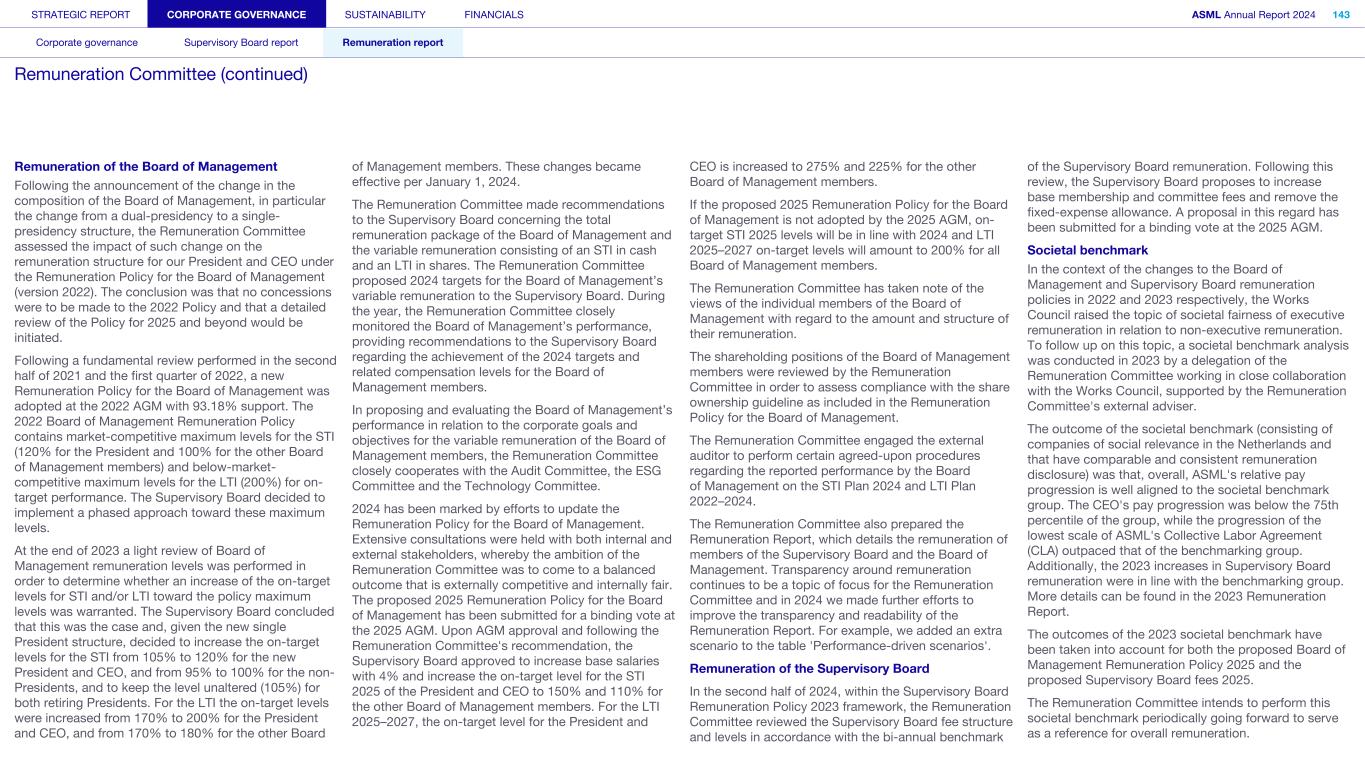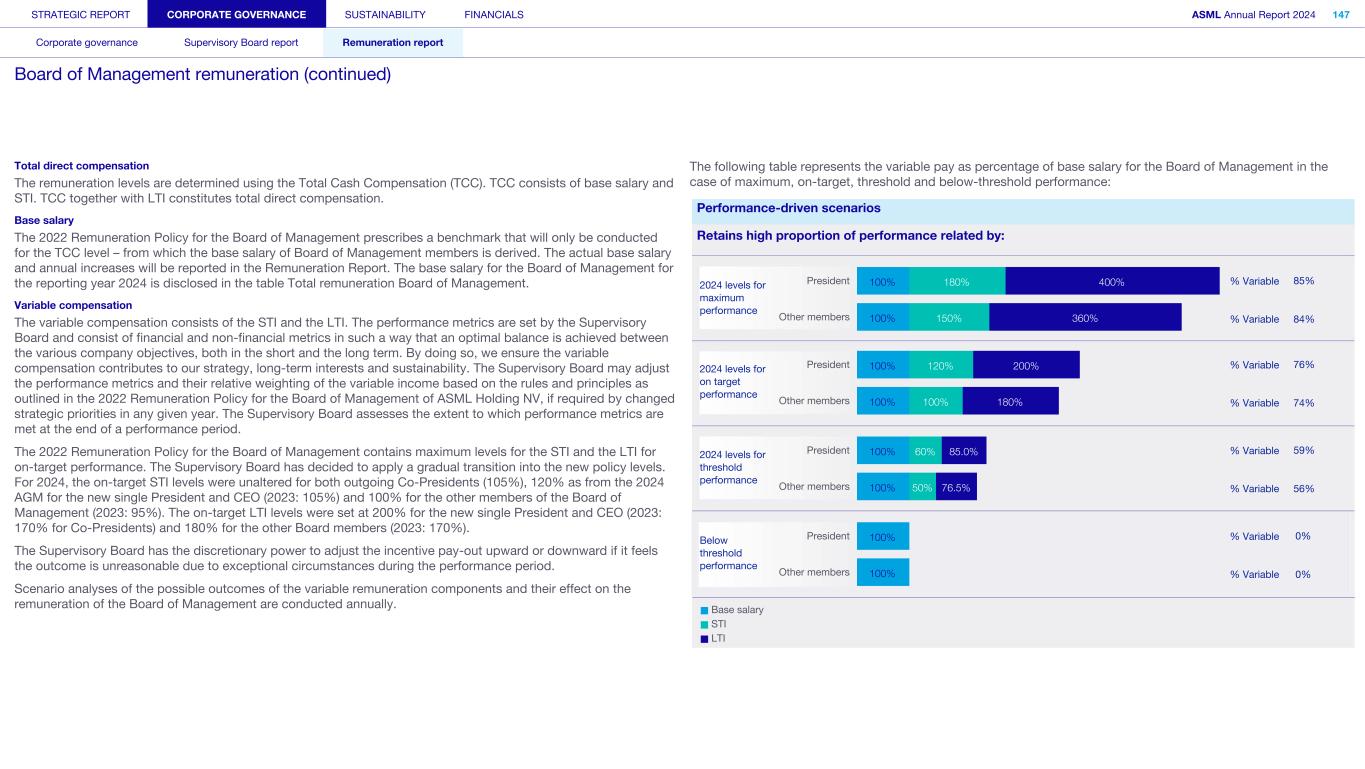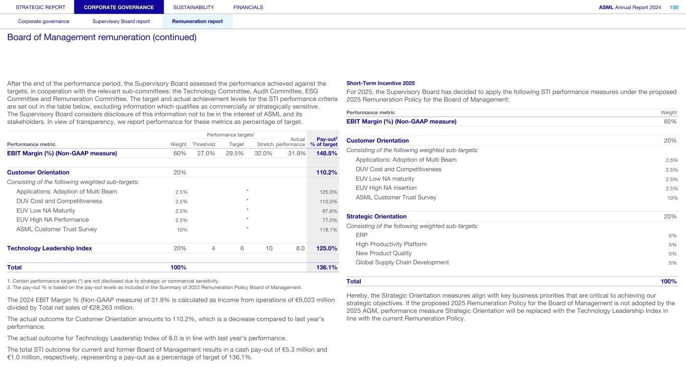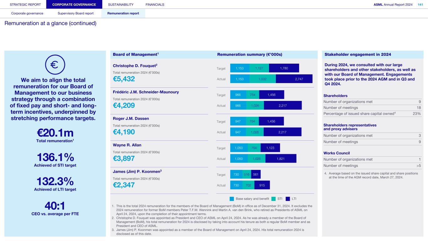 28.管理委员会和监事会薪酬根据2024年、2023年和2022年发生的会计费用计算的管理委员会成员薪酬见下表(金额单位:千欧元)。作为LTI报告的薪酬的会计费用在每笔股份奖励的三年归属期内平均分配。会计费用分为市场化要素和非市场化要素。对于非市场为基础的要素,会计费用基于归属期前两年可实现的最大支出。在归属期的第三年,也是最后一年,股份奖励的估计数将进行调整,以反映实际支出。以市场为基础的要素在目标支出中核算。管理委员会成员财政年度基本工资养老金其他福利总额固定%固定STI LTI总变动%可变比率固定/可变薪酬总额C.D. Fouquet1 2024979111631,15321.2% 1,5322,7474,27978.8% 0.27 5,4322023725825686324.5% 8831,7732,65675.5% 0.323,5192022694785382529.5% 6191,3541,97370.5% 0.422,798 F.J.M. Schneider-Maunoury 20247541615196623.0% 1,0262,2173,24377.0% 0.304,20920237251484591825.7% 8831,7732,65674.3% 0.353,57420226941413687130.6% 6191,0.442,844 R.J.M.达森20247541336094722.6% 1,0262,2173,24377.4% 0.294,19020237251215690225.4% 8831,7732,65674.6% 0.343,55820226941165186130.4% 6191,3541,97369.6% 0.442,834 W.R. Allan2 202475413316361,05026.9% 1,0261,82132,84773.1% 0.373,8972023492823861229.6% 5998601,45970.4% 0.422,071 J.P. Koonmen4,520245168206673031.1% 7029151,61768.9% 0.452,347管理委员会总数20243,7575465434,84624.1%2023 2,667 433 195 3,295 25.9% 3,248 6,179 9,427 74.1% 0.35 12,722 2022 2,082 335 140 2,557 30.2% 1,857 4,062 5,919 69.8% 0.43 8,476 1.Christophe D. Fouquet于2024年4月24日被任命为ASML总裁兼首席执行官。他的2024年长期激励(LTI)基于已签署的授予书,授予日期为2024年1月23日。尽管在获得赠款时并未被正式任命为总裁兼首席执行官,但Christophe D. Fouquet还是在2024年1月23日获得了赠款,这是因为预计他即将被任命为ASML的总裁兼首席执行官。他的2024年短期激励(STI)是根据他以非总裁身份在2024年年度股东大会(AGM)之前的累计基本工资为242,000欧元、STI目标为100%以及在他被任命为总裁后自2024年年度股东大会起生效的累计基本工资为737,000欧元、STI目标为120%计算得出的。2.Wayne R. Allan于2023年4月26日被任命为管理委员会成员。他的2024年长期激励(LTI)基于已签署的授予书,授予日期为2023年1月27日。尽管在获得赠款时他还不是管理委员会的成员,但Wayne R. Allan收到了这笔赠款,因为他预计将被任命为管理委员会成员。3.Wayne R. Allan的2024年长期激励(LTI)费用不包括与归属的2022年LTI计划相关的会计发布,因为他在2022年授予该计划时不是管理委员会成员。4.James(Jim)P. Koonmen于2024年4月24日被任命为管理委员会成员。尽管在获得赠款时他还不是管理委员会的成员,但James(Jim)P. Koonmen收到了这笔赠款,因为他预计将被任命为管理委员会成员。5.James(Jim)P. Koonmen的薪酬以美元支付。2024年,他作为管理委员会成员的累计基本工资以美元计价的等值为560,259美元(515,837欧元)。他的2024年短期激励(STI)支出是根据他以美元计价的等值累计基本工资计算的,总计762,512美元(702,054欧元)。6.Wayne R. Allan(2024年:102,867欧元)和James(Jim)P. Koonmen(2024年:177,055欧元)获得赔偿,以解决荷兰和美国双重征税的影响。战略报告公司治理可持续发展财务ASML年度报告2024381合并财务报表公司财务报表其他信息附录定义合并财务报表附注(续)