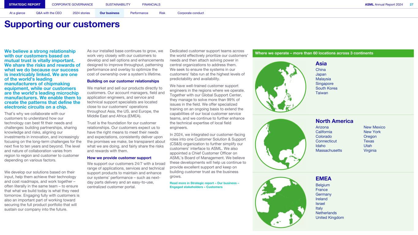 我们认为,与客户建立在相互信任基础上的牢固关系至关重要。我们分担我们所做工作的风险和回报,因为我们的成功是密不可分的。我们是全球领先的芯片制造设备制造商之一,而我们的客户是全球领先的微芯片制造商。我们使它们能够创建定义芯片上电子电路的图案。这就是为什么我们与客户合作,以了解我们的技术如何最适合他们的需求和挑战:建立合作伙伴关系、分享知识和风险、调整我们在创新方面的投资,以及越来越关注未来五到十年及更长时间的长期挑战。协作的水平和性质因地区而异,因客户而异,这取决于各种因素。我们根据他们的投入开发我们的解决方案,帮助他们实现技术和成本路线图,并一起工作——通常是在同一个团队中——确保我们今天构建的就是他们明天需要的。与客户充分接触也是努力确保完整的产品组合的重要组成部分,这将使我们的公司持续到未来。随着我们的安装基数不断增长,我们与客户密切合作,开发和销售旨在提高吞吐量、图案化性能和叠加的选项和增强功能,以优化系统生命周期内的拥有成本。以我们的客户关系为基础我们直接向客户营销和销售我们的产品。我们的客户经理、现场和应用工程师以及服务和技术支持专家位于亚洲、美国以及欧洲、中东和非洲(EMEA)客户业务附近。信任是我们建立客户关系的基础。我们的客户希望我们有正确的手段来满足他们的需求和期望,始终如一地兑现我们做出的承诺,对我们正在做的事情保持透明,并与他们公平地分担风险和回报。我们如何提供客户支持我们通过广泛的应用程序、服务和技术支持产品为客户提供24/7全天候支持,以维护和增强我们系统的性能——例如次日零件交付和易于使用的集中式客户门户。世界各地的专门客户支持团队有效地优先考虑我们客户的需求,然后在中央组织中附加解决能力来解决这些问题。我们力求确保客户晶圆厂中的系统以最高水平的可预测性和可用性运行。我们在经营所在地区拥有训练有素的客户支持工程师。与我们的全球支持中心一起,他们设法解决了该领域99%以上的问题。我们持续提供专业培训,以扩展我们当地客户服务团队的能力,我们继续进一步增强当地现场工程师的技术专长。2024年,我们将面向客户的角色整合到一个客户解决方案与支持(CS & S)组织中,以进一步简化客户与ASML的接口。我们还在ASML的管理委员会任命了一名首席客户官。我们相信,随着业务的增长,这些发展将帮助我们继续提供出色的支持并不断建立客户信任。在战略报告中阅读更多内容–我们的业务–敬业的利益相关者–客户战略报告公司治理可持续性财务202427年度报告与首席执行官的问答一目了然2024年的故事我们的业务绩效风险公司行为支持我们经营所在的客户–遍布3个大洲的60多个地点亚洲中国日本马来西亚新加坡韩国台湾北美亚利桑那加州科罗拉多康涅狄格爱达荷麻萨诸塞州新墨西哥纽约俄勒冈德克萨斯犹他弗吉尼亚EMEA比利时法国德国爱尔兰以色列意大利荷兰英国