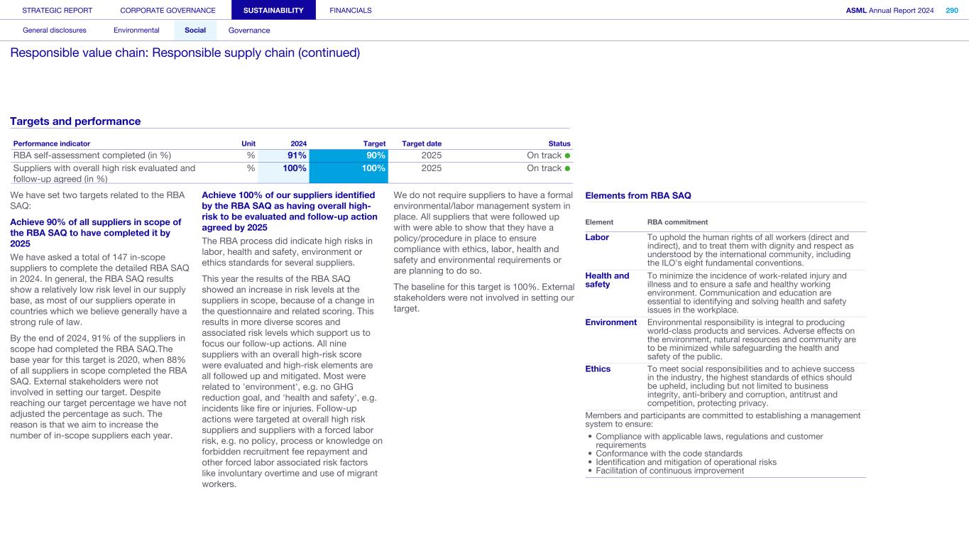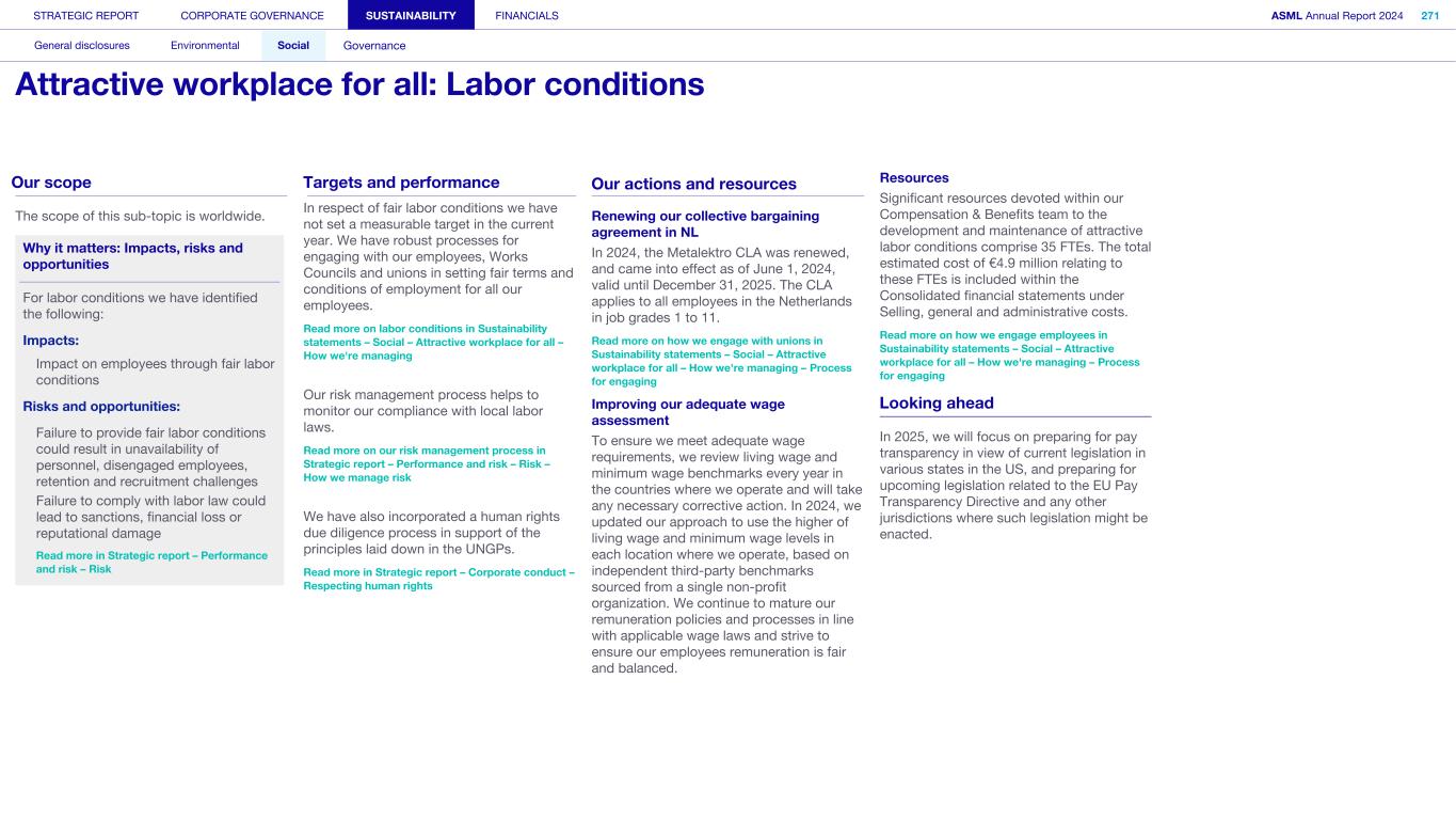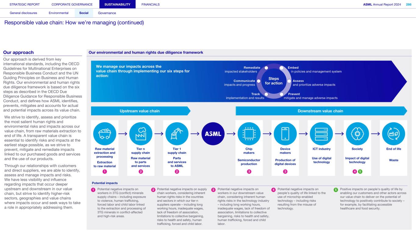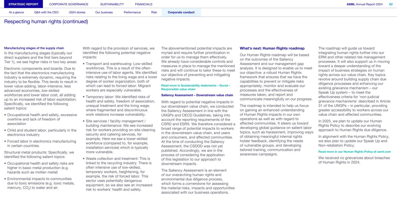 供应链的制造阶段在制造阶段(通常是我们的直接供应商和Tier1以外的第一层),我们看到两个关键领域的风险更高:电子元器件和板卡:由于电子制造业极具活力,要求行业具有灵活性。这往往会导致附加值降低、劳动密集型、欠发达经济体、低技能劳动力和劳动力成本降低,所有这些都增加了劳动力剥削的风险。具体而言,我们确定了以下突出主题:•职业健康和安全、过度加班和缺乏结社自由•童工和学生劳动,特别是在电子行业•某些国家的电子制造业中的强迫劳动。结构金属产品:具体而言,我们确定了以下突出主题:•基本金属生产中的职业健康和安全风险更高(例如熔融金属等危害)•由于水和空气的有毒排放(例如有毒金属、汞、CO2)对社区的环境影响。关于提供服务,我们确定了以下潜在负面影响:•运输和仓储:低技能劳动力。这是劳务工经常密集使用的结果。我们确定了与生活工资和工人组织化程度较低有关的风险,这两者都可能导致强迫劳动。农民工尤其容易受到伤害。•临时劳动力:我们确定了健康和安全、结社自由、不平等待遇和生活工资的风险,在这些风险中,支离破碎和不连续的工作关系增加了脆弱性。•现场服务/设施管理/建筑物维护:例如,我们看到提供现场清洁安保和餐饮服务的工人面临的风险增加。在这里,我们看到了技能较低的劳动力(例如,与安装服务相比),这通常更脆弱。•废物收集和处理:这与回收行业相关联。经常出现密集使用低技能、临时工的情况,例如增加了强迫劳动的风险。该行业使用了具有潜在危险的设备,因此我们也看到工人的健康和安全面临的风险增加。上述潜在影响是无数的,需要进一步确定优先次序,以便我们有效管理它们。我们已经有相当多的控制措施和措施来管理上述风险,并将继续量身定制这些措施,以实现我们预防和减轻负面影响的目标。阅读更多可持续发展声明–社会–负责任的价值链显着评估–下游价值链关于我们下游价值链的潜在负面影响,我们根据UNGP和OECD指南进行了显着评估,同时考虑了CSRD和ESRS的报告要求。因此,我们考虑了对下游价值链中的工人、最终用户和消费者以及影响社区的广泛潜在影响。在进行显着评估时,CSDDD尚未公布。因此,我们正在考虑将这项立法适用于我们对下游影响的处理方法。显着评估是我们首要的人权和环境尽职调查过程的一个要素,它构成了评估与我们的业务运营相关的重大风险、影响和机会的基石。接下来是什么:人权路线图我们的人权路线图将基于显着评估的结果和我们的管理差距分析。它旨在使我们能够实现我们的目标:一个强有力的人权框架,确保我们有能力适当预防或减轻风险,监测和评估我们的进程和所采取措施的有效性,并就我们的进展进行有意义的报告和交流。该路线图旨在帮助我们专注于在我们自己的行动中以及在受影响的社区中增强对人权影响的理解。它引导我们制定关于显着劳工主题的全球指导,例如骚扰、改进获得有意义的内部权利持有人反馈的方式、确定弱势群体的需求以及制定量身定制的培训、沟通和宣传活动。该路线图将指导我们进一步将人权纳入我们的ERM和其他相关风险管理流程。它还将支持我们更深入地了解商业战略对我们整个价值链中的人权的影响。关键议题围绕建立供应链尽职调查流程和加强我们现有的申诉机制——我们的发声系统——来满足UNGP第31条中描述的“非司法申诉机制”的有效性标准——特别是, 为我们整个价值链和受影响社区的工人提供更大的可及性。2025年,我们计划更新我们的人权政策,以描述我们不断发展的人权尽职调查方法。根据人权政策,我们还计划更新我们的发声和不报复政策。在asml.com上阅读更多我们的人权政策我们在2024年没有收到任何关于侵犯人权的不满。战略报告企业治理可持续发展财务ASML年度报告202482与CEO的一览问答2024故事我们的业务绩效风险尊重人权的企业行为(续)