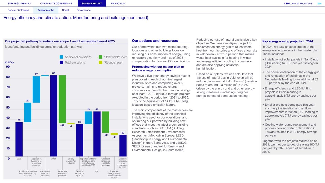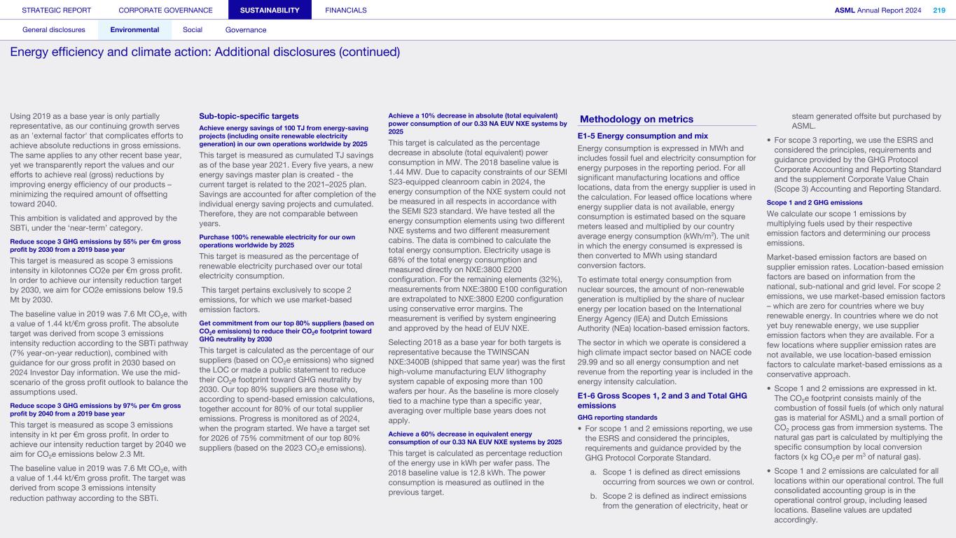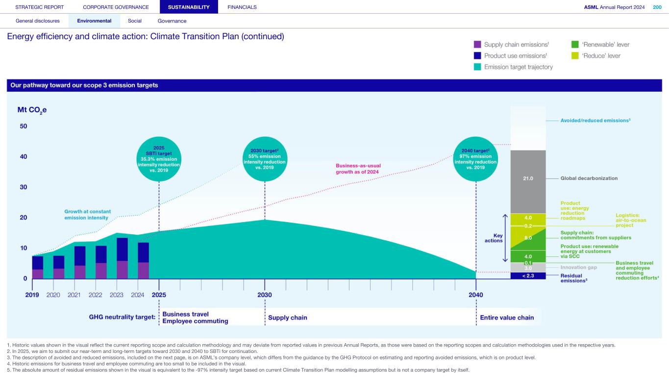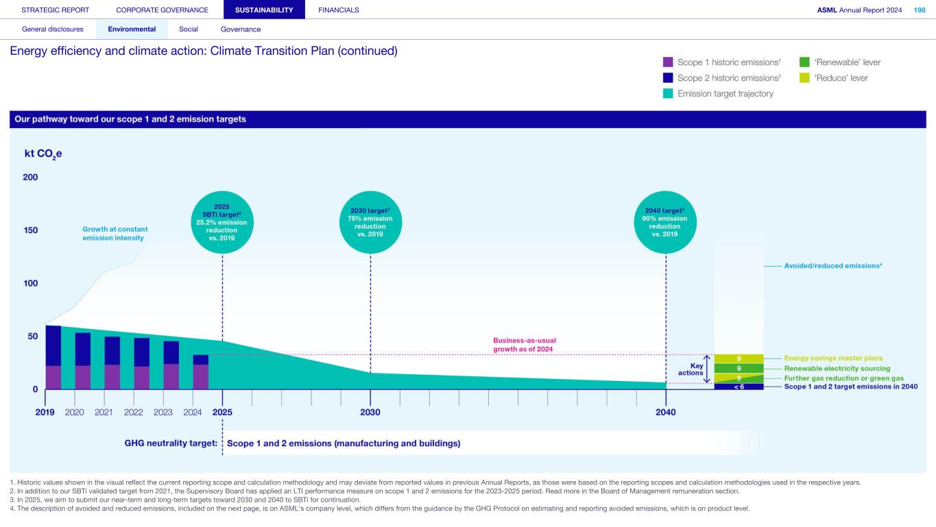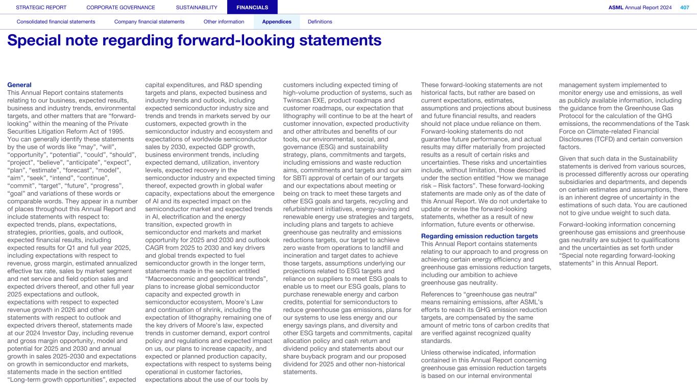 总体而言,本年度报告包含与我们的业务、预期结果、业务和行业趋势、环境目标以及1995年《私人证券诉讼改革法案》含义内的其他“前瞻性”事项有关的陈述。你一般可以通过使用“可能”、“将”、“机会”、“潜力”、“可以”、“应该”、“项目”、“相信”、“预期”、“计划”、“估计”、“预测”、“模型”、“目标”、“寻求”、“打算”、“继续”、“承诺”、“目标”、“未来”、“进展”、“目标”等词语来识别这些陈述,以及这些词语或类似词语的变体。它们出现在本年度报告的多个地方,包括以下方面的陈述:预期趋势、计划、预期、战略、优先事项、目标和前景,预期财务结果,包括2025年第一季度和全年的预期结果,包括对收入、毛利率、估计年化有效税率、按细分市场划分的销售额和净服务和现场期权销售额及其预期驱动因素的预期,以及其他2025年全年预期和前景,对2026年预期收入增长的预期,以及对前景及其预期驱动因素的其他陈述,在2024年投资者日发表的声明,包括2025年和2030年的收入和毛利率机会、模式和潜力以及2025-2030年销售额的年度增长以及对半导体终端市场增长的预期,在题为“长期增长机会”的部分发表的声明,预期资本支出,以及研发支出目标和计划,预期业务和行业趋势和前景,包括预期的半导体行业规模和趋势以及我们客户所服务的市场的趋势、半导体行业和生态系统的预期增长以及到2030年全球半导体销售额的预期、预期的GDP增长、商业环境趋势,包括预期的需求,利用率、库存水平、半导体行业的预期复苏及其预期时间、全球晶圆产能预期增长、对人工智能出现的预期及其对半导体市场的预期影响以及人工智能、电气化和能源转型的预期趋势、半导体终端市场的预期增长和2025和2030年的市场机会以及2025-2030年的前景复合年增长率以及预计将在更长期推动半导体增长的关键驱动因素和全球趋势,在题为“宏观经济和地缘政治趋势”的部分中所作的声明,计划增加全球半导体产能和半导体生态系统的预期增长,摩尔定律和收缩的持续,包括光刻机的预期仍然是摩尔定律的关键驱动因素之一,客户需求的预期趋势,出口管制政策和法规以及对我们的预期影响,我们增加产能的计划,以及预期或计划的产能,对客户工厂中正在运行的系统的预期,对客户使用我们的工具的预期,包括预期系统大批量生产的时间,如Twinscan EXE,产品路线图和客户路线图,我们期望光刻技术将继续成为客户创新、预期生产力和我们工具的其他属性和益处的核心,我们的环境、社会和治理(ESG)和可持续发展战略、计划、承诺和目标,包括排放和废物减少目标、承诺和目标,以及我们对SBTI批准我们的某些目标的目标,以及我们对实现这些目标和其他ESG目标和指标、回收和翻新举措、节能和可再生能源使用战略和目标的期望,包括实现温室气体中和和减排目标的计划和目标、我们实现从运营到填埋和焚烧的零废物的目标以及实现这些目标的目标日期、我们与ESG目标相关的预测所依据的假设以及依赖供应商实现ESG目标以使我们能够实现ESG目标、购买可再生能源和碳信用额的计划、半导体减少温室气体排放的潜力、我们的系统使用更少能源的计划和我们的节能计划,以及多样性和其他ESG目标和承诺,资本分配政策、现金回报和股息政策以及关于我们的股票回购计划和我们提议的2025年股息的声明以及其他非历史声明。这些前瞻性陈述并非历史事实,而是基于当前对业务和未来财务业绩的预期、估计、假设和预测,读者不应过分依赖它们。前瞻性陈述并不能保证未来的业绩, 由于某些风险和不确定性,实际结果可能与预计结果存在重大差异。这些风险和不确定性包括但不限于题为“我们如何管理风险——风险因素”一节中描述的风险和不确定性。这些前瞻性陈述仅在本年度报告发布之日作出。我们不承诺更新或修改前瞻性陈述,无论是由于新信息、未来事件或其他原因。关于减排目标本年度报告包含有关我们在实现某些能效和温室气体减排目标方面的方法和进展的陈述,包括我们实现温室气体中和的雄心。提到“温室气体中性”是指在ASML努力达到其GHG减排目标之后,剩余的排放量将获得根据公认质量标准核实的相同数量的公吨碳信用额的补偿。除非另有说明,本年度报告所载有关温室气体减排目标的信息均基于我们为监测能源使用和排放而实施的内部环境管理系统,以及公开可获得的信息,包括《温室气体议定书》中关于计算GHG排放量的指南、气候相关财务披露(TCFD)工作组的建议和某些转换因子。鉴于可持续发展报表中的此类数据来自不同来源,在我们的运营子公司和部门之间进行了不同的处理,并取决于某些估计和假设,因此此类数据的估计存在固有的不确定性。请注意,不要对这类数据给予不应有的权重。有关温室气体排放和温室气体中和的前瞻性信息受本年度报告“关于前瞻性陈述的特别说明”中所述的限定条件和不确定性的限制。战略报告公司治理可持续发展财务ASML年度报告2024407合并财务报表公司财务报表其他信息附录定义关于前瞻性陈述的特别说明