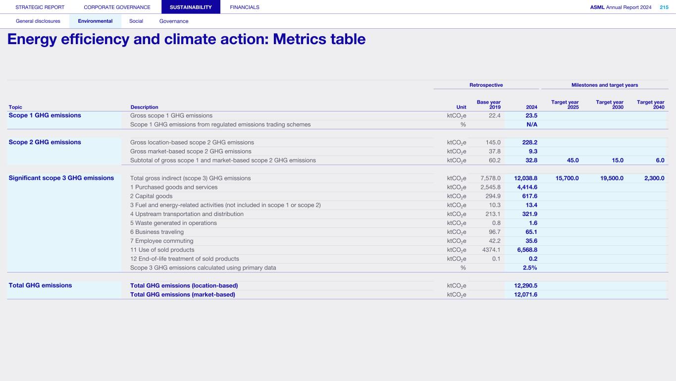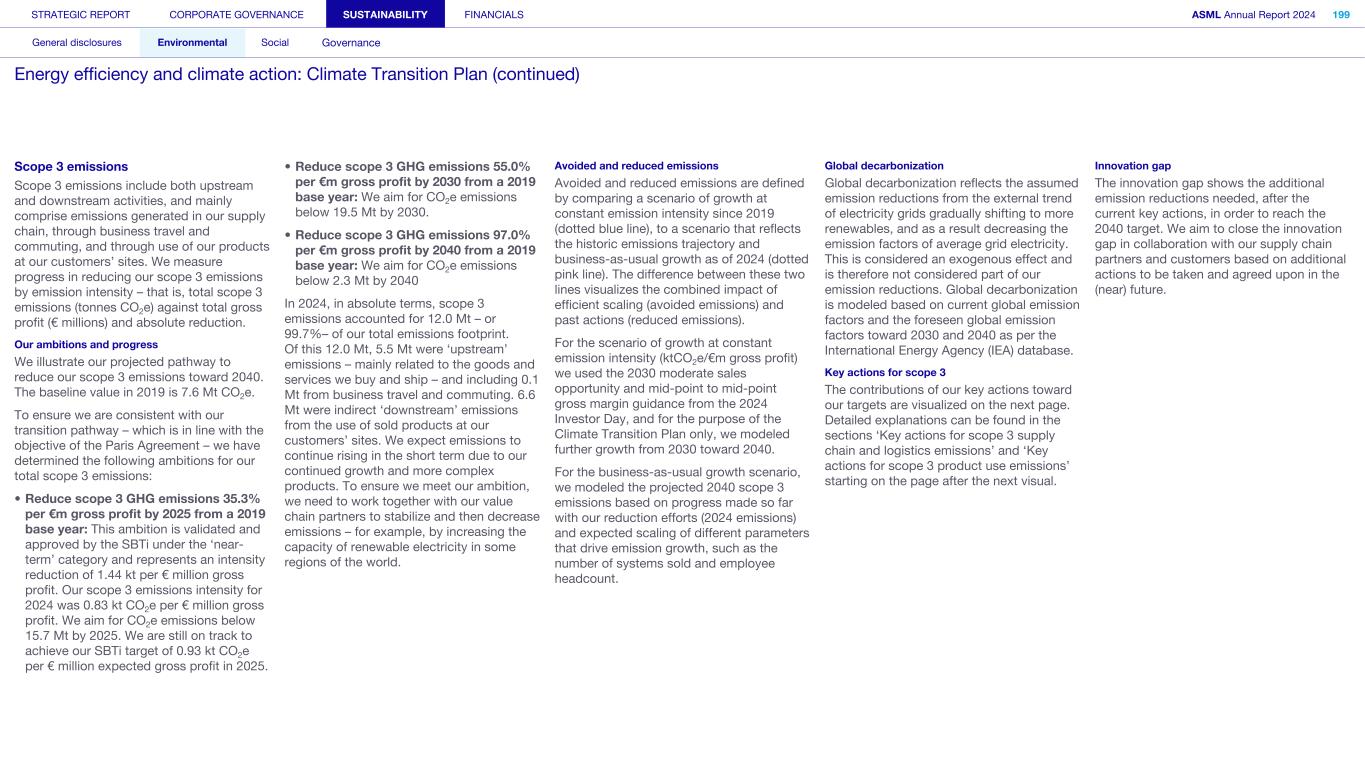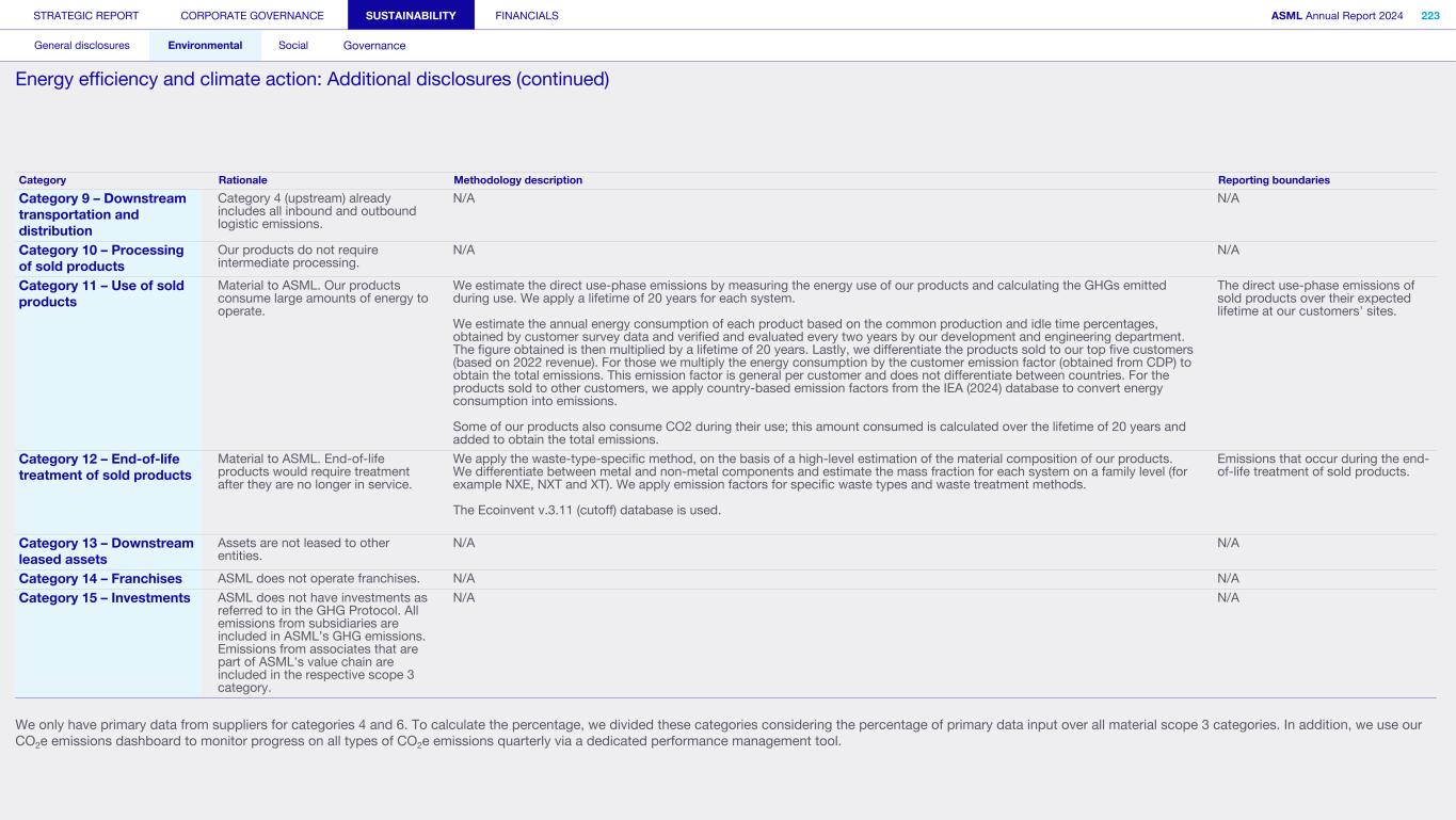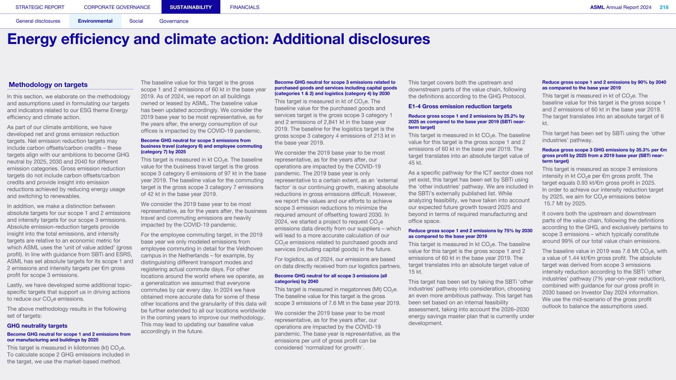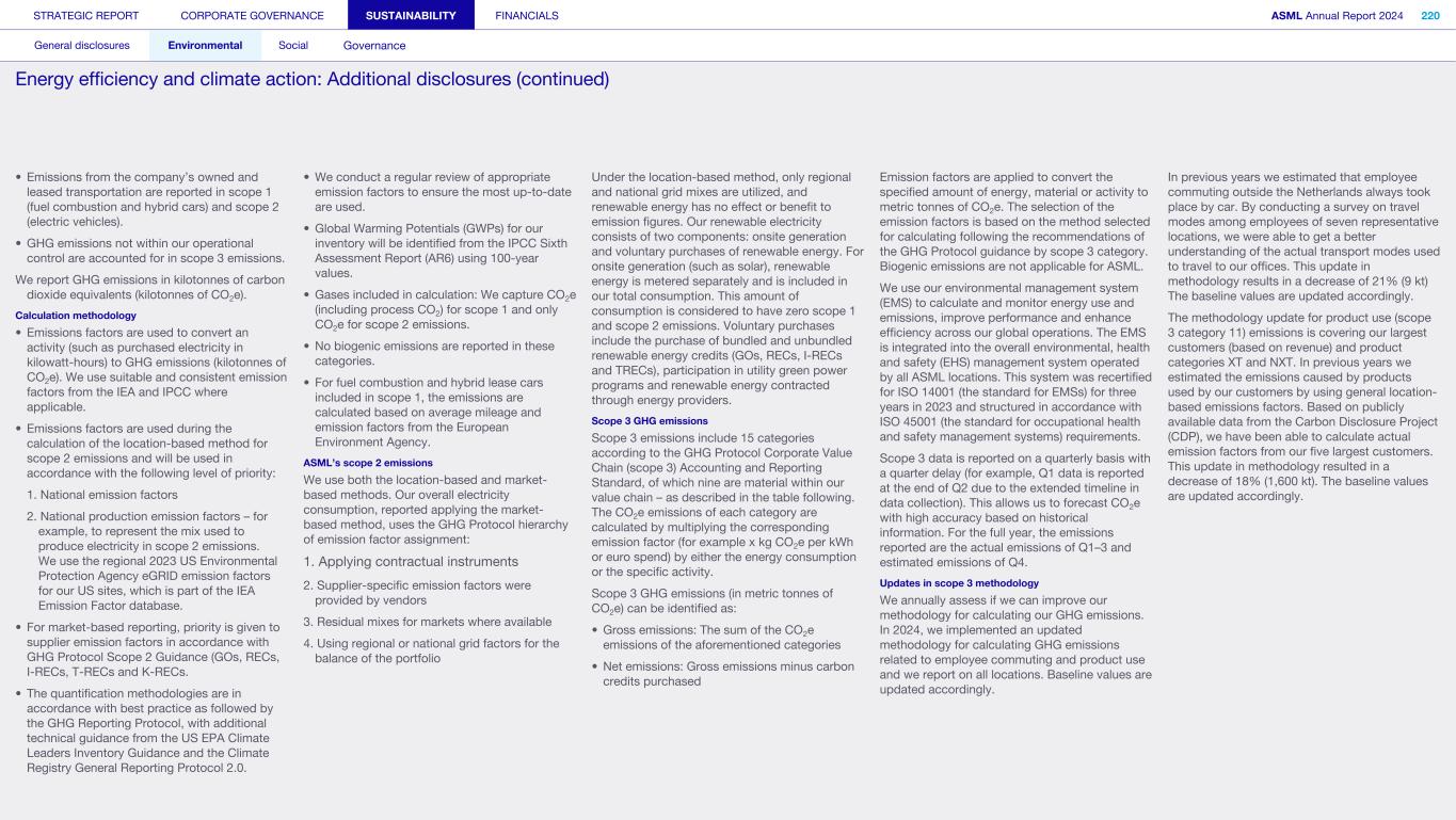 总体而言,本年度报告包含与我们的业务、预期结果、业务和行业趋势、环境目标以及1995年《私人证券诉讼改革法案》含义内的其他“前瞻性”事项有关的陈述。你一般可以通过使用“可能”、“将”、“机会”、“潜力”、“可以”、“应该”、“项目”、“相信”、“预期”、“计划”、“估计”、“预测”、“模型”、“目标”、“寻求”、“打算”、“继续”、“承诺”、“目标”、“未来”、“进展”、“目标”等词语来识别这些陈述,以及这些词语或类似词语的变体。它们出现在本年度报告的多个地方,包括以下方面的陈述:预期趋势、计划、预期、战略、优先事项、目标和前景,预期财务结果,包括2025年第一季度和全年的预期结果,包括对收入、毛利率、估计年化有效税率、按细分市场划分的销售额和净服务和现场期权销售额及其预期驱动因素的预期,以及其他2025年全年预期和前景,对2026年预期收入增长的预期,以及对前景及其预期驱动因素的其他陈述,在2024年投资者日发表的声明,包括2025年和2030年的收入和毛利率机会、模式和潜力以及2025-2030年销售额的年度增长以及对半导体终端市场增长的预期,在题为“长期增长机会”的部分发表的声明,预期资本支出,以及研发支出目标和计划,预期业务和行业趋势和前景,包括预期的半导体行业规模和趋势以及我们客户所服务的市场的趋势、半导体行业和生态系统的预期增长以及到2030年全球半导体销售额的预期、预期的GDP增长、商业环境趋势,包括预期的需求,利用率、库存水平、半导体行业的预期复苏及其预期时间、全球晶圆产能预期增长、对人工智能出现的预期及其对半导体市场的预期影响以及人工智能、电气化和能源转型的预期趋势、半导体终端市场的预期增长和2025和2030年的市场机会以及2025-2030年的前景复合年增长率以及预计将在更长期推动半导体增长的关键驱动因素和全球趋势,在题为“宏观经济和地缘政治趋势”的部分中所作的声明,计划增加全球半导体产能和半导体生态系统的预期增长,摩尔定律和收缩的持续,包括光刻机的预期仍然是摩尔定律的关键驱动因素之一,客户需求的预期趋势,出口管制政策和法规以及对我们的预期影响,我们增加产能的计划,以及预期或计划的产能,对客户工厂中正在运行的系统的预期,对客户使用我们的工具的预期,包括预期系统大批量生产的时间,如Twinscan EXE,产品路线图和客户路线图,我们期望光刻技术将继续成为客户创新、预期生产力和我们工具的其他属性和益处的核心,我们的环境、社会和治理(ESG)和可持续发展战略、计划、承诺和目标,包括排放和废物减少目标、承诺和目标,以及我们对SBTI批准我们的某些目标的目标,以及我们对实现这些目标和其他ESG目标和指标、回收和翻新举措、节能和可再生能源使用战略和目标的期望,包括实现温室气体中和和减排目标的计划和目标、我们实现从运营到填埋和焚烧的零废物的目标以及实现这些目标的目标日期、我们与ESG目标相关的预测所依据的假设以及依赖供应商实现ESG目标以使我们能够实现ESG目标、购买可再生能源和碳信用额的计划、半导体减少温室气体排放的潜力、我们的系统使用更少能源的计划和我们的节能计划,以及多样性和其他ESG目标和承诺,资本分配政策、现金回报和股息政策以及关于我们的股票回购计划和我们提议的2025年股息的声明以及其他非历史声明。这些前瞻性陈述并非历史事实,而是基于当前对业务和未来财务业绩的预期、估计、假设和预测,读者不应过分依赖它们。前瞻性陈述并不能保证未来的业绩, 由于某些风险和不确定性,实际结果可能与预计结果存在重大差异。这些风险和不确定性包括但不限于题为“我们如何管理风险——风险因素”一节中描述的风险和不确定性。这些前瞻性陈述仅在本年度报告发布之日作出。我们不承诺更新或修改前瞻性陈述,无论是由于新信息、未来事件或其他原因。关于减排目标本年度报告包含有关我们在实现某些能效和温室气体减排目标方面的方法和进展的陈述,包括我们实现温室气体中和的雄心。提到“温室气体中性”是指在ASML努力达到其GHG减排目标之后,剩余的排放量将获得根据公认质量标准核实的相同数量的公吨碳信用额的补偿。除非另有说明,本年度报告所载有关温室气体减排目标的信息均基于我们为监测能源使用和排放而实施的内部环境管理系统,以及公开可获得的信息,包括《温室气体议定书》中关于计算GHG排放量的指南、气候相关财务披露(TCFD)工作组的建议和某些转换因子。鉴于可持续发展报表中的此类数据来自不同来源,在我们的运营子公司和部门之间进行了不同的处理,并取决于某些估计和假设,因此此类数据的估计存在固有的不确定性。请注意,不要对这类数据给予不应有的权重。有关温室气体排放和温室气体中和的前瞻性信息受本年度报告“关于前瞻性陈述的特别说明”中所述的限定条件和不确定性的限制。战略报告公司治理可持续发展财务ASML年度报告2024407合并财务报表公司财务报表其他信息附录定义关于前瞻性陈述的特别说明