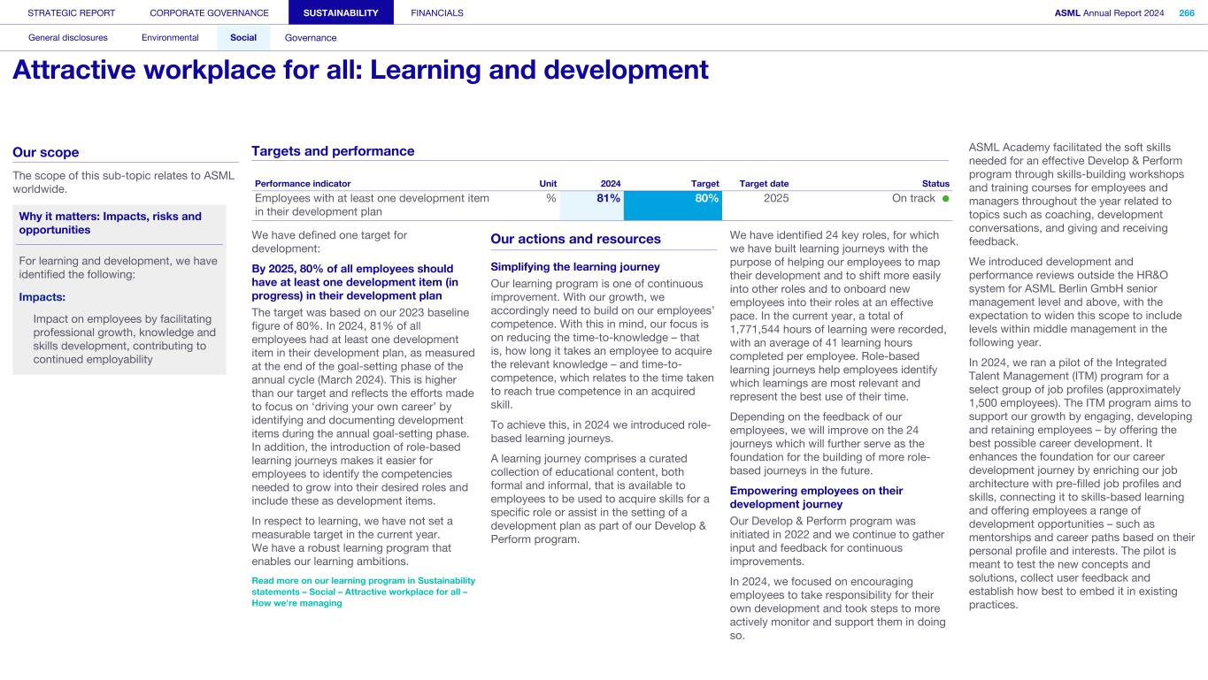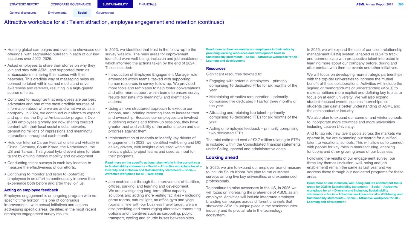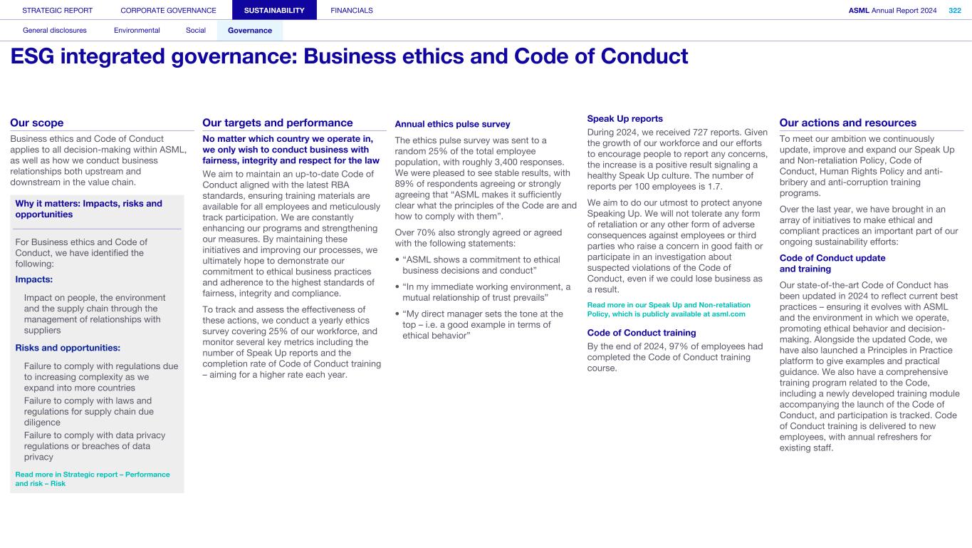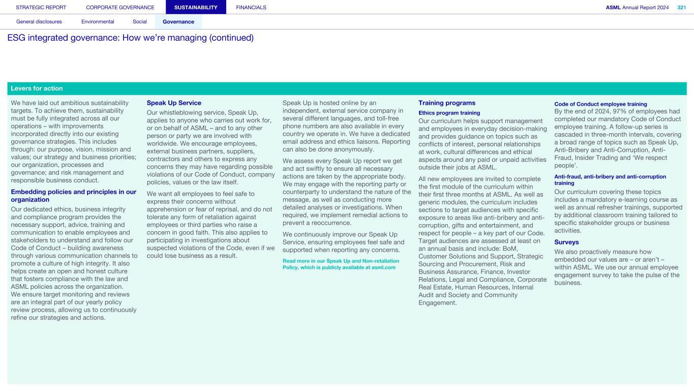 行动杠杆我们制定了雄心勃勃的可持续发展目标。为了实现这些目标,可持续性必须完全融入我们所有的运营——改进直接纳入我们现有的治理战略。这包括通过:我们的宗旨、愿景、使命和价值观;我们的战略和业务优先事项;我们的组织、流程和治理;以及风险管理和负责任的业务行为。将政策和原则嵌入我们的组织我们专注的道德、商业诚信和合规计划提供必要的支持、建议、培训和沟通,使员工和利益相关者能够理解并遵守我们的行为准则——通过各种沟通渠道建立意识,以促进高度诚信的文化。它还有助于创造一种开放和诚实的文化,以促进整个组织遵守法律和ASML政策。我们确保目标监测和审查是我们年度政策审查过程的一个组成部分,使我们能够不断完善我们的战略和行动。Speak Up Service我们的举报服务Speak Up适用于为或代表ASML开展工作的任何人–以及我们在全球范围内参与的任何其他人或方。我们鼓励员工、外部业务合作伙伴、供应商、承包商和其他人表达他们对可能违反我们的行为准则、公司政策、价值观或法律本身的任何担忧。我们希望所有员工都能放心地表达他们的担忧,而不必担心或害怕报复,不容忍对善意提出担忧的员工或第三方进行任何形式的报复。这也适用于参与有关涉嫌违反《守则》的调查,即使我们可能因此失去业务。Speak Up由一家独立的外部服务公司以几种不同的语言在线托管,我们运营的每个国家也提供免费电话号码。我们有一个专用的电子邮件地址和道德联络员。报告也可以匿名进行。我们评估收到的每一份Speak Up报告,并迅速采取行动,以确保适当机构采取所有必要行动。我们可能会与报告方或交易对手接触,以了解消息的性质,以及进行更详细的分析或调查。在需要时,我们实施补救行动,以防止再次发生。我们不断改进我们的Speak Up服务,确保员工在报告任何问题时感到安全和得到支持。更多信息请阅读我们的直言和不报复政策,该政策可在ASML网站上公开获取。培训项目伦理项目培训我们的课程有助于支持管理层和员工的日常决策,并就围绕他们在ASML工作之外的任何有偿或无偿活动的利益冲突、工作中的个人关系、文化差异和伦理方面等主题提供指导。所有新员工都被邀请在他们在ASML的前三个月内完成课程的第一个模块。除了通用模块外,该课程还包括针对特定接触过反贿赂和反腐败、礼物和娱乐以及尊重他人等领域的受众的部分——这是我们守则的关键部分。目标受众至少每年进行一次评估,包括:BOM、客户解决方案和支持、战略采购和采购、风险和业务保证、财务、投资者关系、法律和合规、企业房地产、人力资源、内部审计以及社会和社区参与。行为准则员工培训截至2024年底,97%的员工完成了我们的强制性行为准则员工培训。后续系列以三个月为间隔级联,涵盖畅所欲言、反贿赂反腐败、反诈骗、内幕交易和‘我们尊重人’等广泛话题。反欺诈、反贿赂和反腐败培训我们涵盖这些主题的课程包括必修的电子学习课程以及年度进修培训,并辅以针对特定利益相关者群体或商业活动的额外课堂培训。调查我们还主动衡量我们的价值观是否嵌入到ASML中。我们用我们的年度员工敬业度调查来把脉业务。战略报告公司治理可持续发展金融公司ASML年度报告2024321一般披露环境社会治理ESG一体化治理:我们是如何管理的(续)