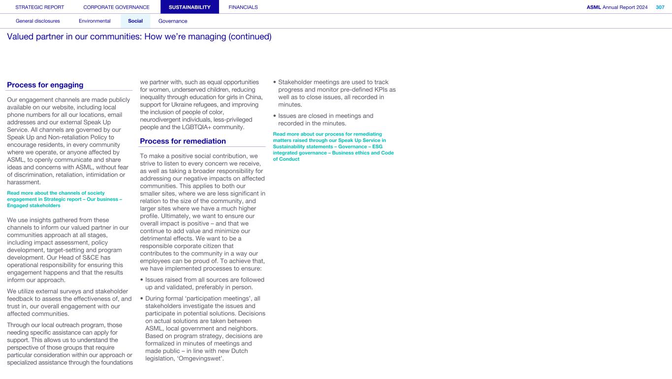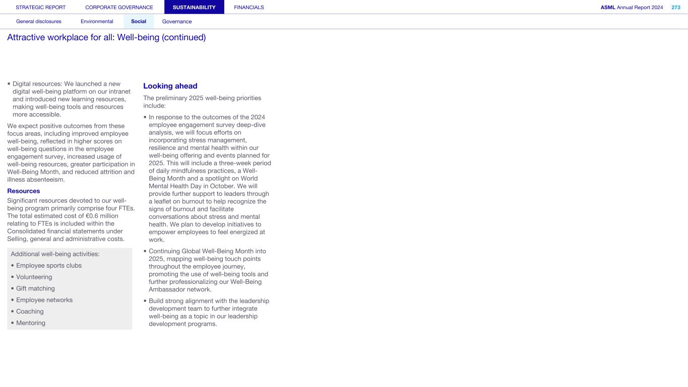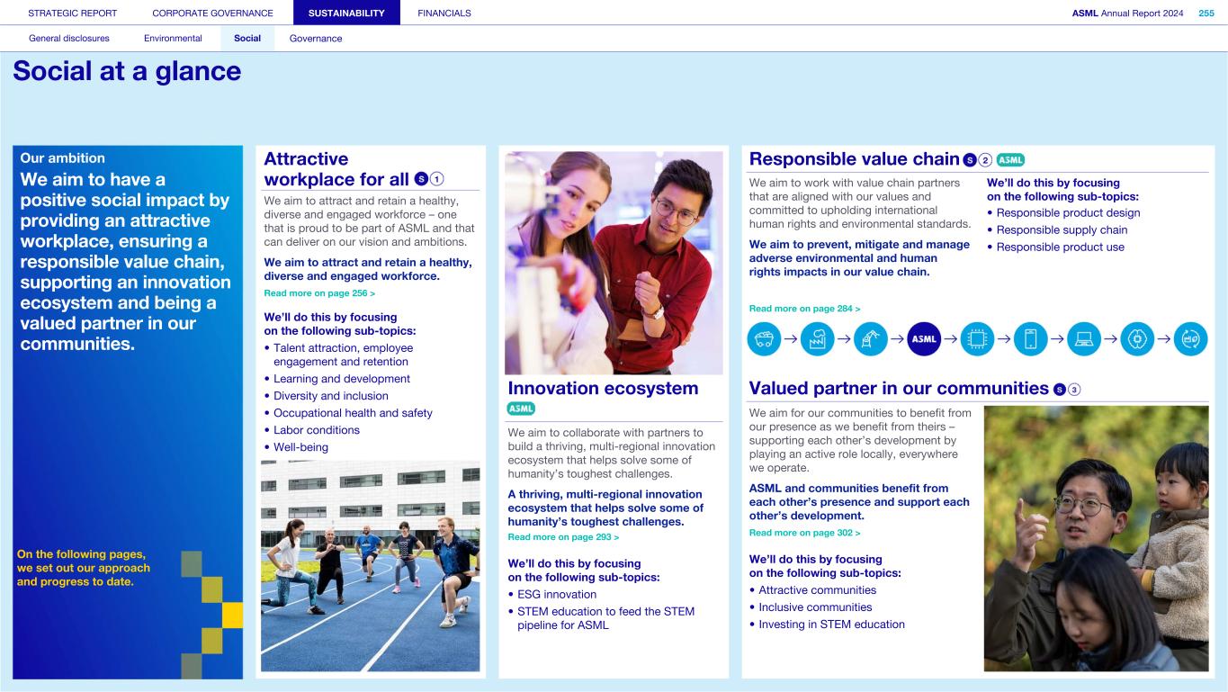 我们的雄心强有力的治理建立强大的企业。我们的目标是实施保持最高诚信标准的政策,为我们的利益相关者创造长期价值,并帮助建设一个更公平、更有凝聚力的社会。在接下来的几页中,我们阐述了我们迄今为止的方法和进展。ESG一体化治理我们的目标是让可持续发展成为所有常规日常决策的一部分,并履行我们的ESG可持续发展使命和责任。ESG是所有常规、日常决策的一部分。更多阅读第318页>我们将通过关注以下子主题来做到这一点:•负责任的商业行为和合规(涵盖遵守商业道德和行为准则以及反贿赂和反腐败)战略报告公司治理可持续性财务负责人2024年度报告317一般性披露环境社会治理一览透明报告我们公开透明,在推动进步的同时与利益相关者建立信任。我们对综合报告的承诺反映了我们的观点,即我们的ESG相关信息与我们的财务信息同样重要。根据我们的利益相关者的说法,‘公开透明’的报告。我们将通过以下方式做到这一点:•内部报告和沟通•外部报告和沟通让利益相关者参与我们希望被我们的利益相关者视为ESG可持续性方面表现最好的人,因为我们依赖于在整个价值链中与他们建立牢固、可持续的关系。我们的利益相关者将ASML视为ESG可持续发展方面表现最佳的公司。我们将通过关注以下利益相关者群体来做到这一点:•客户•员工•供应商•股东•社会在战略报告–我们的业务–第44页参与的利益相关者中阅读更多>