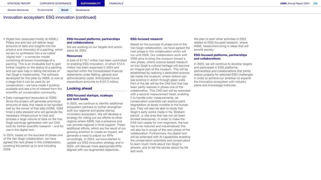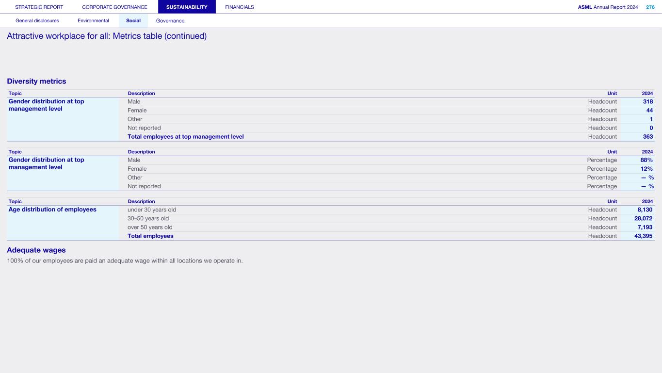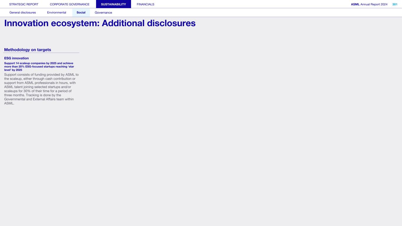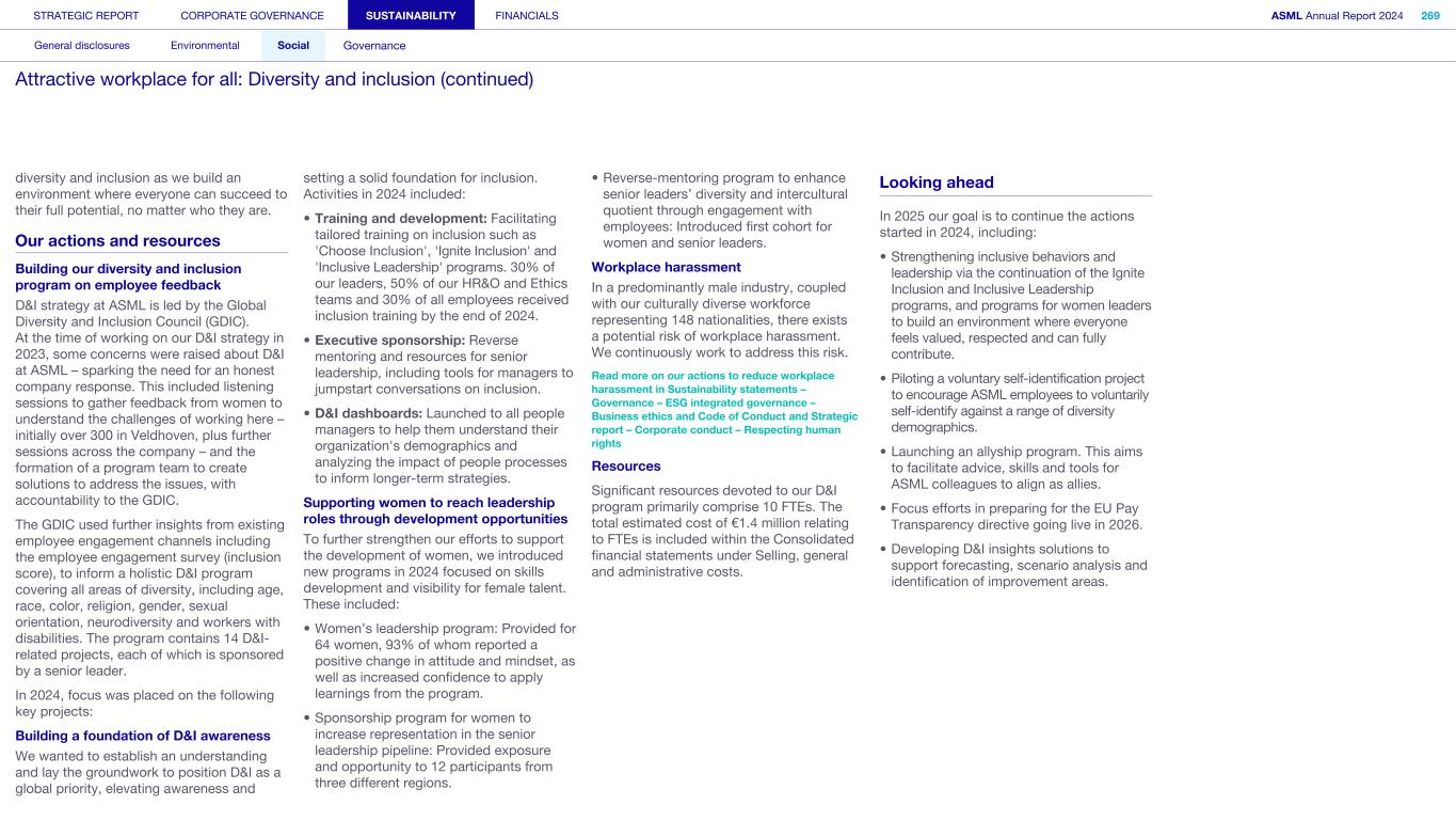 我们的雄心强有力的治理建立强大的企业。我们的目标是实施保持最高诚信标准的政策,为我们的利益相关者创造长期价值,并帮助建设一个更公平、更有凝聚力的社会。在接下来的几页中,我们阐述了我们迄今为止的方法和进展。ESG一体化治理我们的目标是让可持续发展成为所有常规日常决策的一部分,并履行我们的ESG可持续发展使命和责任。ESG是所有常规、日常决策的一部分。更多阅读第318页>我们将通过关注以下子主题来做到这一点:•负责任的商业行为和合规(涵盖遵守商业道德和行为准则以及反贿赂和反腐败)战略报告公司治理可持续性财务负责人2024年度报告317一般性披露环境社会治理一览透明报告我们公开透明,在推动进步的同时与利益相关者建立信任。我们对综合报告的承诺反映了我们的观点,即我们的ESG相关信息与我们的财务信息同样重要。根据我们的利益相关者的说法,‘公开透明’的报告。我们将通过以下方式做到这一点:•内部报告和沟通•外部报告和沟通让利益相关者参与我们希望被我们的利益相关者视为ESG可持续性方面表现最好的人,因为我们依赖于在整个价值链中与他们建立牢固、可持续的关系。我们的利益相关者将ASML视为ESG可持续发展方面表现最佳的公司。我们将通过关注以下利益相关者群体来做到这一点:•客户•员工•供应商•股东•社会在战略报告–我们的业务–第44页参与的利益相关者中阅读更多>