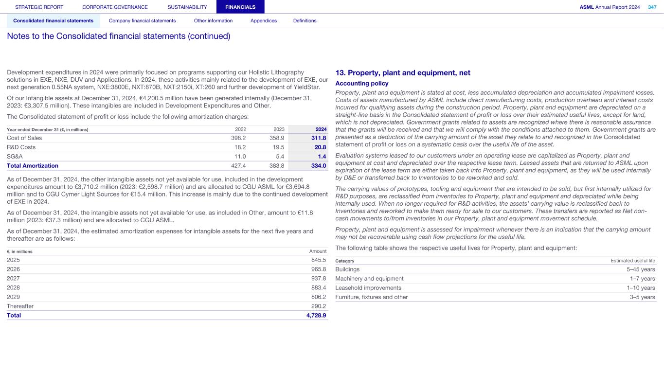 2024年的开发支出主要集中在支持我们在EXE、NXE、DUV和应用中的整体光刻解决方案的项目上。在2024年,这些活动主要涉及EXE、我们的下一代0.55NA系统、NXE:3800E、NXT:870B、NXT:2150i、XT:260的开发以及YieldStar的进一步开发。截至2024年12月31日,我们的无形资产中有42.005亿欧元是内部产生的(2023年12月31日:33.075亿欧元)。这些无形资产列入发展支出和其他。合并损益表包括以下摊销费用:截至12月31日止年度(欧元,百万)202220232024销售成本398.2358.93 11.8研发成本18.2 19.52 0.8 SG & A 11.05.4 1.4摊销总额427.4383.83 34.0截至2024年12月31日,其他尚未可供使用的无形资产,包括在开发支出中的金额为37.102亿欧元(2023年:25.987亿欧元),以36.948亿欧元分配给CGU ASML,以1540万欧元分配给CGU Cymer Light Sources。这一增长主要是由于2024年EXE的持续发展。截至2024年12月31日,包括在“其他”中的尚未可供使用的无形资产为1180万欧元(2023年:3730万欧元),分配给CGU ASML。截至2024年12月31日,未来五年及以后无形资产的估计摊销费用如下:欧元,单位:百万金额2025845.5 2026965.8 2027937.8 2028883.42029806.2其后290.2合计4,728.913。固定资产、工厂及设备,净值净额会计政策物业、厂房及设备按成本减累计折旧及累计减值亏损列账。ASML制造的资产的成本包括直接制造成本、生产间接费用以及符合条件的资产在建设期内发生的利息成本。物业、厂房及设备按估计可使用年限在综合损益表中按直线法折旧,但土地除外,不计提折旧。与资产相关的政府补助在有合理保证将收到补助且我们将遵守附加条件的情况下予以确认。政府补助列报为扣除与其相关的资产的账面值,并在该资产的使用寿命内系统地在综合损益表中确认。根据经营租赁出租给我们客户的评估系统按成本资本化为物业、厂房和设备,并在相应的租赁期内折旧。租赁期届满时返还给ASML的租赁资产要么被收回物业、厂房和设备,因为它们将由D & E内部使用,要么被转回存货进行返工和出售。打算出售但首先在内部用于研发目的的原型、工具和设备的账面价值从存货重新分类为物业、厂房和设备,并在内部使用时进行折旧。当研发活动不再需要时,资产的账面价值将重新分类回存货并重新加工,使其可以出售给我们的客户。这些转移在我们的物业、厂房和设备移动时间表中报告为进出存货的净非现金移动。每当有迹象显示账面值可能无法使用可使用年期现金流量预测收回时,物业、厂房及设备均会进行减值评估。下表分别列示了物业、厂房及设备的使用年限:类别预计使用年限建筑物5 – 45年机械设备1 – 7年租赁物改良1 – 10年家具、固定装置等3 – 5年战略报告公司治理可持续性金融ASML 2024347年度报告合并财务报表公司财务报表其他信息附录定义合并财务报表附注(续)