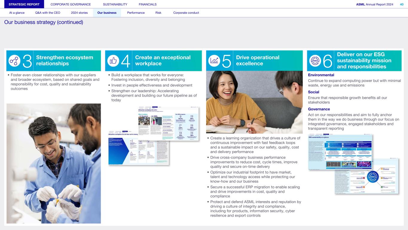 3加强生态系统关系•基于对成本、质量和可持续性成果的共同目标和责任,促进与我们的供应商和更广泛的生态系统建立更密切的关系4创建卓越的工作场所•建立一个适合所有人的工作场所:促进包容性、多样性和归属感•投资于人的有效性和发展•加强我们的领导力:加速发展并从今天起建立我们的未来管道5推动卓越运营•创建一个学习型组织,以快速反馈循环和对我们的安全、质量产生可持续影响的方式推动持续改进的文化,成本和交付绩效•推动跨公司业务绩效改进,以降低成本、周期时间、提高质量并确保按时交付•优化我们的工业足迹,使其能够获得市场、人才和技术,同时保护我们的专有技术和业务•确保成功的ERP迁移,以实现扩展并推动成本、质量和合规方面的改进•通过推动诚信和合规文化,保护和捍卫ASML利益和声誉,包括为产品、信息安全、网络复原力和出口控制履行我们的ESG可持续发展使命和责任6 Environmental继续扩大计算能力,但浪费、能源使用和排放降至最低社会确保负责任的增长使我们所有利益相关者受益治理行动履行我们的责任,并旨在通过我们对综合治理的关注、参与的利益相关者和透明的报告战略报告,将他们完全锚定在我们开展业务的方式中公司治理可持续发展财务2024年度报告40与CEO问答一览2024故事我们的业务绩效风险公司行为我们的业务战略(续)