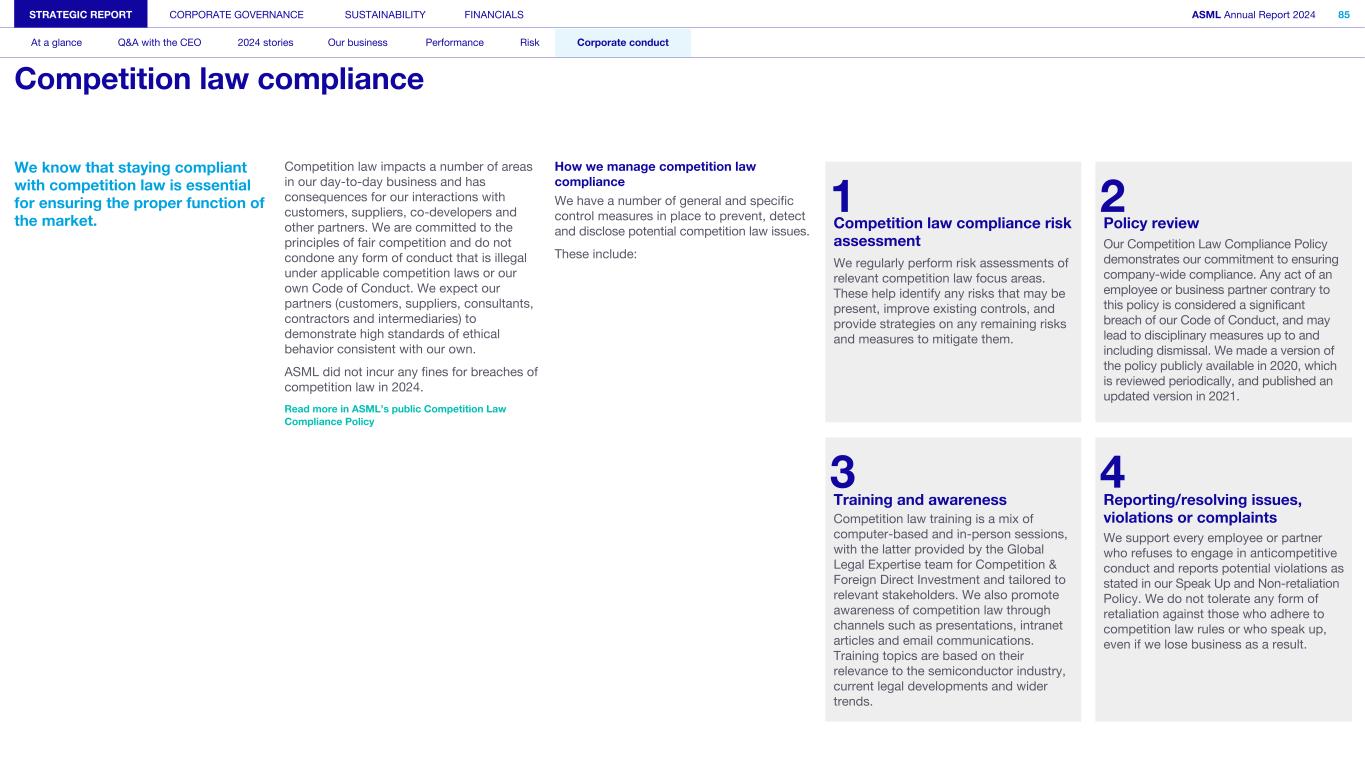 我们知道,遵守竞争法对于确保市场正常运行至关重要。竞争法影响我们日常业务中的许多领域,并对我们与客户、供应商、共同开发者和其他合作伙伴的互动产生影响。我们致力于公平竞争原则,不容忍任何形式的行为,根据适用的竞争法或我们自己的行为准则是非法的。我们希望我们的合作伙伴(客户、供应商、顾问、承包商和中介)表现出与我们自己一致的高标准道德行为。ASML在2024年没有因违反竞争法而受到任何罚款。更多信息请阅读ASML的公共竞争法合规政策我们如何管理竞争法合规我们制定了许多一般性和特定的控制措施,以防止、发现和披露潜在的竞争法问题。其中包括:战略报告公司治理可持续发展财务ASML年度报告202485与CEO问答一览2024故事我们的业务绩效风险公司行为竞争法合规12竞争法合规风险评估政策审查我们的竞争法合规政策表明我们致力于确保全公司范围的合规。员工或业务合作伙伴违反本政策的任何行为均被视为严重违反我们的行为准则,并可能导致直至并包括解雇的纪律措施。我们在2020年公开了政策的一个版本,定期审查,并在2021年发布了更新版本。我们定期对相关竞争法重点领域进行风险评估。这些有助于识别可能存在的任何风险,改进现有控制措施,并就任何剩余风险和减轻风险的措施提供策略。34培训和意识报告/解决问题、违规或投诉竞争法培训是基于计算机的和面对面的课程的混合,后者由竞争和外国直接投资全球法律专家团队提供,并为相关利益攸关方量身定制。我们还通过宣讲会、内网文章和电子邮件通讯等渠道,促进对竞争法的认识。培训主题基于其与半导体行业的相关性、当前的法律发展和更广泛的趋势。我们支持每一位拒绝从事反竞争行为并报告我们的直言和不报复政策中所述潜在违规行为的员工或合作伙伴。我们不容忍对那些遵守竞争法规则或直言不讳的人进行任何形式的报复,即使我们因此失去了生意。