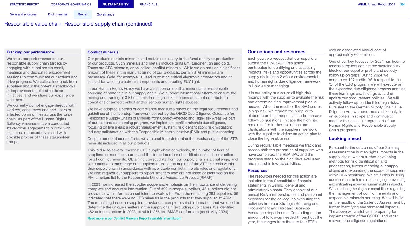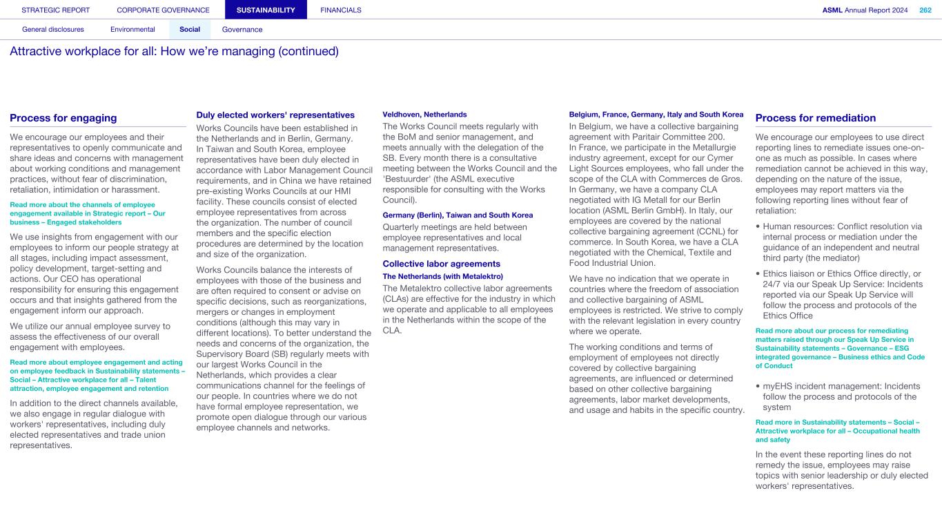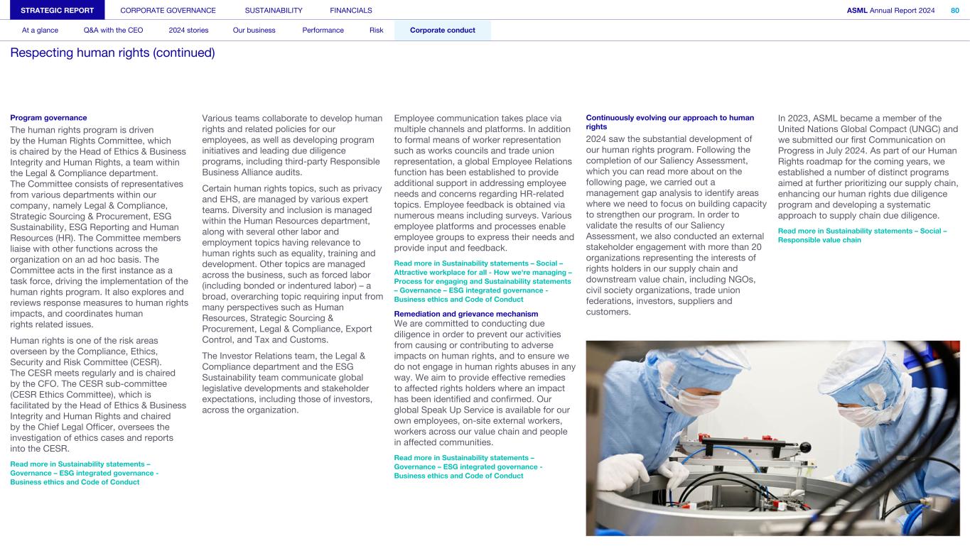 方案治理人权方案由人权委员会推动,该委员会由道德与商业诚信和人权负责人担任主席,这是法律与合规部门的一个团队。该委员会由来自我们公司内部各个部门的代表组成,分别是法律与合规、战略采购与采购、ESG可持续发展、ESG报告和人力资源(HR)。委员会成员临时与整个组织的其他职能进行联络。该委员会作为一个特别工作组首先采取行动,推动人权方案的实施。它还探索和审查对人权影响的应对措施,并协调与人权有关的问题。人权是合规、道德、安全和风险委员会(CESR)监督的风险领域之一。CESR定期开会,由CFO担任主席。CESR小组委员会(CESR Ethics Committee)由Ethics & Business Integrity and Human Rights负责人协助并由首席法务官担任主席,负责监督道德案例的调查并向CESR提交报告。在可持续发展声明–治理– ESG综合治理-商业道德和行为准则中阅读更多信息各个团队合作为我们的员工制定人权和相关政策,以及制定计划举措和领先的尽职调查计划,包括第三方负责任的商业联盟审计。某些人权议题,例如隐私和EHS,由不同的专家团队管理。多样性和包容性在人力资源部门内进行管理,还有其他几个与人权相关的劳动和就业主题,例如平等、培训和发展。其他主题是跨业务管理的,例如强迫劳动(包括保税或契约劳动)——这是一个广泛的、总体的主题,需要从人力资源、战略采购和采购、法律与合规、出口管制以及税务和海关等多个角度进行投入。投资者关系团队、法律与合规部门和ESG可持续发展团队在整个组织中交流全球立法发展和利益相关者的期望,包括投资者的期望。员工沟通通过多种渠道和平台进行。除了正式的工人代表方式,如工作委员会和工会代表,还建立了全球员工关系职能,以提供额外支持,解决员工对人力资源相关主题的需求和关切。员工反馈是通过包括调查在内的众多手段获得的。各种员工平台和流程使员工群体能够表达他们的需求并提供输入和反馈。阅读更多可持续发展声明–社会–对所有人都有吸引力的工作场所-我们如何管理–参与和可持续发展声明的流程–治理– ESG综合治理-商业道德和行为准则补救和申诉机制我们致力于开展尽职调查,以防止我们的活动对人权造成或促成不利影响,并确保我们不以任何方式从事侵犯人权的行为。我们的目标是在已确定并确认影响的情况下,向受影响的权利持有人提供有效的补救措施。我们的全球Speak Up服务适用于我们自己的员工、现场外部员工、我们价值链中的员工以及受影响社区的人们。阅读更多可持续发展声明–治理– ESG综合治理-商业道德和行为准则不断演变我们的人权方法2024年见证了我们人权计划的实质性发展。在完成我们的显着评估(您可以在下一页阅读更多内容)之后,我们进行了管理差距分析,以确定我们需要专注于能力建设以加强我们的计划的领域。为了验证我们的显着评估结果,我们还与20多个代表我们供应链和下游价值链权利人利益的组织进行了外部利益相关者接触,其中包括非政府组织、民间社会组织、工会联合会、投资者、供应商和客户。2023年,ASML成为联合国全球契约(UNGC)的成员,我们于2024年7月提交了第一份关于进展的来文。作为我们未来几年人权路线图的一部分,我们制定了一些不同的计划,旨在进一步优先考虑我们的供应链, 加强我们的人权尽职调查计划,并制定系统的供应链尽职调查方法。在可持续发展声明中阅读更多内容–社会–负责任的价值链战略报告企业治理可持续发展财务公司2024年度报告80与首席执行官问答一览2024故事我们的业务绩效风险尊重人权的企业行为(续)