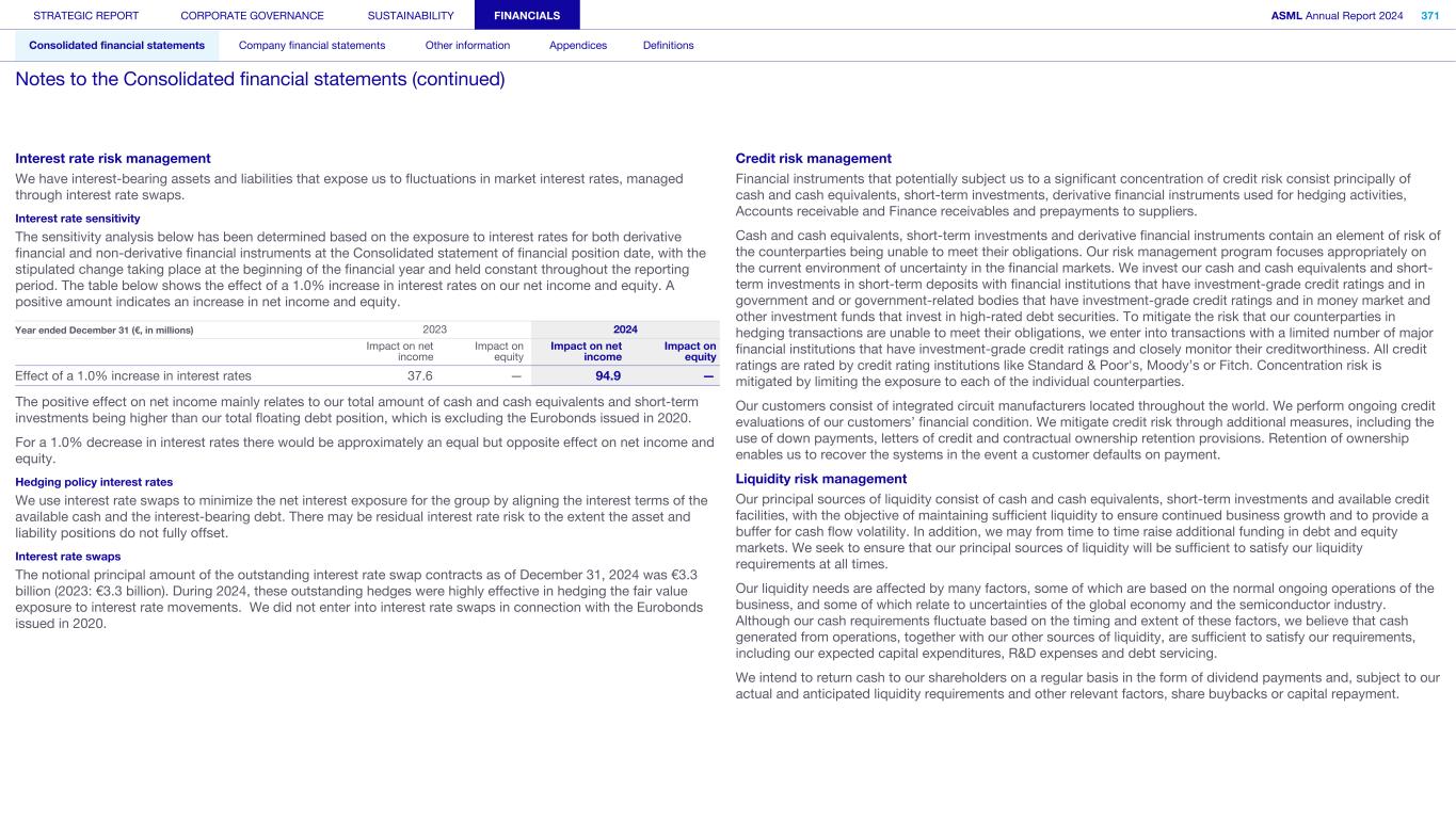 利率风险管理我们有使我们面临市场利率波动的生息资产和负债,通过利率互换进行管理。利率敏感性下文的敏感性分析是根据综合财务状况表日衍生金融工具和非衍生金融工具的利率敞口确定的,规定的变化发生在财政年度开始时,并在整个报告期间保持不变。下表显示了加息1.0%对我们的净收入和权益的影响。金额为正表示净收入和权益增加。截至12月31日止年度(欧元,百万)20232024年对净收入的影响对权益的影响对净收入的影响对权益的影响利率上升1.0%的影响37.6 — 94.9 —对净收入的正面影响主要与我们的现金和现金等价物以及短期投资总额高于我们的总浮动债务头寸有关,其中不包括2020年发行的欧洲债券。利率下降1.0%,对净收入和权益的影响大致相等,但相反。对冲政策利率我们使用利率互换,通过调整可用现金和有息债务的利息条款,最大限度地减少集团的净利息敞口。资产负债头寸未完全抵消的情况下,可能存在剩余利率风险。利率掉期截至2024年12月31日,未偿还利率掉期合约的名义本金金额为33亿欧元(2023年:33亿欧元)。在2024年期间,这些未完成的对冲非常有效地对冲了利率变动的公允价值风险。我们没有就2020年发行的欧洲债券进行利率互换。信用风险管理可能使我们面临重大集中信用风险的金融工具主要包括现金和现金等价物、短期投资、用于套期保值活动的衍生金融工具、应收账款和应收融资款以及对供应商的预付款。现金及现金等价物、短期投资和衍生金融工具包含交易对手无法履行其义务的风险要素。我们的风险管理计划适当侧重于当前金融市场的不确定性环境。我们将我们的现金和现金等价物以及短期投资投资于具有投资级信用评级的金融机构的短期存款以及投资于具有投资级信用评级的政府和/或政府相关机构以及投资于高评级债务证券的货币市场和其他投资基金。为减轻我们的对冲交易对手无法履行其义务的风险,我们与有限数量的具有投资级信用评级并密切监控其信用度的主要金融机构进行交易。所有信用评级都由标准普尔、穆迪或惠誉等信用评级机构进行评级。通过限制对每个单独交易对手的风险敞口,可以减轻集中风险。我们的客户包括分布在世界各地的集成电路制造商。我们对客户的财务状况进行持续的信用评估。我们通过额外措施降低信用风险,包括使用首付款、信用证和合同所有权保留条款。保留所有权使我们能够在客户拖欠付款的情况下恢复系统。流动性风险管理我们的主要流动性来源包括现金和现金等价物、短期投资和可用的信贷额度,目标是保持充足的流动性,以确保业务持续增长,并为现金流波动提供缓冲。此外,我们可能会不时在债务和股票市场筹集额外资金。我们力求确保我们的主要流动性来源将足以满足我们在任何时候的流动性需求。我们的流动性需求受到许多因素的影响,其中一些因素是基于业务的正常持续运营,还有一些因素与全球经济和半导体行业的不确定性有关。尽管我们的现金需求会根据这些因素的时间和程度而波动,但我们认为,运营产生的现金,连同我们的其他流动性来源,足以满足我们的需求,包括我们预期的资本支出、研发费用和偿债。我们打算以股息支付的形式定期向我们的股东返还现金,并且, 根据我们实际和预期的流动性需求和其他相关因素,股票回购或资本偿还。战略报告公司治理可持续发展金融公司ASML年度报告2024371合并财务报表公司财务报表其他信息附录定义合并财务报表附注(续)