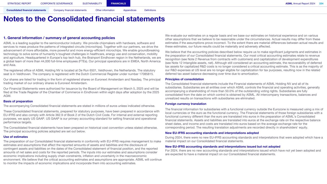 1.一般信息/一般会计政策摘要ASML是半导体行业的领先供应商。我们为芯片制造商提供硬件、软件和服务,以批量生产集成电路(microchips)的图案。与我们的合作伙伴一起,我们推动更实惠、更强大、更节能的微芯片的发展。我们使突破性技术能够解决人类在医疗保健、能源使用和保护、流动性和农业方面的一些最严峻挑战。我们的总部设在欧洲顶级科技中心——位于荷兰的Brainport Eindhoven地区,是一支由超过44,000名全职员工(FTE)组成的全球团队。我们的主要业务在欧洲、中东和非洲、北美和亚洲。阿斯麦 NV的注册办事处位于De Run 6501,Veldhoven,Netherlands。法定席位在Veldhoven。该公司在荷兰商业登记处注册,编号为17085815。我们的股票以注册股票的形式在阿姆斯特丹泛欧交易所和纳斯达克上市交易。我们普通股的主要交易市场是阿姆斯特丹泛欧交易所。我们的财务报表于2025年3月5日由管理委员会授权发布,并将在2025年年度股东大会通过后的八天内在埃因霍温商会的贸易登记处备案。编制基础除非另有说明,所附合并财务报表以百万欧元为单位列报。这些为法定目的编制的合并财务报表是根据欧盟国际财务报告准则编制的,也符合荷兰民法典第2册第362.9条的规定。出于内部和外部报告目的,我们采用美国公认会计原则。美国通用会计准则是我们设定财务和运营业绩目标的主要会计标准。除非另有说明,否则合并财务报表均按历史成本惯例编制。采用的主要会计政策载列如下。使用估计按照欧盟-国际财务报告准则编制我们的合并财务报表要求管理层做出估计和假设,这些估计和假设会影响资产和负债的报告金额以及在合并财务状况表日期披露的或有资产和负债,以及报告期间的净销售额和成本的报告金额。我们的估计和假设的输入考虑了经济影响,包括供应链限制、通货膨胀和宏观经济环境的不确定性。我们认为,关键的会计估计和假设是适当的。ASML将继续监测经济影响的影响并将其纳入会计估计。我们定期评估我们的估计,我们的估计基于历史经验和我们认为在当时情况下合理的各种其他假设。如果假设证明不正确,实际结果可能与这些估计不同。如果实际结果与这些估计之间存在重大差异,我们未来的结果可能会受到重大不利影响。我们认为,下文所述的会计政策要求我们在编制合并财务报表时作出重大判断和估计。我们最关键的会计估计与收入确认(见附注2与客户的合同产生的收入)和开发支出资本化(见附注12)有关。虽然仍被视为会计估计,但资本化研发成本的递延所得税资产的可收回性不再被视为关键会计估计。这是因为我们在美国一级的大部分研发费用不再有资格用于税收目的的资本化,导致现在相关的递延所得税资产余额由于摊销而随着时间的推移而减少。合并原则合并财务报表包括阿斯麦 NV及其所有子公司的财务报表。子公司是指ASML控制财务和经营活动的所有实体,一般伴随持股比例超过50.0%的已行使表决权。自ASML获得控制权之日起,子公司全部并表。所有公司间交易, 与子公司交易的余额和未实现结果被消除。外币换算在欧元区以外以记账本位币为记账本位币的子公司的财务信息,采用当地货币或以欧元为记账本位币的组合计量。那些功能货币不同于欧元的外国子公司的财务报表,在编制ASML的合并财务报表时,均采用欧元换算。资产和负债按各自资产负债表日的汇率折算成欧元,收入和成本按相应期间的平均汇率折算成欧元。由此产生的换算调整直接记入股东权益。2024年期间采用的新的欧盟-IFRS会计准则和解释,没有采用对我们的合并财务报表产生重大影响的新的欧盟-IFRS会计准则和解释。针对2024年发布但未被采纳的新的欧盟-国际财务报告准则会计准则和解释,没有发布尚未被采纳的新的会计准则和解释,预计将对我们的合并财务报表产生重大影响。战略报告公司治理可持续发展金融学ASML年度报告2024334合并财务报表公司财务报表其他信息附录定义合并财务报表附注