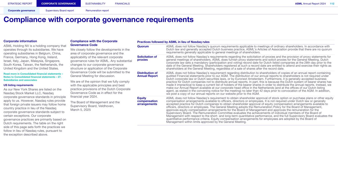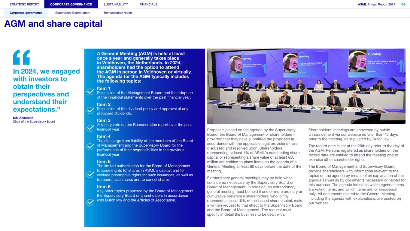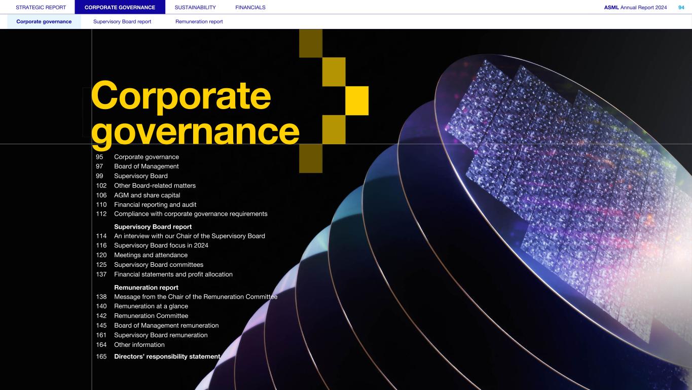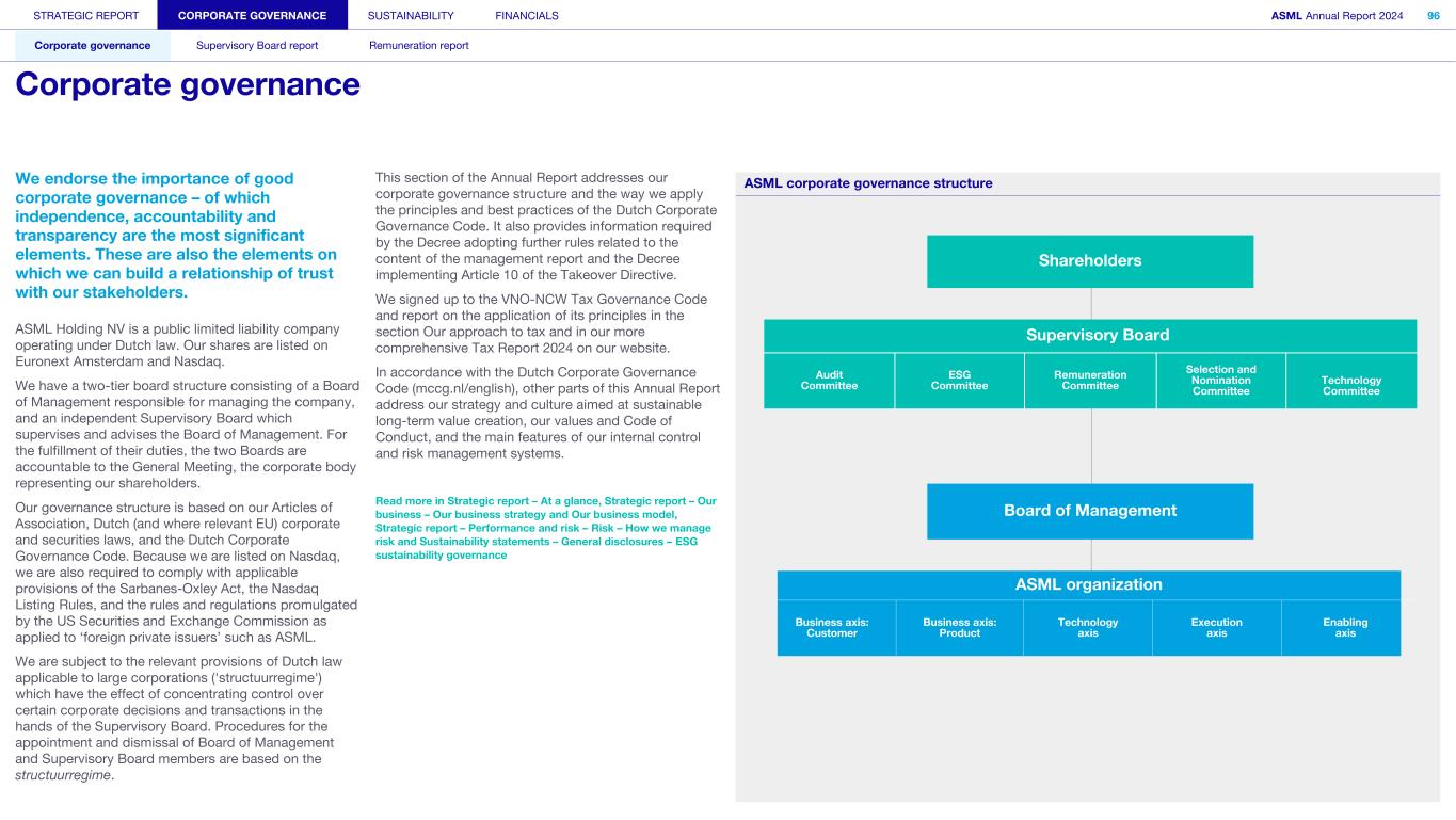 我们赞同良好公司治理的重要性——其中独立性、问责制和透明度是最重要的要素。这些也是我们可以与利益相关者建立信任关系的要素。阿斯麦 NV是一家根据荷兰法律运营的公共有限责任公司。我们的股票在阿姆斯特丹泛欧交易所和纳斯达克上市。我们有一个双层董事会结构,由负责管理公司的管理委员会和监督管理委员会并向其提供建议的独立监事会组成。为了履行职责,两个董事会对代表我们股东的法人大会负责。我们的治理结构基于我们的公司章程、荷兰(以及相关的欧盟)公司和证券法以及荷兰公司治理准则。因为我们是在纳斯达克上市的,所以我们还需要遵守《萨班斯-奥克斯利法案》、《纳斯达克上市规则》的适用条款,以及美国证券交易委员会颁布的适用于ASML等‘外国私人发行人’的规则和条例。我们须遵守适用于大公司的荷兰法律的相关规定(‘structuurregime’),这些规定具有将对某些公司决策和交易的控制权集中在监事会手中的效果。管理委员会和监事会成员的任免程序以结构制度为基础。年度报告的这一部分阐述了我们的公司治理结构以及我们应用荷兰公司治理准则的原则和最佳实践的方式。它还提供了通过与管理报告内容和实施收购指令第10条的法令相关的进一步规则的法令所要求的信息。我们签署了VNO-NCW税收治理准则,并在我们的网站上的我们的税收方法部分和我们更全面的2024年税收报告中报告了其原则的应用情况。根据荷兰公司治理准则(mccg.nl/english),本年度报告的其他部分阐述了我们旨在实现可持续长期价值创造的战略和文化、我们的价值观和行为准则,以及我们的内部控制和风险管理系统的主要特征。在战略报告中阅读更多内容–一览,战略报告–我们的业务–我们的业务战略和我们的业务模式,战略报告–绩效和风险–风险–我们如何管理风险和可持续发展报表–一般披露– ESG可持续发展治理ASML公司治理结构股东监事会审计委员会ESG委员会薪酬委员会遴选和提名委员会技术委员会管理董事会战略报告公司治理可持续发展金融丨ASML丨年报202496公司治理监事会报告薪酬报告公司治理丨ASML组织业务轴:客户业务轴:产品技术轴执行轴使能轴