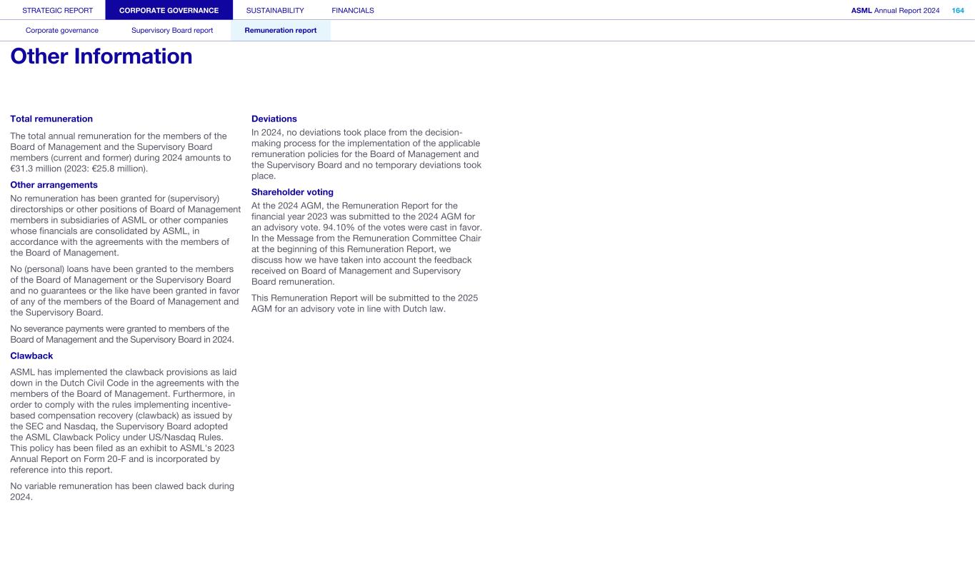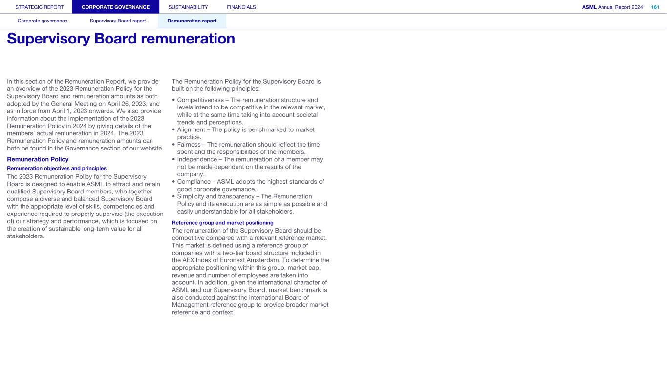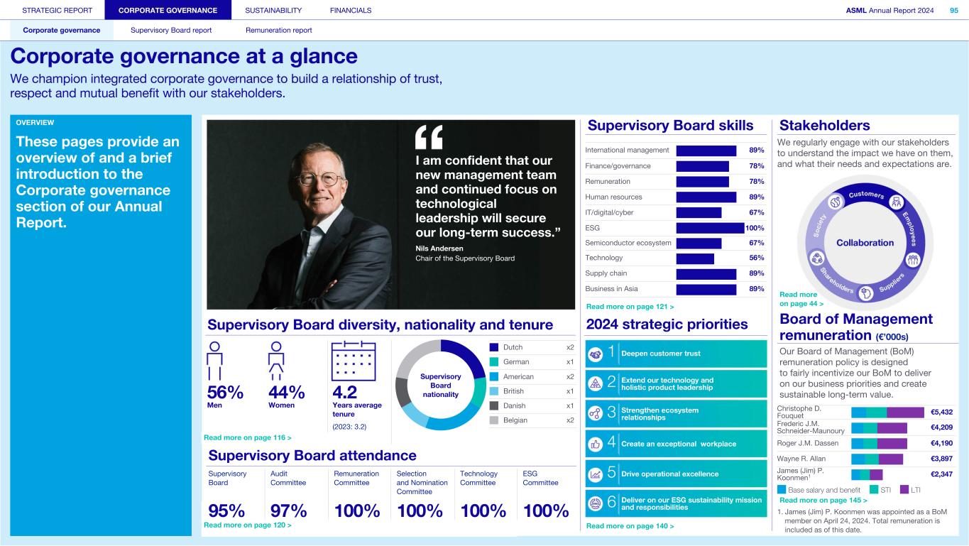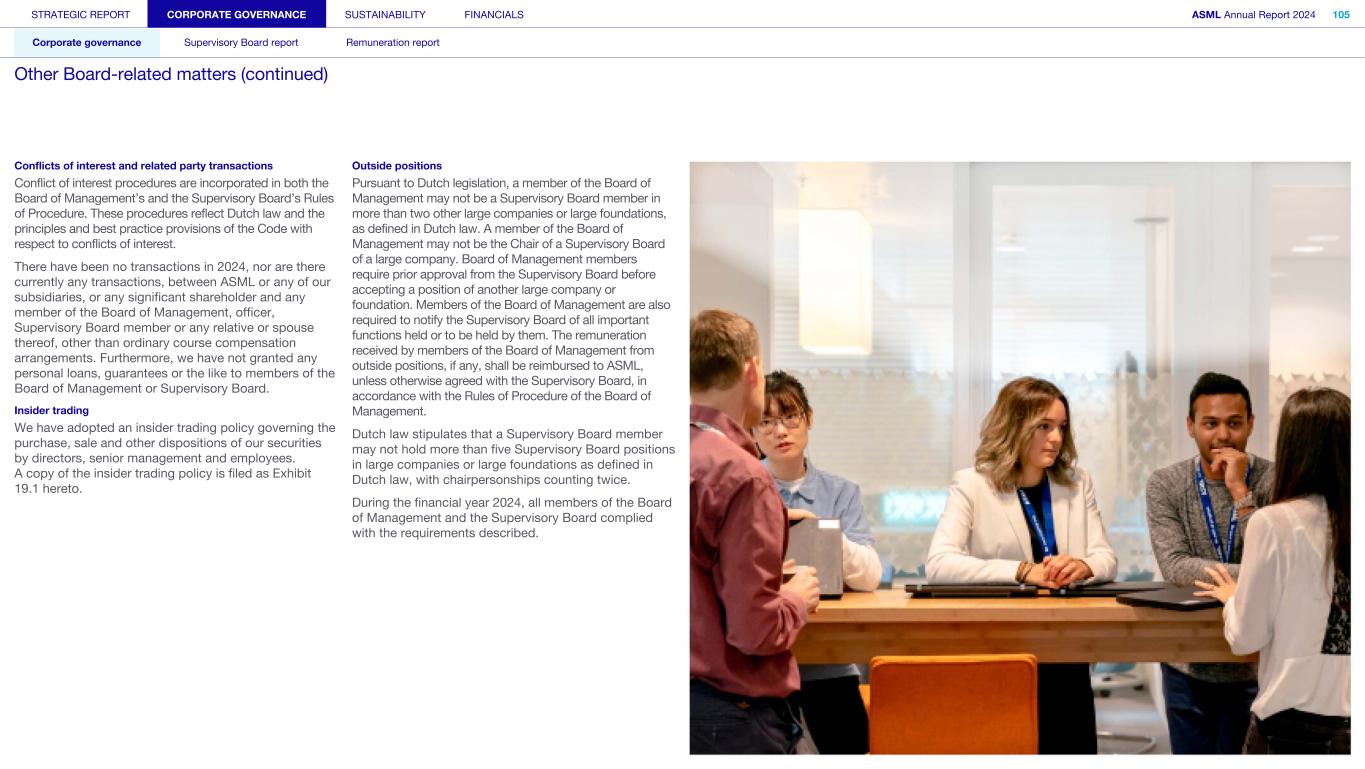 我们赞同良好公司治理的重要性——其中独立性、问责制和透明度是最重要的要素。这些也是我们可以与利益相关者建立信任关系的要素。阿斯麦 NV是一家根据荷兰法律运营的公共有限责任公司。我们的股票在阿姆斯特丹泛欧交易所和纳斯达克上市。我们有一个双层董事会结构,由负责管理公司的管理委员会和监督管理委员会并向其提供建议的独立监事会组成。为了履行职责,两个董事会对代表我们股东的法人大会负责。我们的治理结构基于我们的公司章程、荷兰(以及相关的欧盟)公司和证券法以及荷兰公司治理准则。因为我们是在纳斯达克上市的,所以我们还需要遵守《萨班斯-奥克斯利法案》、《纳斯达克上市规则》的适用条款,以及美国证券交易委员会颁布的适用于ASML等‘外国私人发行人’的规则和条例。我们须遵守适用于大公司的荷兰法律的相关规定(‘structuurregime’),这些规定具有将对某些公司决策和交易的控制权集中在监事会手中的效果。管理委员会和监事会成员的任免程序以结构制度为基础。年度报告的这一部分阐述了我们的公司治理结构以及我们应用荷兰公司治理准则的原则和最佳实践的方式。它还提供了通过与管理报告内容和实施收购指令第10条的法令相关的进一步规则的法令所要求的信息。我们签署了VNO-NCW税收治理准则,并在我们的网站上的我们的税收方法部分和我们更全面的2024年税收报告中报告了其原则的应用情况。根据荷兰公司治理准则(mccg.nl/english),本年度报告的其他部分阐述了我们旨在实现可持续长期价值创造的战略和文化、我们的价值观和行为准则,以及我们的内部控制和风险管理系统的主要特征。在战略报告中阅读更多内容–一览,战略报告–我们的业务–我们的业务战略和我们的业务模式,战略报告–绩效和风险–风险–我们如何管理风险和可持续发展报表–一般披露– ESG可持续发展治理ASML公司治理结构股东监事会审计委员会ESG委员会薪酬委员会遴选和提名委员会技术委员会管理董事会战略报告公司治理可持续发展金融丨ASML丨年报202496公司治理监事会报告薪酬报告公司治理丨ASML组织业务轴:客户业务轴:产品技术轴执行轴使能轴
