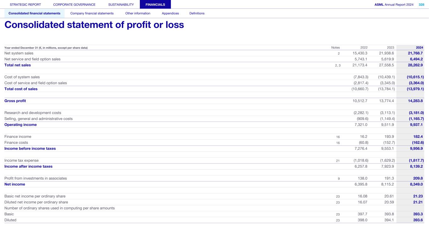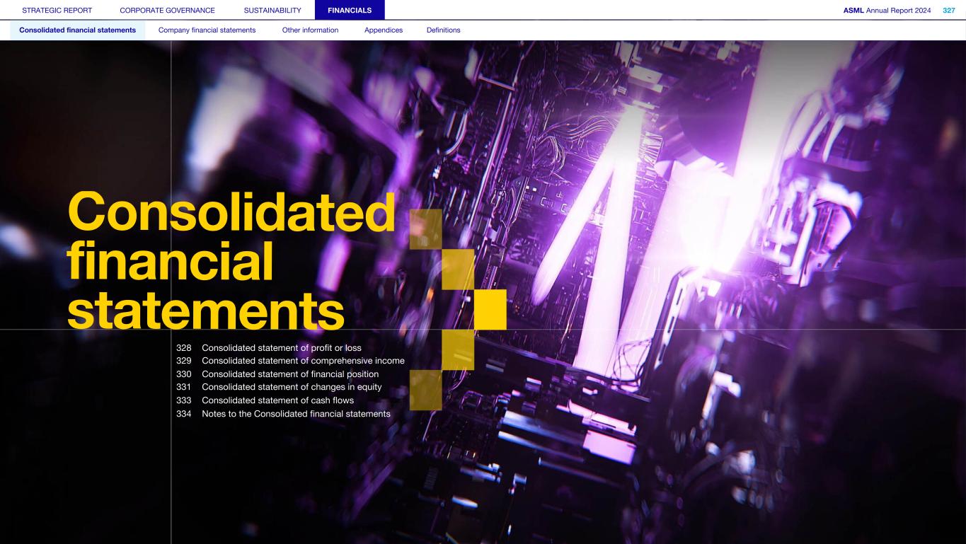 战略报告公司治理可持续发展财务部ASML年度报告2024327合并财务报表公司财务报表其他信息附录定义328合并损益表329合并综合收益表330合并财务状况表331合并权益变动表333合并现金流量表334合并财务报表附注合并财务报表
