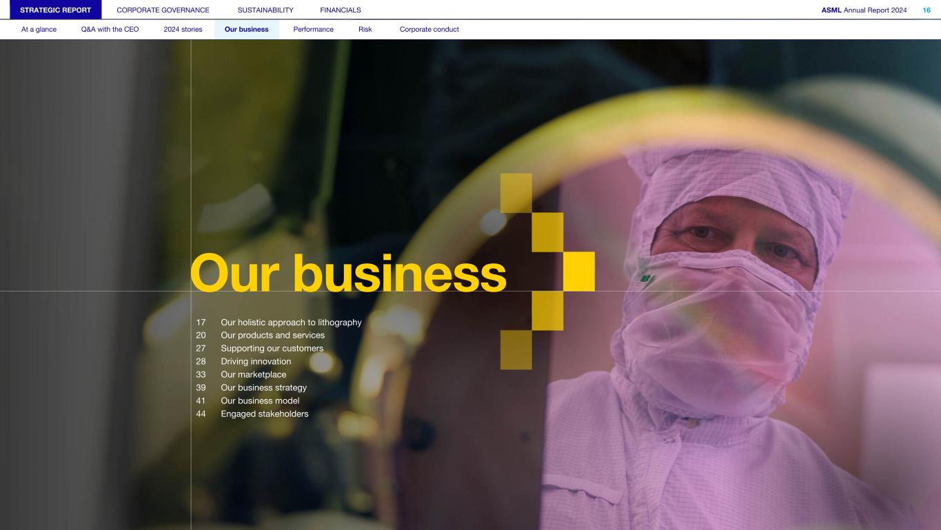 战略报告企业治理可持续发展金融学ASML年度报告2024 16一览与CEO的问答2024故事我们的业务绩效风险企业行为我们的业务17我们对光刻的整体方法20我们的产品和服务27支持客户28推动创新33我们的市场39我们的业务战略41我们的业务模式44参与的利益相关者