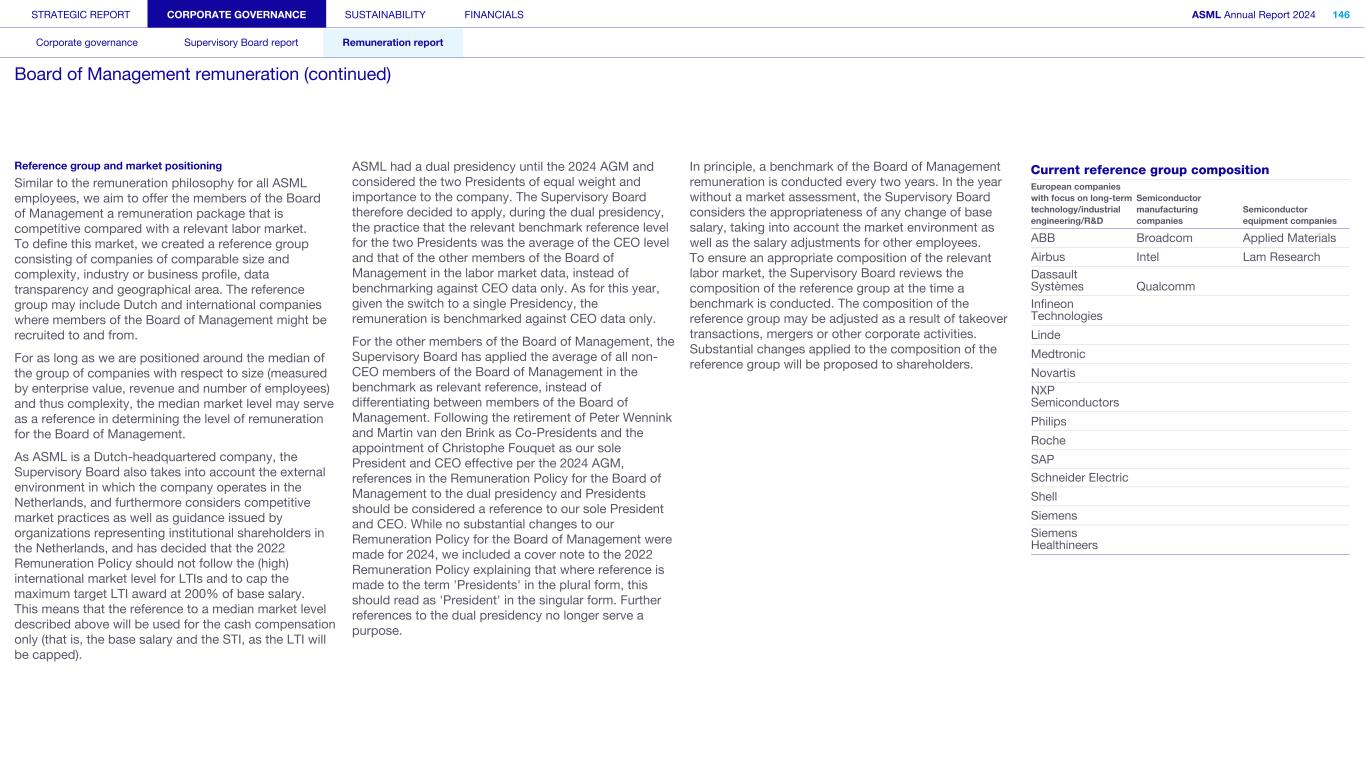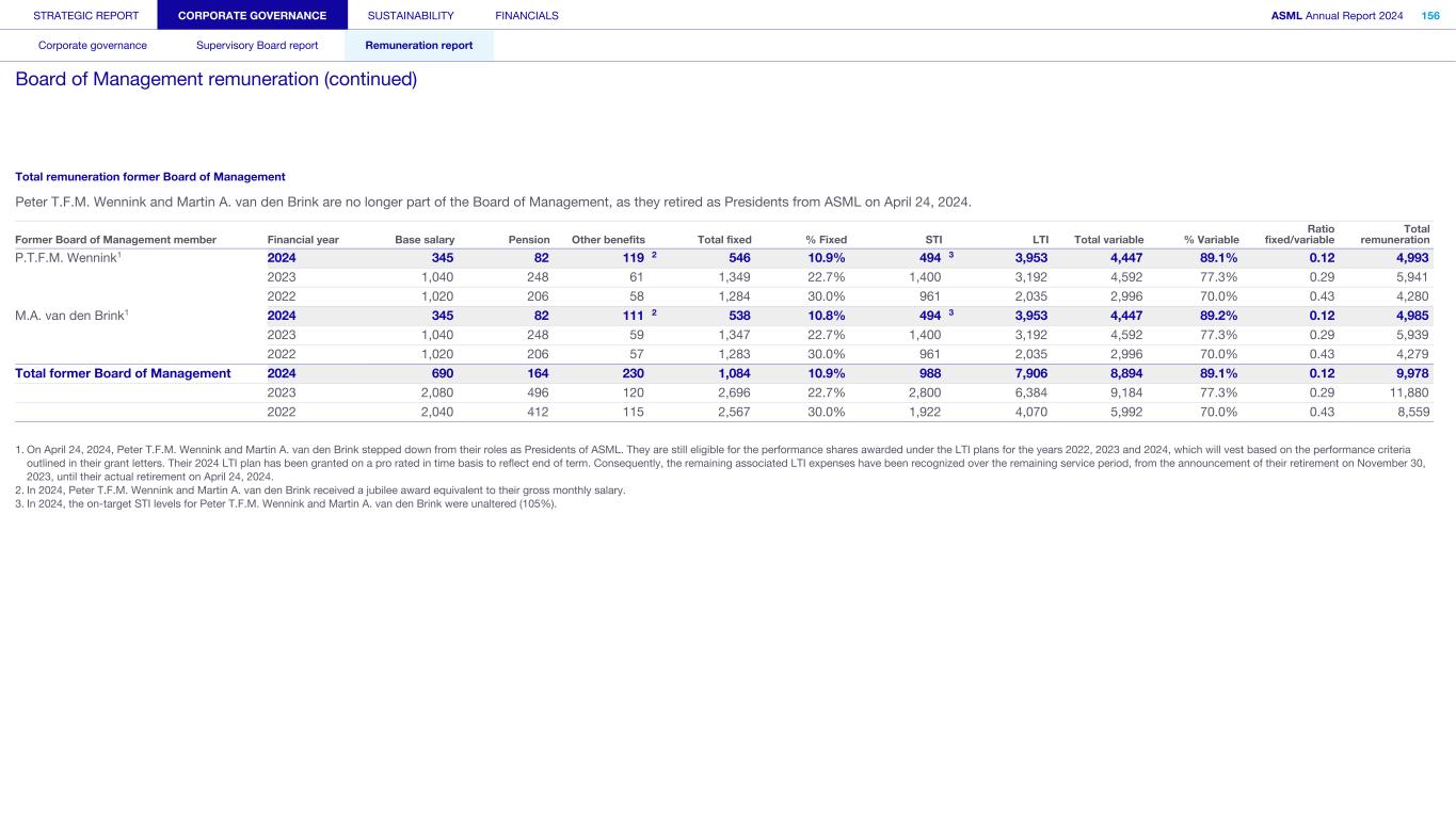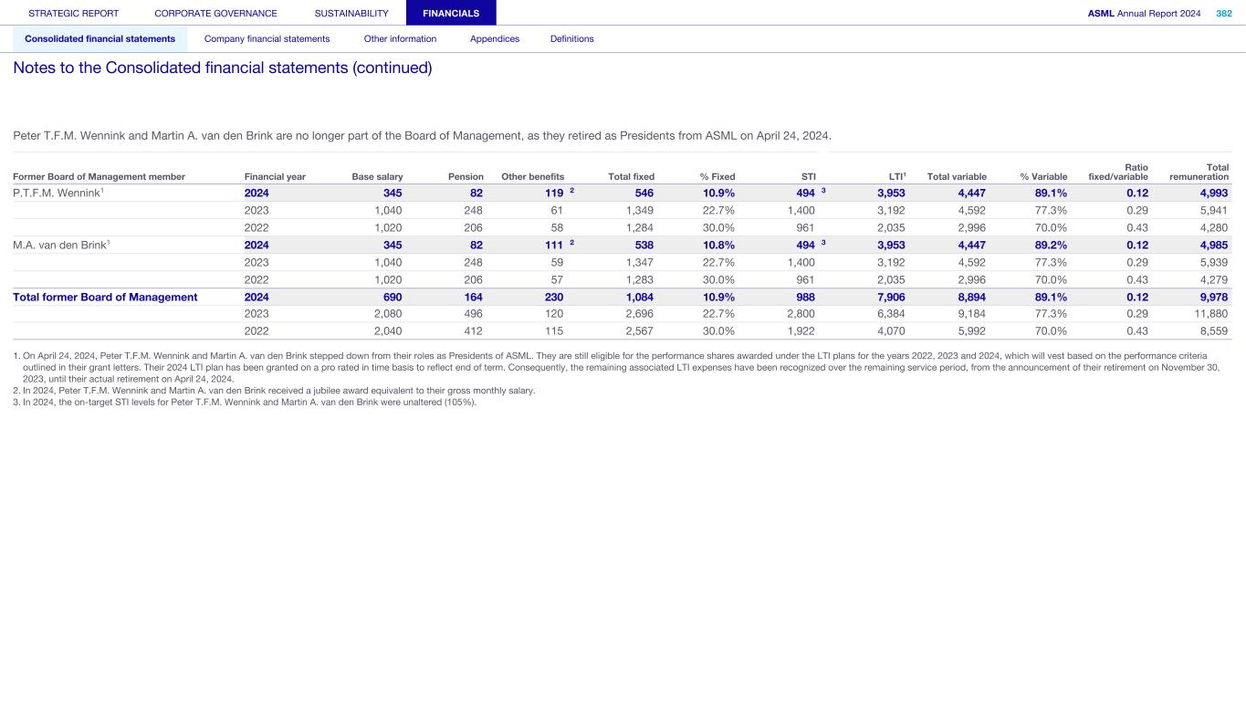 Peter T.F.M. Wennink和Martin A. van den Brink不再是管理委员会的成员,因为他们于2024年4月24日从ASML退休,担任总裁。前管理委员会成员财政年度基本工资养老金其他福利总额固定%固定STI LTI1总变动%可变比率固定/可变薪酬总额P.T.F.M. Wennink1 2024345821192546 10.9% 49433,9534,44789.1% 0.12 4,99320231,040248611,34922.7% 1,4003,1924,59277.3% 0.29 5,94120221,020206581,28430.0% 9612,0352,99670.0% 0.434,280 M.A. van den Brink1 2024345821112538 10.8% 49433,9534,44789.2% 0.12 4,98520231,040248591,34722.7% 1,4003,1924,59277.3% 0.295,93920571,28330.0% 9612,0352,99670.0% 0.434,279前管理委员会合计20246901642301,08410.9% 9887,9068,89489.1% 0.12 9,97820232,0804961202,69622.7% 2,8006,3849,18477.3% 0.2911,88020222,0404121115,56730.0% 1,9224,0705,99270.0% 0.438,5591。2024年4月24日,Peter T.F.M. Wennink和Martin A. van den Brink辞去ASML总裁职务。他们仍有资格获得根据LTI计划授予的2022、2023和2024年业绩份额,这些业绩份额将根据其授予函中概述的业绩标准归属。他们的2024年LTI计划已在时间基础上按比例授予,以反映任期结束。因此,剩余的相关LTI费用已在剩余服务期内确认,从2023年11月30日宣布退休到2024年4月24日实际退休。2.2024年,Peter T.F.M. Wennink和Martin A. van den Brink获得了相当于他们每月总工资的禧年奖励。3.2024年,Peter T.F.M. Wennink和Martin A. van den Brink的目标STI水平未发生变化(105%)。战略报告公司治理可持续发展财务ASML年度报告2024382合并财务报表公司财务报表其他信息附录定义合并财务报表附注(续)