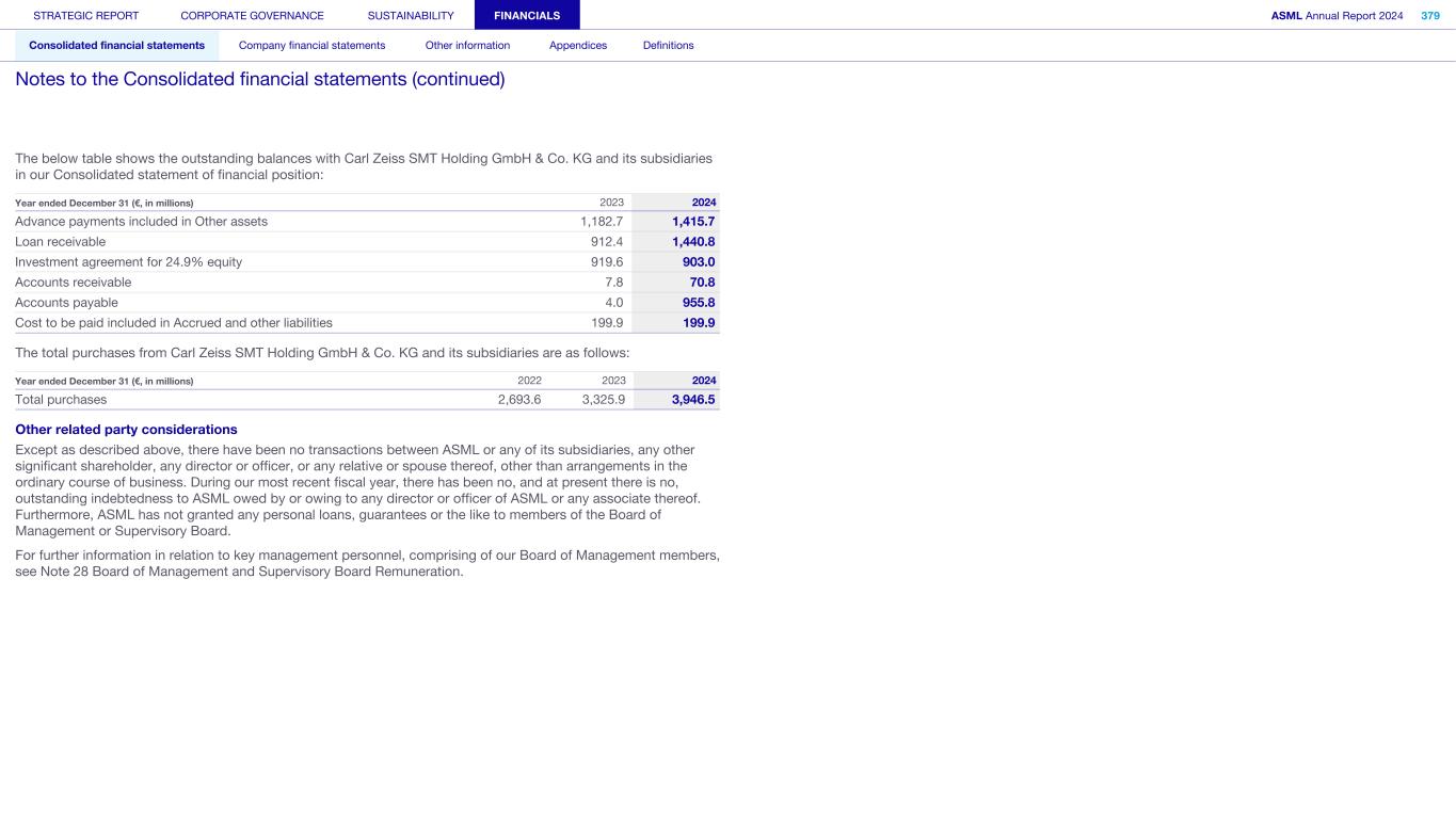 下表显示了我们合并财务状况表中与Carl Zeiss SMT Holding GmbH & Co. KG及其子公司的未偿余额:截至12月31日止年度(欧元,单位:百万)20232024计入其他资产的预付款1,18 2.71,415.7应收贷款912.41,440.8 24.9%股权的投资协议919.6903.0应收账款7.87 0.8应付账款4.09 55.8计入应计及其他负债的待支付成本199.9 199.9向Carl Zeiss SMT Holding GmbH & Co. KG及其子公司的采购总额如下:截至12月31日止年度(欧元,百万元)202220232024合计采购2,693.63,325.93,946.5其他关联方对价除上述情况外,ASML或其任何附属公司、任何其他重要股东、任何董事或高级职员或其任何亲属或配偶之间除日常业务过程中的安排外,概无任何交易。在我们最近一个财政年度内,没有,而且目前也没有,由ASML的任何董事或高级管理人员或其任何联营公司欠下或欠下ASML的未偿债务。此外,ASML未向管理委员会或监事会成员授予任何个人贷款、担保或类似事项。有关由我们的管理委员会成员组成的关键管理人员的更多信息,请参阅附注28管理委员会和监事会薪酬。战略报告公司治理可持续发展财务ASML年度报告2024379合并财务报表公司财务报表其他信息附录定义合并财务报表附注(续)
