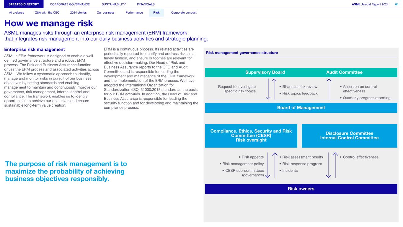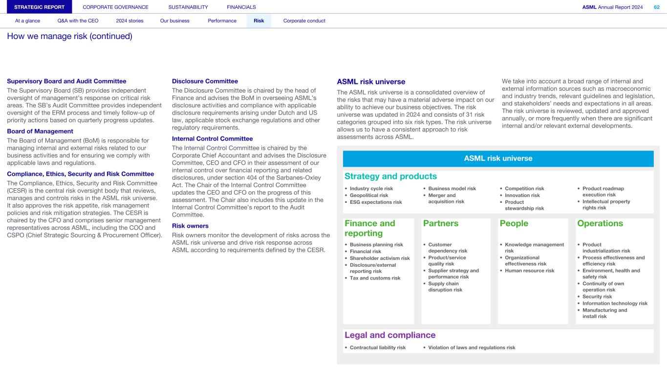 监事会和审计委员会监事会(SB)对管理层在关键风险领域的应对措施进行独立监督。SB的审计委员会对ERM过程进行独立监督,并根据季度进展更新及时跟踪优先行动。管理委员会管理委员会(BOM)负责管理与我们的业务活动相关的内部和外部风险,并确保我们遵守适用的法律法规。合规、道德、安全和风险委员会合规、道德、安全和风险委员会(CESR)是审查、管理和控制ASML风险领域中的风险的中央风险监督机构。它还批准了风险偏好、风险管理政策和风险缓解策略。CESR由首席财务官担任主席,由ASML的高级管理层代表组成,包括首席运营官和CSPO(首席战略采购与采购官)。披露委员会披露委员会由财务负责人担任主席,在监督ASML的披露活动以及遵守荷兰和美国法律、适用的证券交易所法规和其他监管要求所产生的适用披露要求方面向英国央行提供建议。内部控制委员会内部控制委员会由公司总会计师担任主席,根据《萨班斯-奥克斯利法案》第404条,向披露委员会、首席执行官和首席财务官评估我们对财务报告和相关披露的内部控制提供建议。内部控制委员会主席向首席执行官和首席财务官通报这一评估的进展情况。主席还将这一更新列入内部控制委员会提交审计委员会的报告。风险所有者风险所有者监控整个ASML风险领域的风险发展,并根据CESR定义的要求推动跨ASML的风险响应。ASML风险宇宙ASML风险宇宙是可能对我们实现业务目标的能力产生重大不利影响的风险的综合概览。风险范围于2024年更新,由31个风险类别组成,分为六种风险类型。风险宇宙使我们能够对跨ASML的风险评估采用一致的方法。ASML风险领域战略和产品•行业周期风险•地缘政治风险• ESG预期风险•商业模式风险•并购风险•竞争风险•创新风险•产品管理风险•产品路线图执行风险•知识产权风险财务和报告合作伙伴人员运营•业务规划风险•财务风险•股东积极性风险•披露/外部报告风险•税务和海关风险•客户依赖风险•产品/服务质量风险•供应商战略和履约风险•供应链中断风险•知识管理风险•组织有效性风险•人力资源风险•产品产业化风险•工艺有效性和效率风险•环境、健康和安全风险•自身运营的持续性风险•安全风险•信息技术风险•制造和安装风险法律和合规•合同责任风险•违法违规风险我们考虑了广泛的内外部信息来源,例如宏观经济和行业趋势、相关准则和立法以及利益相关者在所有领域的需求和期望。风险范围每年进行审查、更新和批准,或在出现重大内部和/或相关外部发展时更频繁地进行。战略报告公司治理可持续发展金融学ASML 2024年度报告62与CEO的一览问答2024故事我们的业务绩效风险公司行为我们如何管理风险(续)