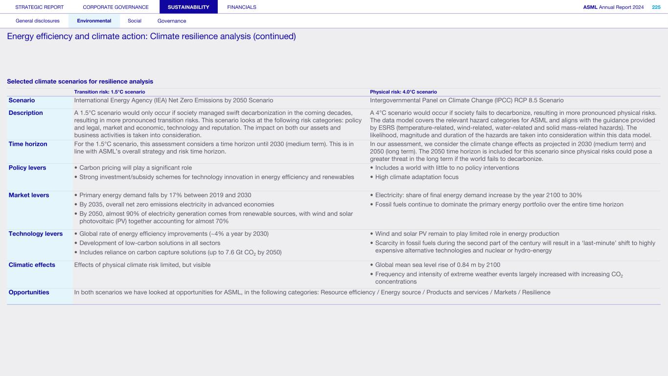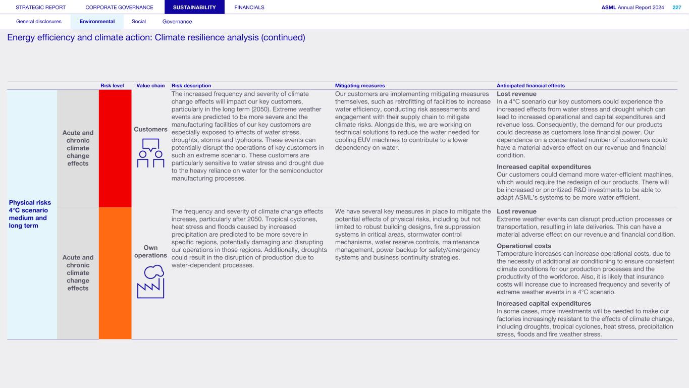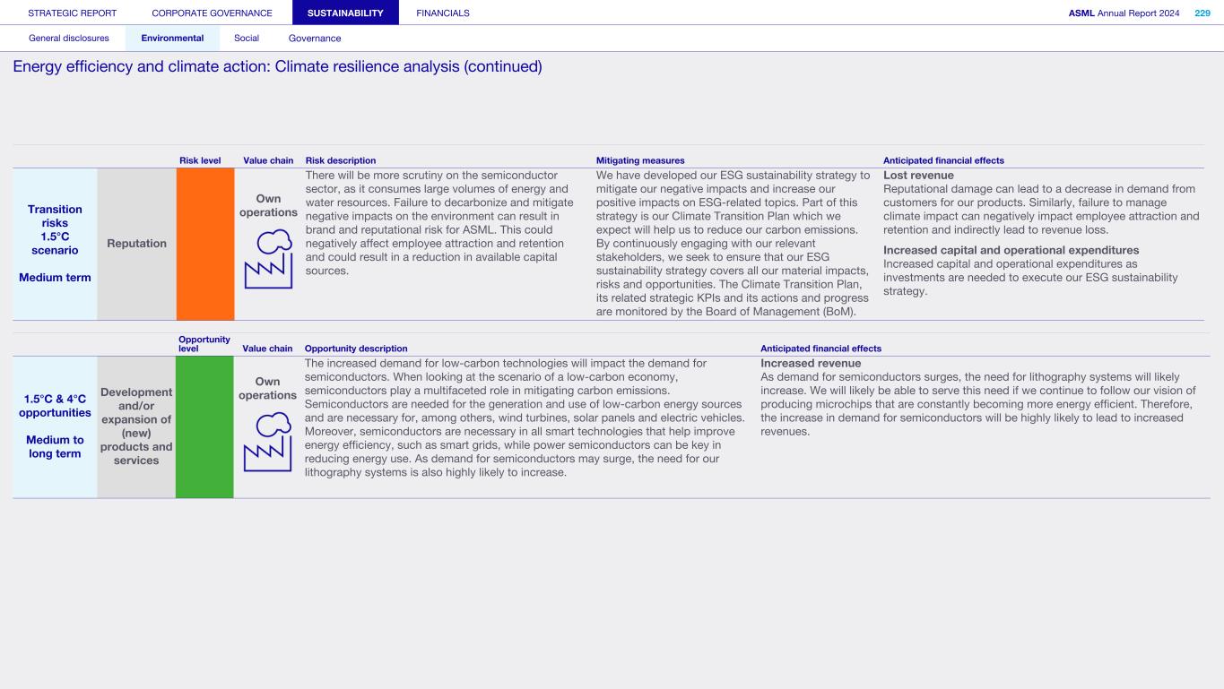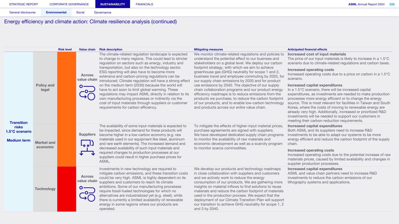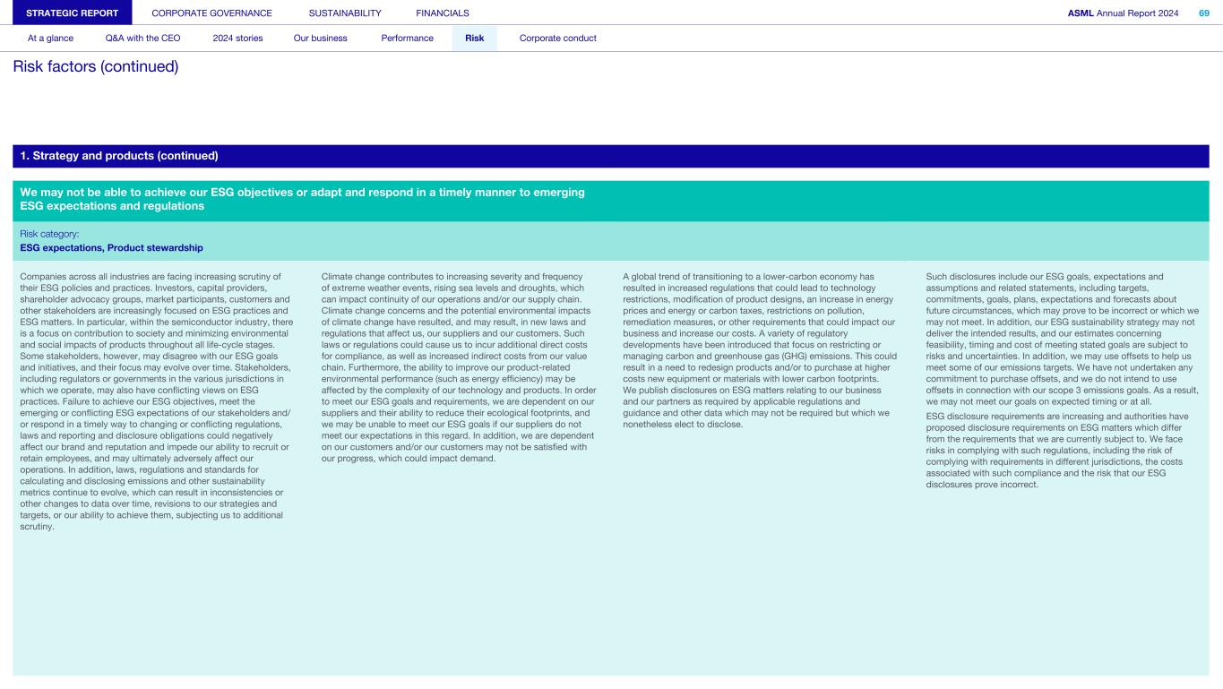 1.战略与产品(续)我们可能无法实现我们的ESG目标,或无法及时适应和应对新出现的ESG预期和法规风险类别:ESG预期、产品管理所有行业的公司都面临着对其ESG政策和实践越来越严格的审查。投资者、资本提供者、股东倡导团体、市场参与者、客户和其他利益相关者越来越关注ESG实践和ESG事项。特别是,在半导体行业内,关注对社会的贡献,并在所有生命周期阶段最大限度地减少产品的环境和社会影响。然而,一些利益相关者可能不同意我们的ESG目标和倡议,他们的关注点可能会随着时间而变化。利益相关者,包括我们经营所在的各个司法管辖区的监管机构或政府,也可能对ESG实践有相互矛盾的看法。未能实现我们的ESG目标、满足利益相关者新出现的或相互冲突的ESG期望和/或及时对不断变化或相互冲突的法规、法律以及报告和披露义务做出回应,可能会对我们的品牌和声誉产生负面影响,并阻碍我们招聘或留住员工的能力,并可能最终对我们的运营产生不利影响。此外,用于计算和披露排放量和其他可持续性指标的法律、法规和标准不断发展,这可能导致数据随着时间的推移出现不一致或其他变化,对我们的战略和目标进行修订,或我们实现这些目标的能力,从而使我们受到额外的审查。气候变化导致极端天气事件、海平面上升和干旱的严重性和频率增加,这可能会影响我们运营和/或供应链的连续性。气候变化问题和气候变化的潜在环境影响已经导致并可能导致影响我们、我们的供应商和我们的客户的新法律和法规。此类法律或法规可能导致我们为合规承担额外的直接成本,以及来自我们价值链的间接成本增加。此外,改善我们与产品相关的环境绩效(例如能源效率)的能力可能会受到我们技术和产品的复杂性的影响。为了满足我们的ESG目标和要求,我们依赖于我们的供应商及其减少生态足迹的能力,如果我们的供应商没有达到我们在这方面的期望,我们可能无法实现我们的ESG目标。此外,我们依赖于我们的客户和/或我们的客户可能对我们的进展不满意,这可能会影响需求。向低碳经济转型的全球趋势导致监管增加,可能导致技术限制、产品设计修改、能源价格和能源或碳税增加、污染限制、补救措施或其他可能影响我们的业务并增加我们成本的要求。已经出台了各种监管发展,重点是限制或管理碳和温室气体(GHG)排放。这可能导致需要重新设计产品和/或以更高的成本购买碳足迹更低的新设备或材料。我们根据适用法规和指南的要求发布与我们的业务和合作伙伴相关的ESG事项的披露以及其他可能不需要但我们仍然选择披露的数据。此类披露包括我们的ESG目标、期望和假设以及相关陈述,包括目标、承诺、目标、计划、期望和对未来情况的预测,这些可能被证明是不正确的,或者我们可能没有达到。此外,我们的ESG可持续发展战略可能无法实现预期结果,我们关于实现既定目标的可行性、时间安排和成本的估计受到风险和不确定性的影响。此外,我们可能会使用抵消来帮助我们实现一些排放目标。我们没有承诺购买抵消额,我们也不打算在我们的范围3排放目标中使用抵消额。因此,我们可能无法在预期的时机或根本无法达到我们的目标。ESG披露要求正在增加,当局提出了关于ESG事项的披露要求,这些要求与我们目前遵守的要求不同。我们在遵守此类法规时面临风险,包括遵守不同司法管辖区的要求的风险、与此类合规相关的成本以及我们的ESG披露被证明不正确的风险。战略报告公司治理可持续发展财务ASML年度报告202469与CEO的一览问答2024故事我们的业务绩效风险公司行为风险因素(续)