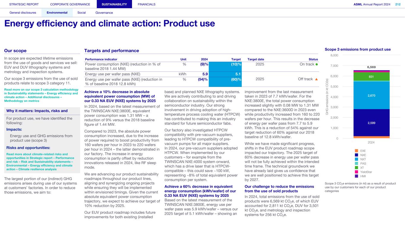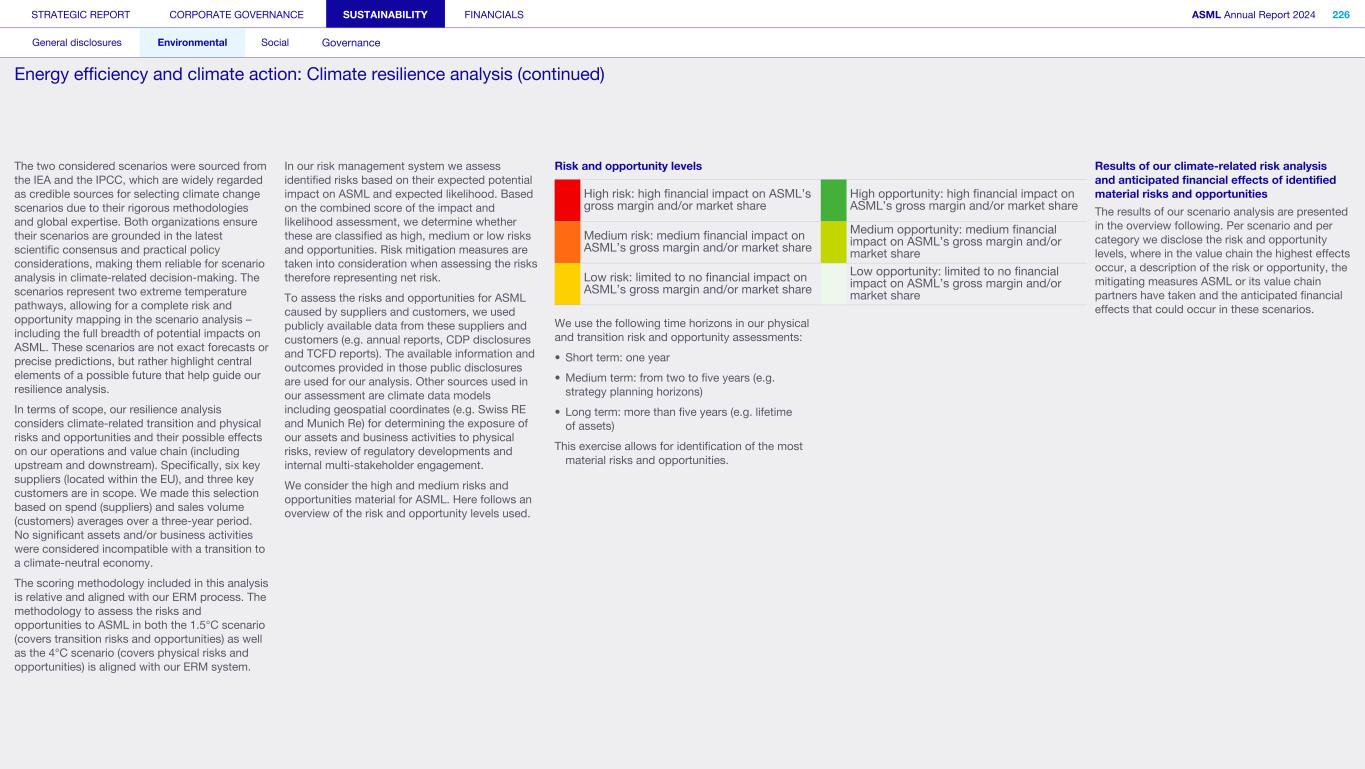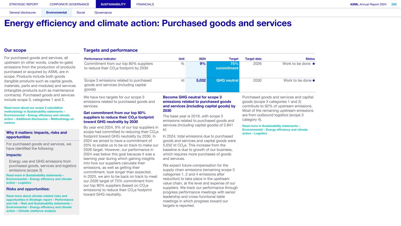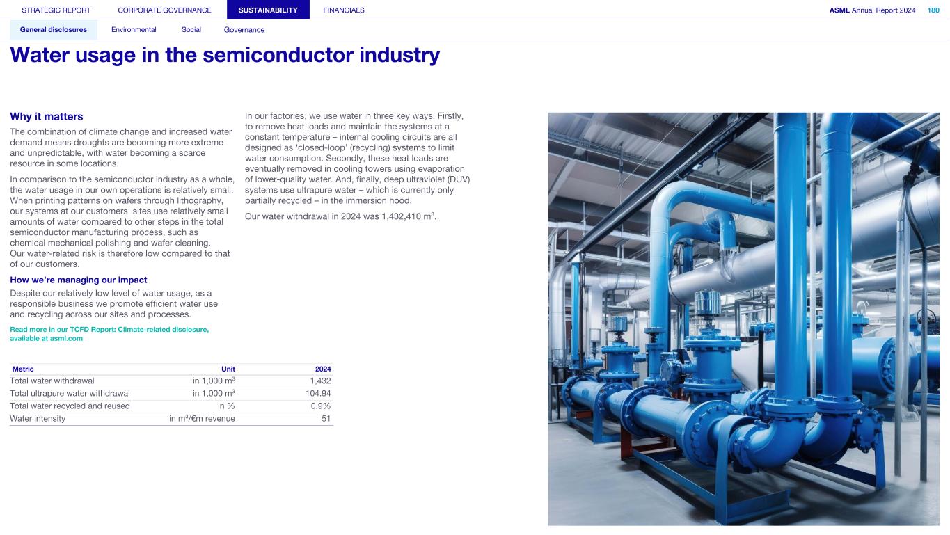1.战略与产品(续)我们可能无法实现我们的ESG目标,或无法及时适应和应对新出现的ESG预期和法规风险类别:ESG预期、产品管理所有行业的公司都面临着对其ESG政策和实践越来越严格的审查。投资者、资本提供者、股东倡导团体、市场参与者、客户和其他利益相关者越来越关注ESG实践和ESG事项。特别是,在半导体行业内,关注对社会的贡献,并在所有生命周期阶段最大限度地减少产品的环境和社会影响。然而,一些利益相关者可能不同意我们的ESG目标和倡议,他们的关注点可能会随着时间而变化。利益相关者,包括我们经营所在的各个司法管辖区的监管机构或政府,也可能对ESG实践有相互矛盾的看法。未能实现我们的ESG目标、满足利益相关者新出现的或相互冲突的ESG期望和/或及时对不断变化或相互冲突的法规、法律以及报告和披露义务做出回应,可能会对我们的品牌和声誉产生负面影响,并阻碍我们招聘或留住员工的能力,并可能最终对我们的运营产生不利影响。此外,用于计算和披露排放量和其他可持续性指标的法律、法规和标准不断发展,这可能导致数据随着时间的推移出现不一致或其他变化,对我们的战略和目标进行修订,或我们实现这些目标的能力,从而使我们受到额外的审查。气候变化导致极端天气事件、海平面上升和干旱的严重性和频率增加,这可能会影响我们运营和/或供应链的连续性。气候变化问题和气候变化的潜在环境影响已经导致并可能导致影响我们、我们的供应商和我们的客户的新法律和法规。此类法律或法规可能导致我们为合规承担额外的直接成本,以及来自我们价值链的间接成本增加。此外,改善我们与产品相关的环境绩效(例如能源效率)的能力可能会受到我们技术和产品的复杂性的影响。为了满足我们的ESG目标和要求,我们依赖于我们的供应商及其减少生态足迹的能力,如果我们的供应商没有达到我们在这方面的期望,我们可能无法实现我们的ESG目标。此外,我们依赖于我们的客户和/或我们的客户可能对我们的进展不满意,这可能会影响需求。向低碳经济转型的全球趋势导致监管增加,可能导致技术限制、产品设计修改、能源价格和能源或碳税增加、污染限制、补救措施或其他可能影响我们的业务并增加我们成本的要求。已经出台了各种监管发展,重点是限制或管理碳和温室气体(GHG)排放。这可能导致需要重新设计产品和/或以更高的成本购买碳足迹更低的新设备或材料。我们根据适用法规和指南的要求发布与我们的业务和合作伙伴相关的ESG事项的披露以及其他可能不需要但我们仍然选择披露的数据。此类披露包括我们的ESG目标、期望和假设以及相关陈述,包括目标、承诺、目标、计划、期望和对未来情况的预测,这些可能被证明是不正确的,或者我们可能没有达到。此外,我们的ESG可持续发展战略可能无法实现预期结果,我们关于实现既定目标的可行性、时间安排和成本的估计受到风险和不确定性的影响。此外,我们可能会使用抵消来帮助我们实现一些排放目标。我们没有承诺购买抵消额,我们也不打算在我们的范围3排放目标中使用抵消额。因此,我们可能无法在预期的时机或根本无法达到我们的目标。ESG披露要求正在增加,当局提出了关于ESG事项的披露要求,这些要求与我们目前遵守的要求不同。我们在遵守此类法规时面临风险,包括遵守不同司法管辖区的要求的风险、与此类合规相关的成本以及我们的ESG披露被证明不正确的风险。战略报告公司治理可持续发展财务ASML年度报告202469与CEO的一览问答2024故事我们的业务绩效风险公司行为风险因素(续)