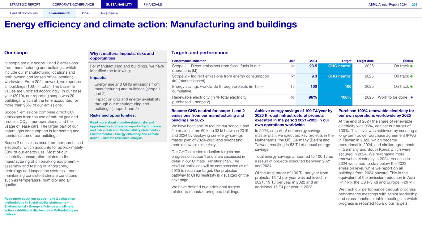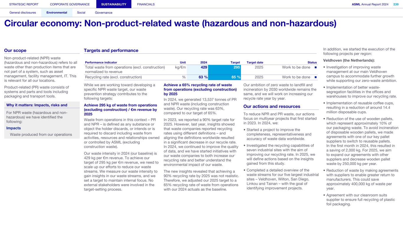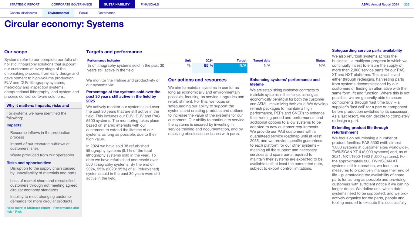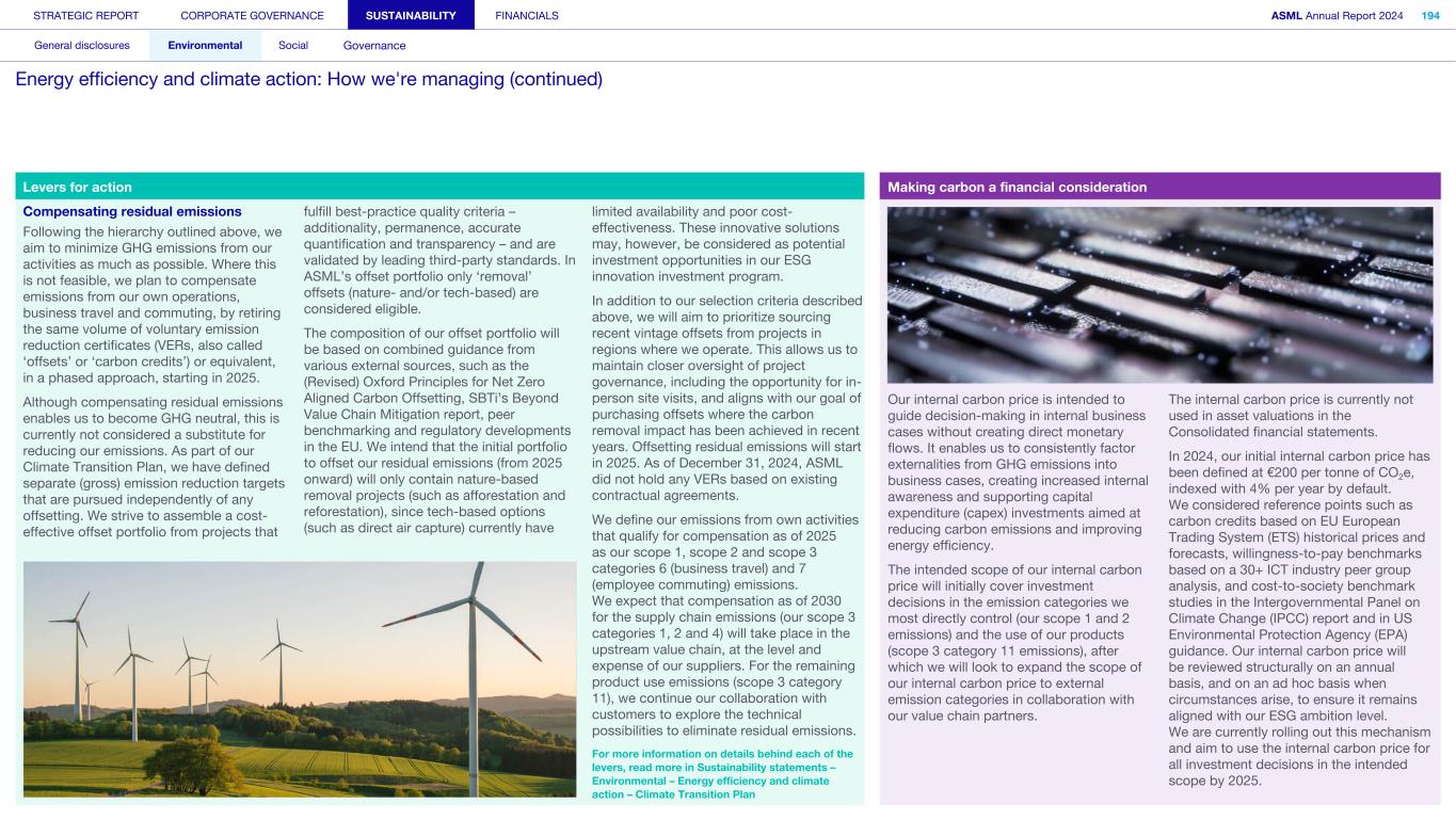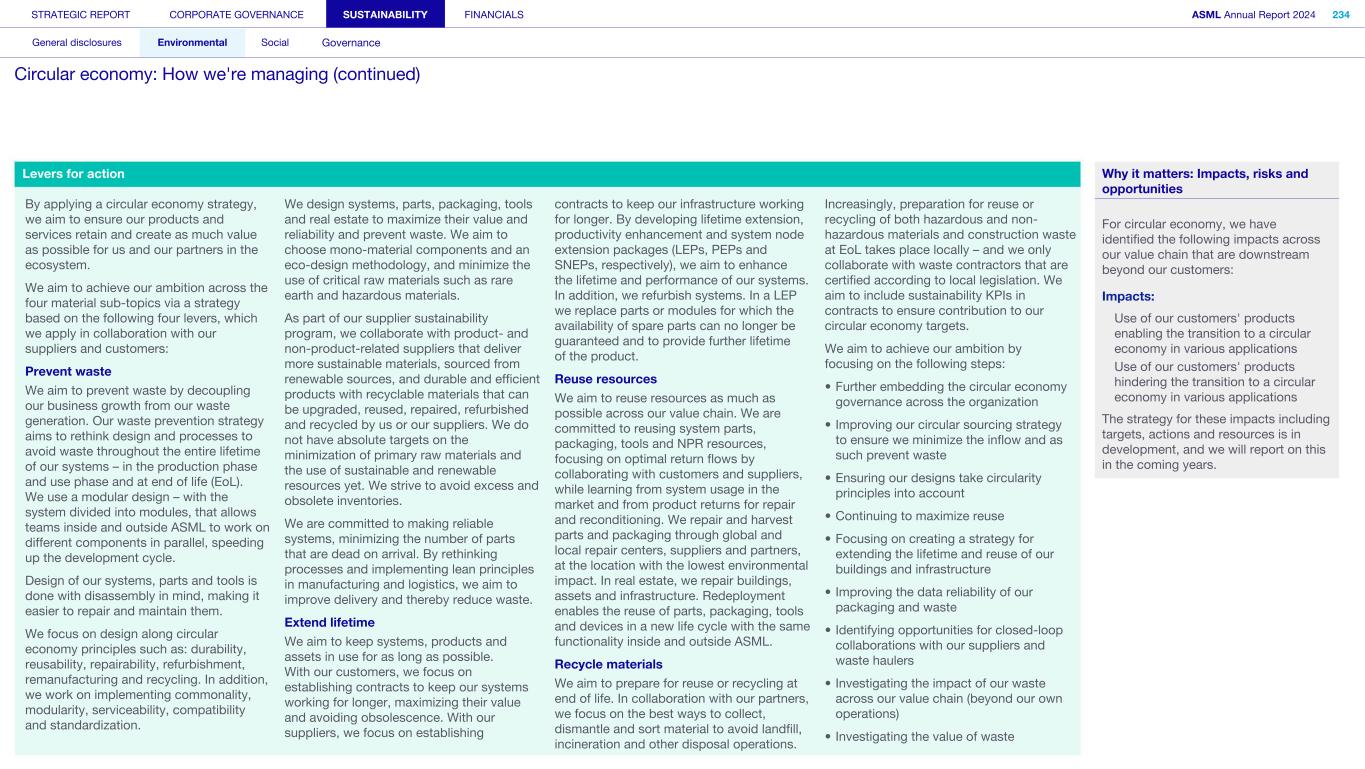 1.战略与产品(续)我们可能无法实现我们的ESG目标,或无法及时适应和应对新出现的ESG预期和法规风险类别:ESG预期、产品管理所有行业的公司都面临着对其ESG政策和实践越来越严格的审查。投资者、资本提供者、股东倡导团体、市场参与者、客户和其他利益相关者越来越关注ESG实践和ESG事项。特别是,在半导体行业内,关注对社会的贡献,并在所有生命周期阶段最大限度地减少产品的环境和社会影响。然而,一些利益相关者可能不同意我们的ESG目标和倡议,他们的关注点可能会随着时间而变化。利益相关者,包括我们经营所在的各个司法管辖区的监管机构或政府,也可能对ESG实践有相互矛盾的看法。未能实现我们的ESG目标、满足利益相关者新出现的或相互冲突的ESG期望和/或及时对不断变化或相互冲突的法规、法律以及报告和披露义务做出回应,可能会对我们的品牌和声誉产生负面影响,并阻碍我们招聘或留住员工的能力,并可能最终对我们的运营产生不利影响。此外,用于计算和披露排放量和其他可持续性指标的法律、法规和标准不断发展,这可能导致数据随着时间的推移出现不一致或其他变化,对我们的战略和目标进行修订,或我们实现这些目标的能力,从而使我们受到额外的审查。气候变化导致极端天气事件、海平面上升和干旱的严重性和频率增加,这可能会影响我们运营和/或供应链的连续性。气候变化问题和气候变化的潜在环境影响已经导致并可能导致影响我们、我们的供应商和我们的客户的新法律和法规。此类法律或法规可能导致我们为合规承担额外的直接成本,以及来自我们价值链的间接成本增加。此外,改善我们与产品相关的环境绩效(例如能源效率)的能力可能会受到我们技术和产品的复杂性的影响。为了满足我们的ESG目标和要求,我们依赖于我们的供应商及其减少生态足迹的能力,如果我们的供应商没有达到我们在这方面的期望,我们可能无法实现我们的ESG目标。此外,我们依赖于我们的客户和/或我们的客户可能对我们的进展不满意,这可能会影响需求。向低碳经济转型的全球趋势导致监管增加,可能导致技术限制、产品设计修改、能源价格和能源或碳税增加、污染限制、补救措施或其他可能影响我们的业务并增加我们成本的要求。已经出台了各种监管发展,重点是限制或管理碳和温室气体(GHG)排放。这可能导致需要重新设计产品和/或以更高的成本购买碳足迹更低的新设备或材料。我们根据适用法规和指南的要求发布与我们的业务和合作伙伴相关的ESG事项的披露以及其他可能不需要但我们仍然选择披露的数据。此类披露包括我们的ESG目标、期望和假设以及相关陈述,包括目标、承诺、目标、计划、期望和对未来情况的预测,这些可能被证明是不正确的,或者我们可能没有达到。此外,我们的ESG可持续发展战略可能无法实现预期结果,我们关于实现既定目标的可行性、时间安排和成本的估计受到风险和不确定性的影响。此外,我们可能会使用抵消来帮助我们实现一些排放目标。我们没有承诺购买抵消额,我们也不打算在我们的范围3排放目标中使用抵消额。因此,我们可能无法在预期的时机或根本无法达到我们的目标。ESG披露要求正在增加,当局提出了关于ESG事项的披露要求,这些要求与我们目前遵守的要求不同。我们在遵守此类法规时面临风险,包括遵守不同司法管辖区的要求的风险、与此类合规相关的成本以及我们的ESG披露被证明不正确的风险。战略报告公司治理可持续发展财务ASML年度报告202469与CEO的一览问答2024故事我们的业务绩效风险公司行为风险因素(续)