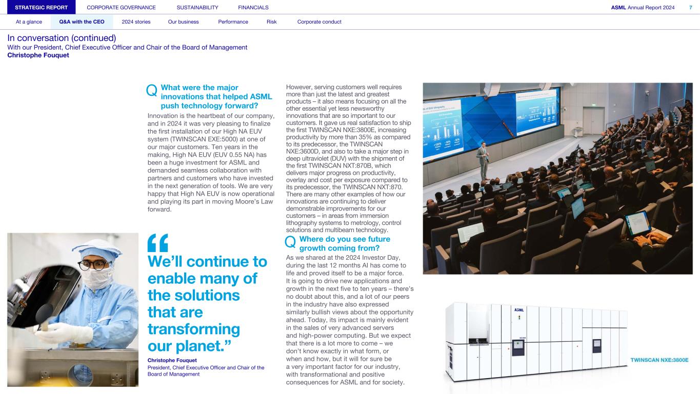 Q帮助ASML推动技术向前发展的主要创新有哪些?创新是我们公司的心跳,在2024年,我们非常高兴地在我们的一个主要客户那里完成了我们的High NA EUV系统(TWINSCAN EXE:5000)的首次安装。酝酿十年,高NA EUV(EUV 0.55 NA)对于ASML来说是一笔巨大的投资,需要与投资于下一代工具的合作伙伴和客户进行无缝协作。我们很高兴High NA EUV现在开始运行,并在推动摩尔定律向前发展方面发挥了作用。我们将继续启用许多正在改变我们星球的解决方案。”Christophe Fouquet总裁、首席执行官兼管理委员会主席然而,服务好客户需要的不仅仅是最新和最好的产品——这还意味着专注于对我们的客户如此重要的所有其他重要但新闻价值较低的创新。出货首款TWINSCAN NXE:3800E让我们真正感到满意,与其前身TWINSCAN NXE:3600D相比,生产力提高了35%以上,同时还随着首款TWINSCAN NXT:870B的出货在深紫外线(DUV)方面迈出了重要一步,与其前身TWINSCAN NXT:870相比,该产品在生产力、叠加层和每次曝光成本方面都取得了重大进展。还有许多其他例子表明,我们的创新如何继续为我们的客户带来可证明的改进——从浸没式光刻系统到计量、控制解决方案和多波束技术等领域。问:您认为未来的增长来自哪里?正如我们在2024年投资者日上分享的那样,在过去的12个月里,人工智能栩栩如生,并证明了自己是一股主要力量。它将在未来五到十年内推动新的应用和增长——这是毫无疑问的,我们很多业内同行也对未来的机会表达了类似的看涨观点。如今,它的影响主要体现在非常先进的服务器和高功率计算的销售上。但我们预计,未来还会有更多——我们不知道具体以什么形式、何时以及如何,但它肯定会对我们的行业来说是一个非常重要的因素,对ASML和社会都会产生变革性的积极影响。战略报告公司治理可持续发展财务ASML年度报告20247一览与首席执行官的问答2024故事我们的业务绩效风险公司行为与我们的总裁、首席执行官和管理委员会主席Christophe Fouquet的对话(续)