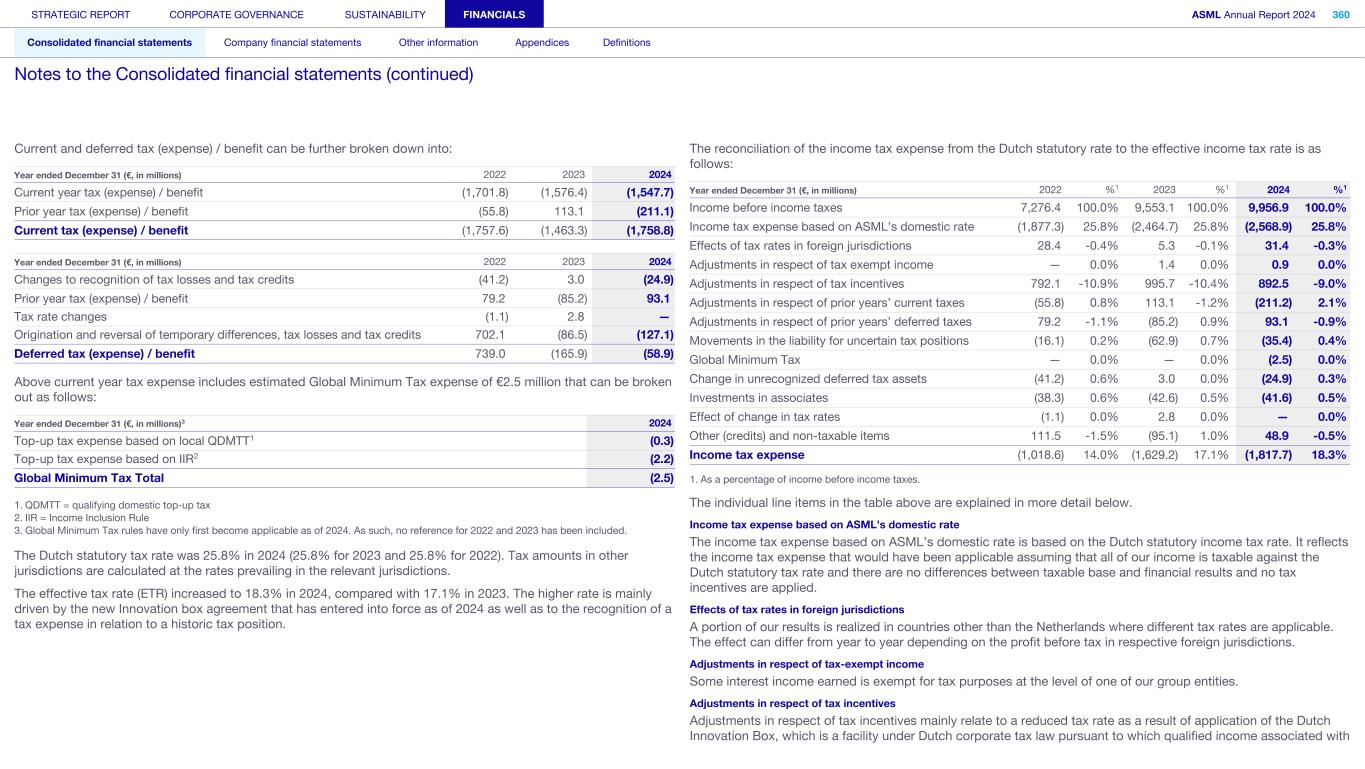 当期和递延税项(费用)/福利可进一步细分为:截至12月31日止年度(欧元,百万)202220232024本年度税项(费用)/福利(1,701.8)(1,576.4)(1,547.7)上年度税项(费用)/福利(55.8)113.1(211.1)当期税项(费用)/福利(1,757.6)(1,463.3)(1,758.8)截至12月31日止年度(欧元,百万)202220232024确认税收损失和税收抵免的变化(41.2)3.0(24.9)上年度税收(费用)/福利79.2(85.2)93.1税率变化(1.1)2.8 —暂时性差异的产生和转回,税收损失和税收抵免702.1(86.5)(127.1)递延税(费用)/收益739.0(165.9)(58.9)高于当年的税收费用包括250万欧元的估计全球最低税收费用,可细分如下:截至12月31日的年度(欧元,单位:百万)32024年基于当地QDMTT1的补足税收费用(0.3)基于IIR2的补足税收费用(2.2)全球最低税收总额(2.5)1。QDMTT =合格境内补税2。IIR =收入纳入规则3。截至2024年,全球最低税率规则才首次开始适用。因此,没有包括2022年和2023年的参考资料。2024年荷兰法定税率为25.8%(2023年为25.8%,2022年为25.8%)。其他法域的税额按相关法域的现行税率计算。2024年有效税率(ETR)增至18.3%,而2023年为17.1%。较高的税率主要是由于自2024年起生效的新的创新盒子协议以及与历史税收状况相关的税收费用的确认。荷兰法定税率与实际所得税率的所得税费用调节如下:截至12月31日止年度(欧元,百万)2022% 12023% 12024% 1收入所得税前7,276.4 100.0% 9,55 3.1 100.0% 9,956.9 100.0%基于ASML国内税率的所得税费用(1,877.3)25.8%(2,464.7)25.8%(2,568.9)25.8%外国司法管辖区税率的影响28.4-0.4 % 5.3-0.1 % 31.4-0.3 %免税收入的调整— 0.0% 1.4 0.0% 0.9 0.0%税收优惠的调整792.1-10.9 % 995.7-10.4 % 89 2.5-9.0 %以前年度当期税项的调整(55.8)0.8% 113.1-1.2 %(211.2)2.1%以前年度递延税项的调整79.2-1.1 %(85.2)0.9% 93.1-0.9 %负债变动对于不确定的税务状况(16.1)0.2%(62.9)0.7%(35.4)0.4%全球最低税项— 0.0% — 0.0%(2.5)0.0%未确认递延税项资产变动(41.2)0.6% 3.0 0.0%(24.9)0.3%联营公司投资(38.3)0.6%(42.6)0.5%(41.6)0.5%税率变动影响(1.1)0.0% 2.8 0.0% — 0.0%其他(贷项)和非应税项目111.5-1.5 %(95.1)1.0% 48.9-0.5 %所得税费用(1,018.6)14.0%(1,629.2)17.1%(1,817.7)18.3% 1。占所得税前收入的百分比。下表中的各个行项目将在下文进行更详细的解释。基于ASML国内税率的所得税费用基于ASML国内税率的所得税费用基于荷兰法定所得税率。它反映了假设我们的所有收入都应按荷兰法定税率征税,且应课税基础和财务结果之间没有差异,并且不适用税收优惠,则本应适用的所得税费用。外国司法管辖区税率的影响我们的部分结果是在荷兰以外适用不同税率的国家实现的。每年的影响可能有所不同,具体取决于各自外国司法管辖区的税前利润。有关免税收入的调整部分赚取的利息收入在我们集团实体之一的层面上免税。与税收优惠有关的调整与税收优惠有关的调整主要与适用荷兰创新盒子导致税率降低有关,荷兰创新盒子是荷兰公司税法下的一项便利,据此,与战略报告公司治理可持续性财务相关的合格收入ASML年度报告2024360合并财务报表公司财务报表其他信息附录定义合并财务报表附注(续)