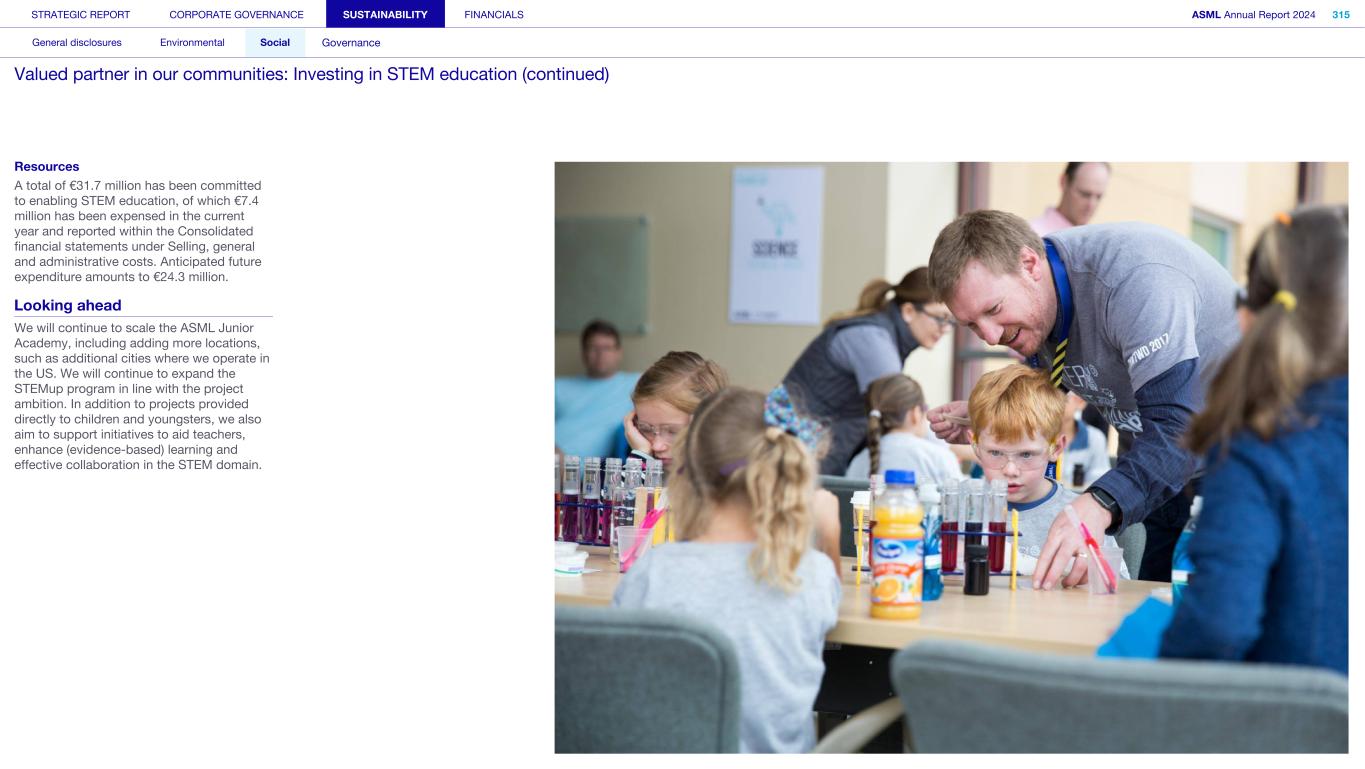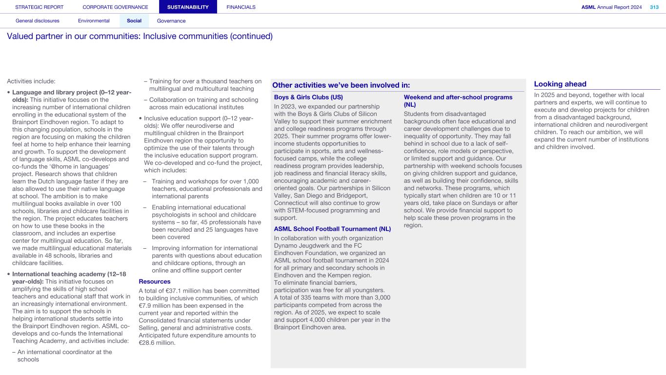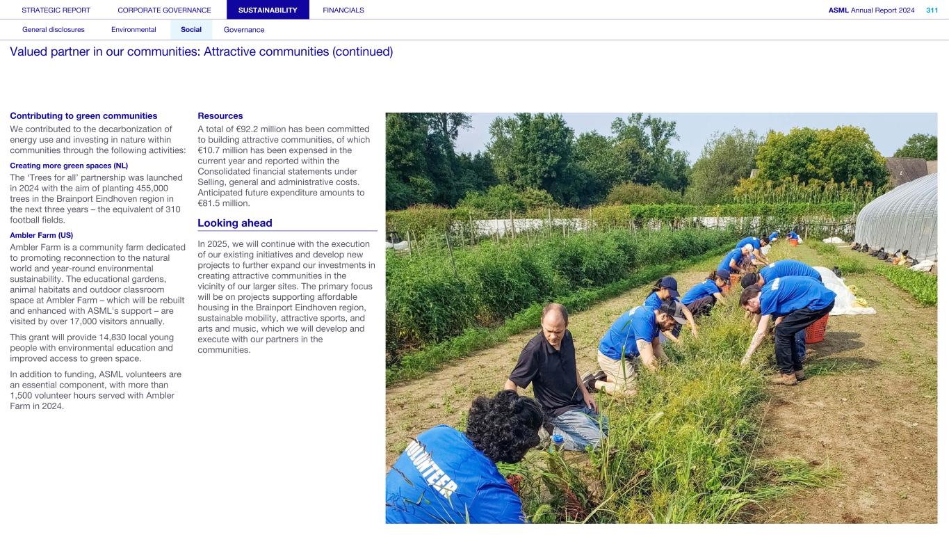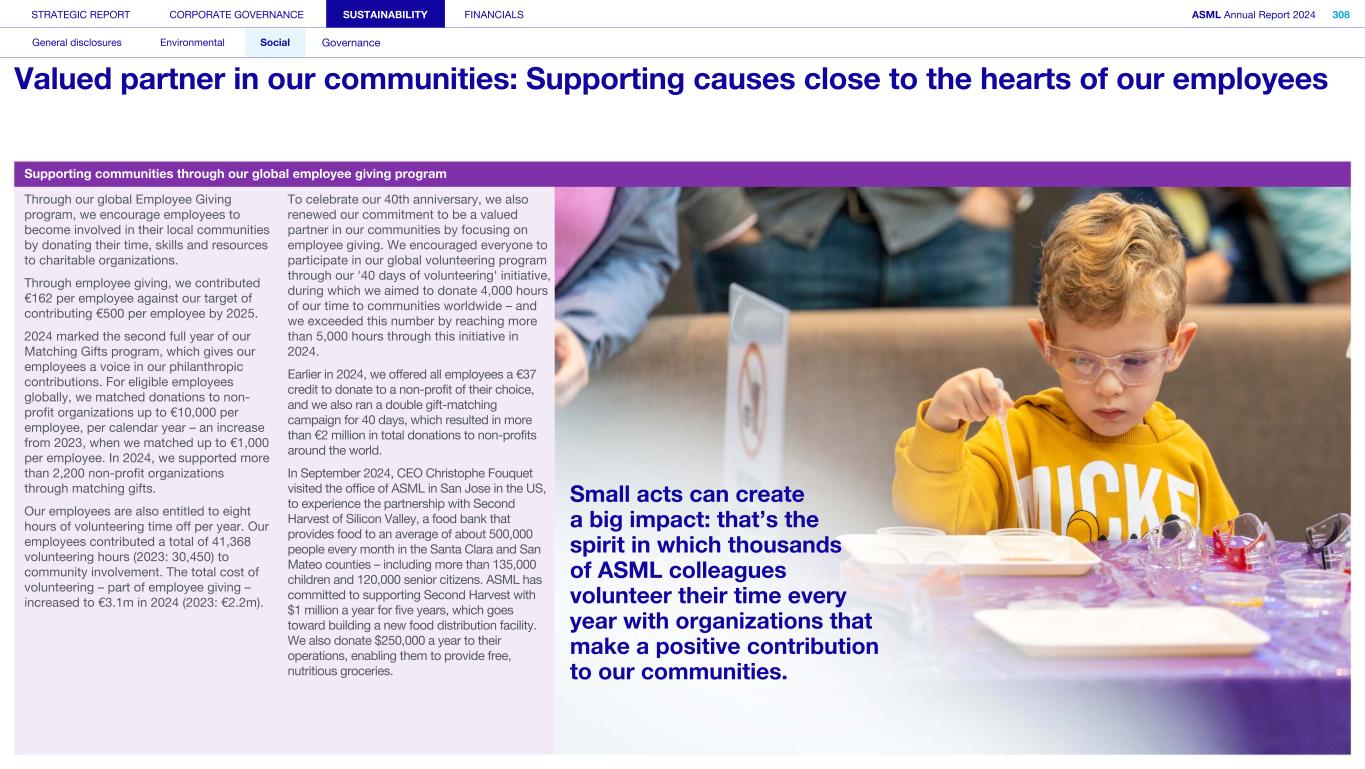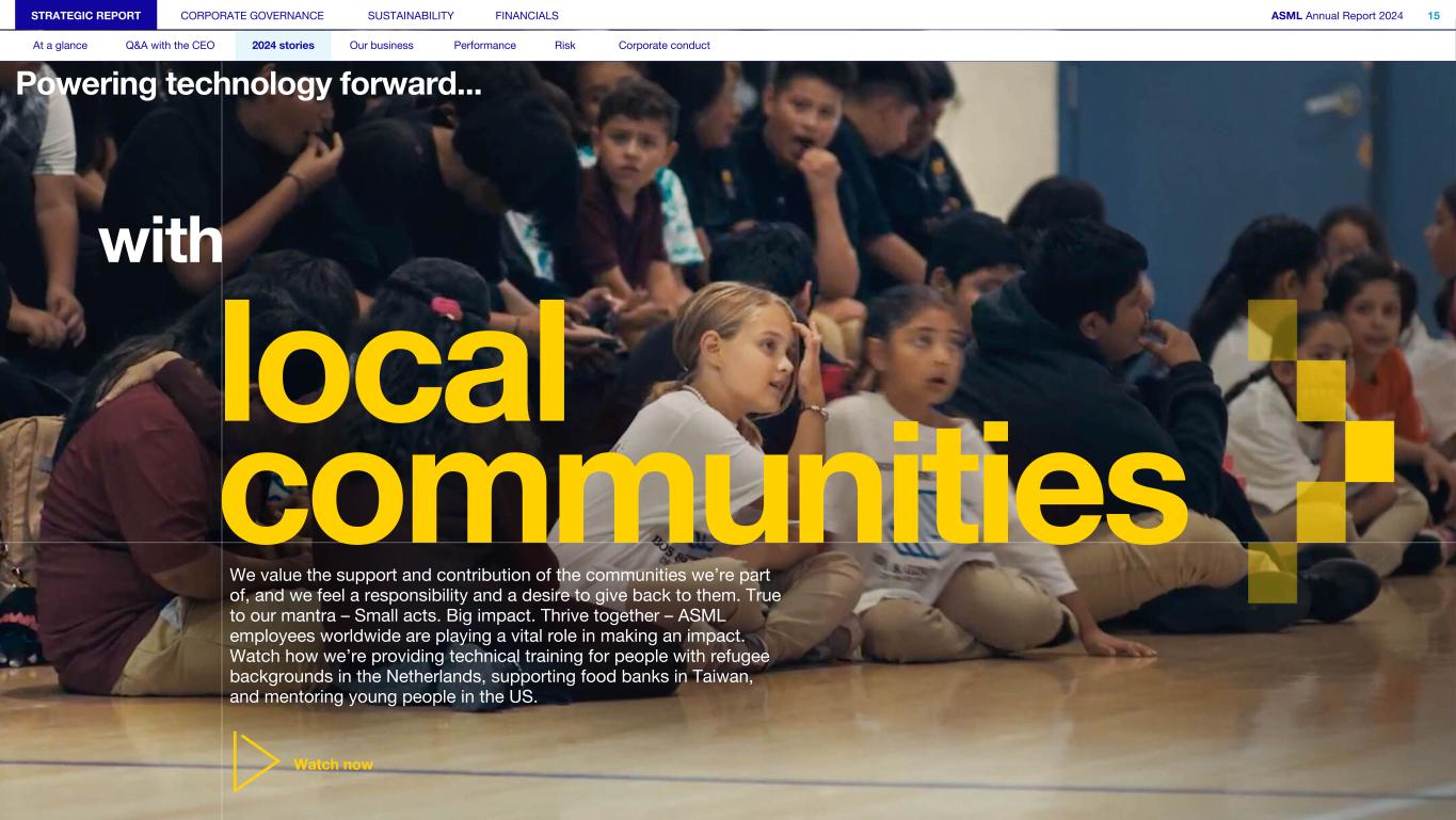 动力科技向前..。战略报告企业治理可持续发展财务ASML年度报告2024 15与CEO的问答一览2024故事我们的业务绩效风险企业行为当地社区我们重视所在社区的支持和贡献,我们感到有责任并渴望回馈他们。忠实于我们的口头禅——小动作。大影响。一起茁壮成长–全球范围内的ASML员工正在发挥至关重要的作用,以产生影响。看看我们如何为荷兰难民背景的人提供技术培训,支持台湾的食品银行,以及指导美国的年轻人。立即观看