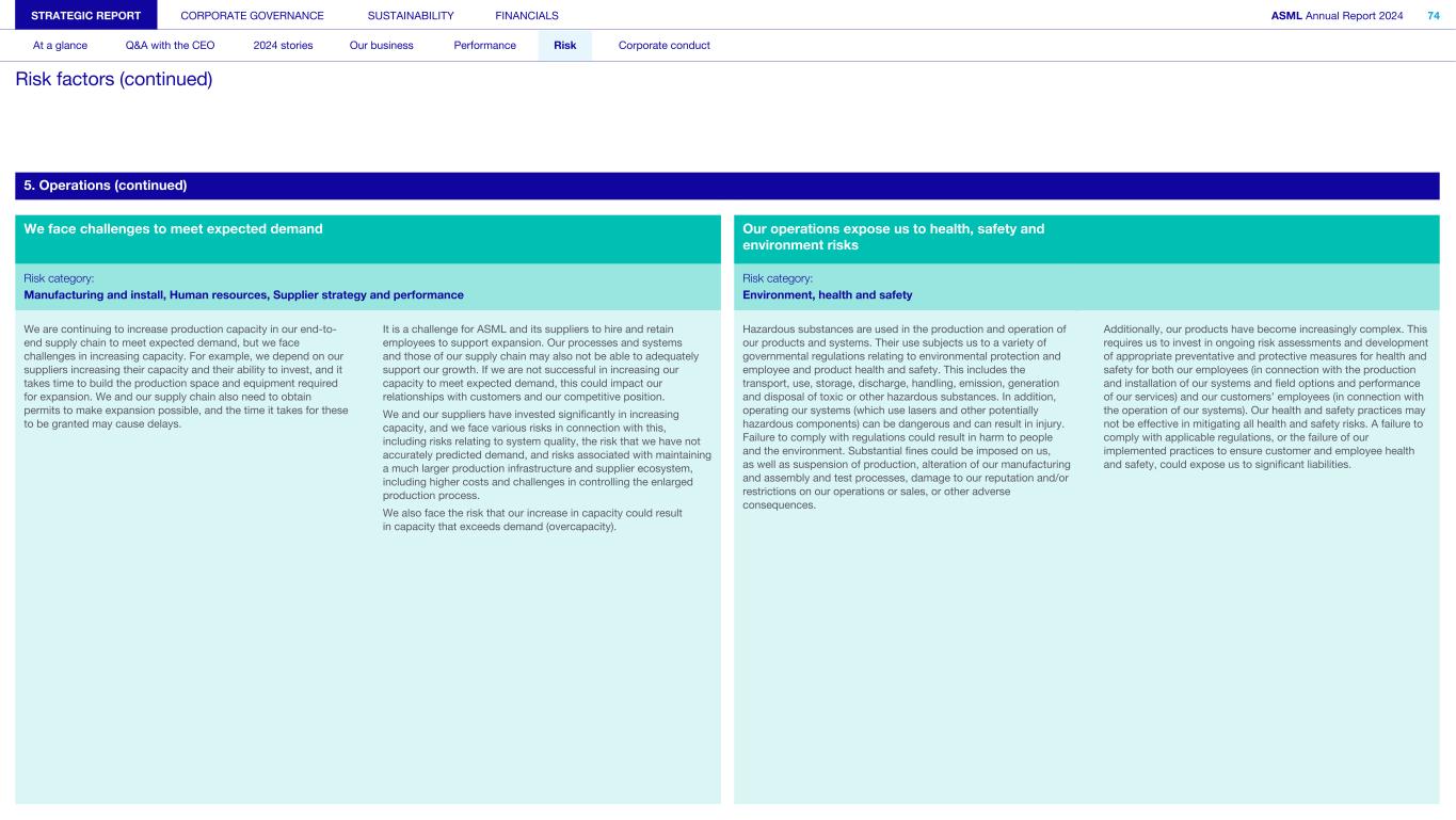 5.运营(续)我们面临满足预期需求的挑战我们的运营使我们面临健康、安全和环境风险风险类别:风险类别:制造和安装、人力资源、供应商战略和绩效环境、健康和安全我们正在持续增加端到端供应链的产能以满足预期需求,但我们在增加产能方面面临挑战。例如,我们依赖我们的供应商增加产能和投资能力,而建设扩张所需的生产空间和设备需要时间。我们和我们的供应链还需要获得许可,以使扩张成为可能,而获得这些许可所需的时间可能会导致延迟。对于ASML及其供应商而言,雇佣和留住员工以支持扩张是一项挑战。我们的流程和系统以及我们供应链的流程和系统也可能无法充分支持我们的增长。如果我们未能成功提高产能以满足预期需求,这可能会影响我们与客户的关系以及我们的竞争地位。我们和我们的供应商在增加产能方面进行了大量投资,我们面临与此相关的各种风险,包括与系统质量相关的风险、我们未能准确预测需求的风险,以及与维持大得多的生产基础设施和供应商生态系统相关的风险,包括更高的成本和在控制扩大的生产过程方面的挑战。我们还面临着这样的风险,即我们的产能增加可能导致产能超过需求(产能过剩)。有害物质用于我们产品和系统的生产和运营。它们的使用使我们受到与环境保护以及员工和产品健康和安全有关的各种政府法规的约束。这包括运输、使用、储存、排放、处理、排放、产生和处置有毒或其他有害物质。此外,操作我们的系统(使用激光和其他潜在危险组件)可能很危险,并可能导致受伤。不遵守规定可能会对人和环境造成损害。可能会对我们处以巨额罚款,以及暂停生产、改变我们的制造、组装和测试流程、损害我们的声誉和/或限制我们的运营或销售,或其他不利后果。此外,我们的产品也变得越来越复杂。这要求我们投资于持续的风险评估,并为我们的员工(与我们的系统和现场选项的生产和安装以及我们的服务的表现有关)和客户的员工(与我们的系统的运行有关)制定适当的健康和安全预防和保护措施。我们的健康和安全做法可能无法有效缓解所有健康和安全风险。未能遵守适用的法规,或我们未能实施确保客户和员工健康和安全的做法,可能会使我们承担重大责任。战略报告公司治理可持续发展财务ASML年度报告2024 74与CEO的一览问答2024故事我们的业务绩效风险公司行为风险因素(续)