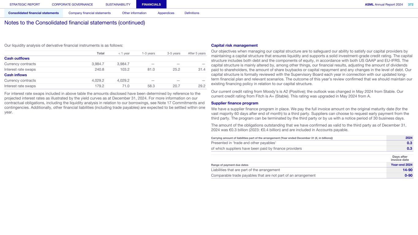 我们对衍生金融工具的流动性分析如下:合计< 1年1-3年3-5年5年后现金流出货币合约3,984.73,984.7 ————利率掉期240.8 103.28 1.025.23 1.4现金流入货币合约4,029.24,029.2 ————利率掉期179.27 1.05 8.32 0.72 9.2上表所列利率掉期披露金额已参考2024年12月31日收益率曲线所示的预计利率确定。有关我们的合同义务的更多信息,包括与我们的借款相关的流动性分析,请参阅附注17承诺和或有事项。此外,其他金融负债(包括贸易应付款项)预计将在一年内结清。资本风险管理我们在管理资本结构时的目标是,通过维持确保流动性和支持可靠的投资级信用评级的资本结构,来保障我们满足资本提供者的能力。根据美国公认会计原则和欧盟国际财务报告准则,资本结构既包括债务,也包括股权部分。资本结构的改变主要受(其中包括)我们的财务业绩、调整支付给股东的股息金额、股票回购或资本偿还金额以及债务水平的任何变化所影响。我们的资本结构每年都会根据我们更新的长期财务计划和相关情景与监事会进行正式审查。今年的检讨结果证实,我们应维持与资本结构有关的现有融资政策。我们目前在穆迪的信用评级为A2(正面);2024年5月将前景从稳定。我们目前获得惠誉的信用评级为A +(稳定)。该评级于2024年5月从A.供应商融资计划上调。我们有一个供应商融资计划。我们将原到期日的全额发票金额(绝大多数为月底后60天)支付给第三方。供应商可以选择向第三方要求提前付款。该计划可由第三方或我们终止,通知期为30个工作日。截至2024年12月31日,我们确认对第三方有效的未偿债务金额为3亿欧元(2023年:4亿欧元),计入应付账款。安排中部分负债的账面金额(截至12月31日止年度(欧元,单位:十亿))2024年列于‘贸易和其他应付款项’的0.3其中供应商已在发票日期后0.3天付款付款到期日的范围2024年底属于安排中的负债14-90不属于安排的可比贸易应付款项0-90战略报告公司治理可持续性财务ASML年度报告2024372合并财务报表公司财务报表其他信息附录定义合并财务报表附注(续)