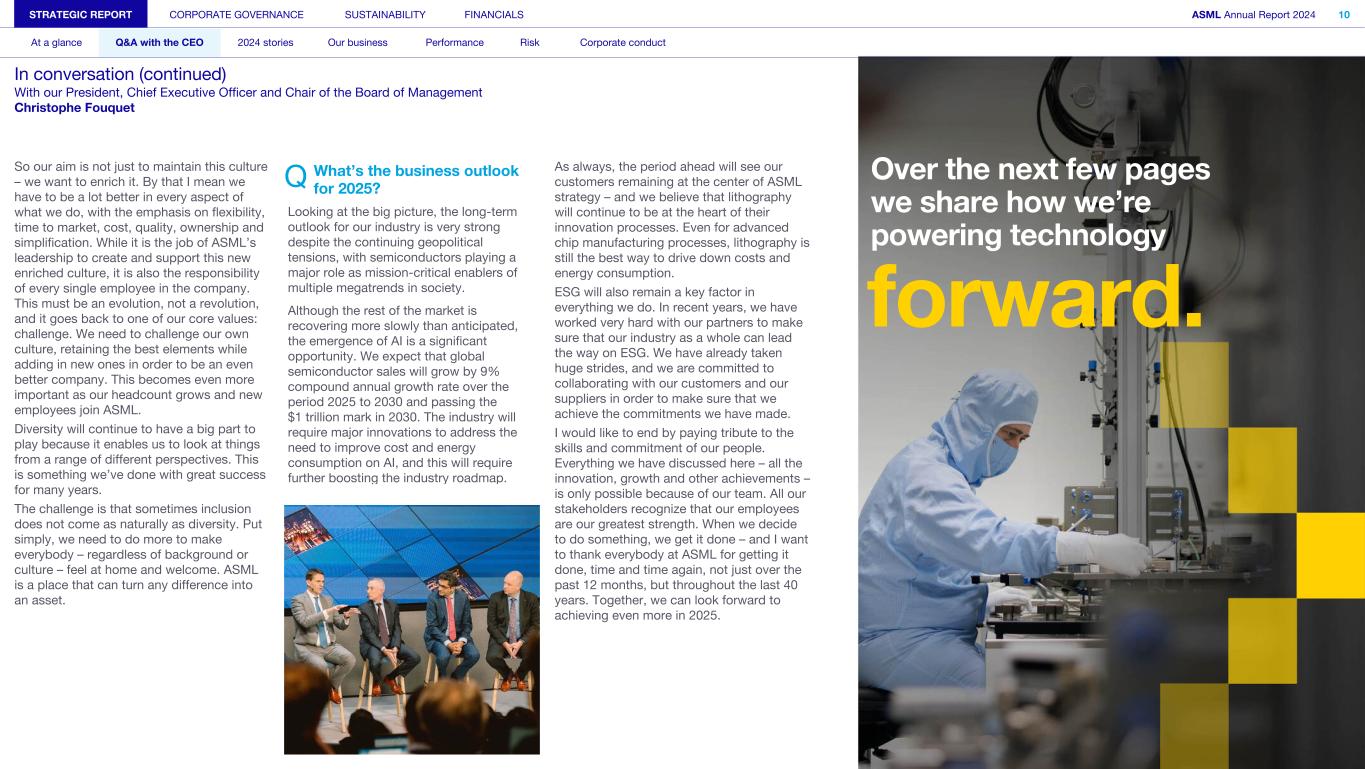 所以我们的目标不只是维护这种文化——我们想丰富它。我的意思是,我们必须在我们所做的每一个方面都做得更好,强调灵活性、上市时间、成本、质量、所有权和简化。创造和支持这种新的丰富文化是ASML领导层的职责所在,同时也是公司每一位员工的责任所在。这一定是一场进化,而不是一场革命,它回到了我们的核心价值观之一:挑战。我们需要挑战自己的文化,保留最好的元素,同时加入新的元素,才能成为更好的公司。随着我们员工人数的增加和新员工加入ASML,这一点变得更加重要。多样性将继续发挥重要作用,因为它使我们能够从一系列不同的角度看待事物。这是我们多年来取得巨大成功的事情。面临的挑战是,有时包容性并不像多样性那么自然。简单地说,我们需要做更多的工作,让每个人——无论背景或文化——都有宾至如归的感觉和受欢迎的感觉。ASML是一个可以将任何差异转化为资产的地方。问:2025年的业务前景如何?从大局来看,尽管地缘政治紧张局势持续,但我们行业的长期前景非常强劲,半导体作为社会多个大趋势的关键任务推动者发挥着重要作用。尽管市场其余部分的复苏速度比预期的要慢,但人工智能的出现是一个重要的机会。我们预计,全球半导体销售额将在2025-2030年期间以9%的复合年增长率增长,并在2030年突破1万亿美元大关。该行业将需要重大创新,以解决提高人工智能成本和能源消耗的需求,这将需要进一步推动行业路线图。与往常一样,在未来一段时间内,我们的客户将继续处于ASML战略的中心——我们相信,光刻技术将继续处于其创新过程的核心。即使对于先进的芯片制造工艺,光刻仍然是降低成本和能源消耗的最佳方式。ESG也将仍然是我们所做每一件事的关键因素。近年来,我们与合作伙伴一起非常努力地工作,以确保我们的行业作为一个整体能够在ESG方面处于领先地位。我们已经迈出了巨大的步伐,我们致力于与我们的客户和供应商合作,以确保我们实现我们所做的承诺。最后,我要对我国人民的技能和承诺表示敬意。我们在这里讨论过的一切——所有的创新、成长和其他成就——都是因为我们的团队才有可能。我们所有的利益相关者都认识到,我们的员工是我们最大的优势。当我们决定做某件事时,我们就会把它做好——我要感谢ASML的每一个人,一次又一次地把它做好,不仅仅是在过去的12个月,而是在过去的40年里。齐心协力,我们可以期待在2025年取得更大成就。战略报告公司治理可持续发展财务ASML年度报告2024 10一览与首席执行官的问答2024故事我们的业务绩效风险与我们的总裁、首席执行官和管理委员会主席克里斯托夫·福凯(Christophe Fouquet)对话(续)中的公司行为在接下来的几页中,我们将分享我们如何推动技术向前发展。