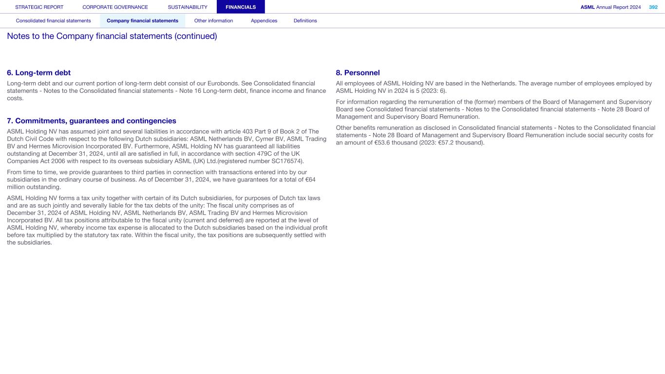 6.长期债务长期债务和我们目前的长期债务部分由我们的欧洲债券组成。见合并财务报表-合并财务报表附注-附注16长期债务、财务收入和财务费用。7.承诺、担保和或有事项阿斯麦 NV已根据荷兰民法典第2卷第9部分第403条就以下荷兰子公司承担连带责任:ASML Netherlands BV、Cymer BV、ASML Trading BV和Hermes Microvision Incorporated BV。此外,根据2006年英国公司法第479C条,对于其海外子公司ASML(英国)有限公司(注册号SC176574),阿斯麦 NV为截至2024年12月31日的所有未偿负债提供担保,直至全部得到全额偿付。我们不时就我们的子公司在日常业务过程中达成的交易向第三方提供担保。截至2024年12月31日,我们有总额为6400万欧元的未偿担保。阿斯麦 NV与其某些荷兰子公司一起形成税务统一,为荷兰税法的目的,因此对该统一的税务债务承担连带责任:财政统一包括截至2024年12月31日的TERML Holding NV、ASMLTERMNetherlands BV、ASML Trading BV和Hermes Microvision Incorporated BV。归属于财政统一的所有税务情况(当期和递延)在阿斯麦 NV层面报告,据此,所得税费用根据个人税前利润乘以法定税率分配给荷兰子公司。在财政统一范围内,税收头寸随后与子公司结算。8.人员阿斯麦 NV的所有员工均居住在荷兰。阿斯麦 NV在2024年的平均雇员人数为5人(2023年:6人)。有关管理委员会和监事会(前任)成员薪酬的信息,请参见合并财务报表-合并财务报表附注-附注28管理委员会和监事会薪酬。合并财务报表中披露的其他福利薪酬-合并财务报表附注-附注28管理委员会和监事会薪酬包括社会保障费用,金额为5.36万欧元(2023年:5.72万欧元)。战略报告公司治理可持续发展财务ASML年度报告2024392合并财务报表公司财务报表其他信息附录定义公司财务报表附注(续)
