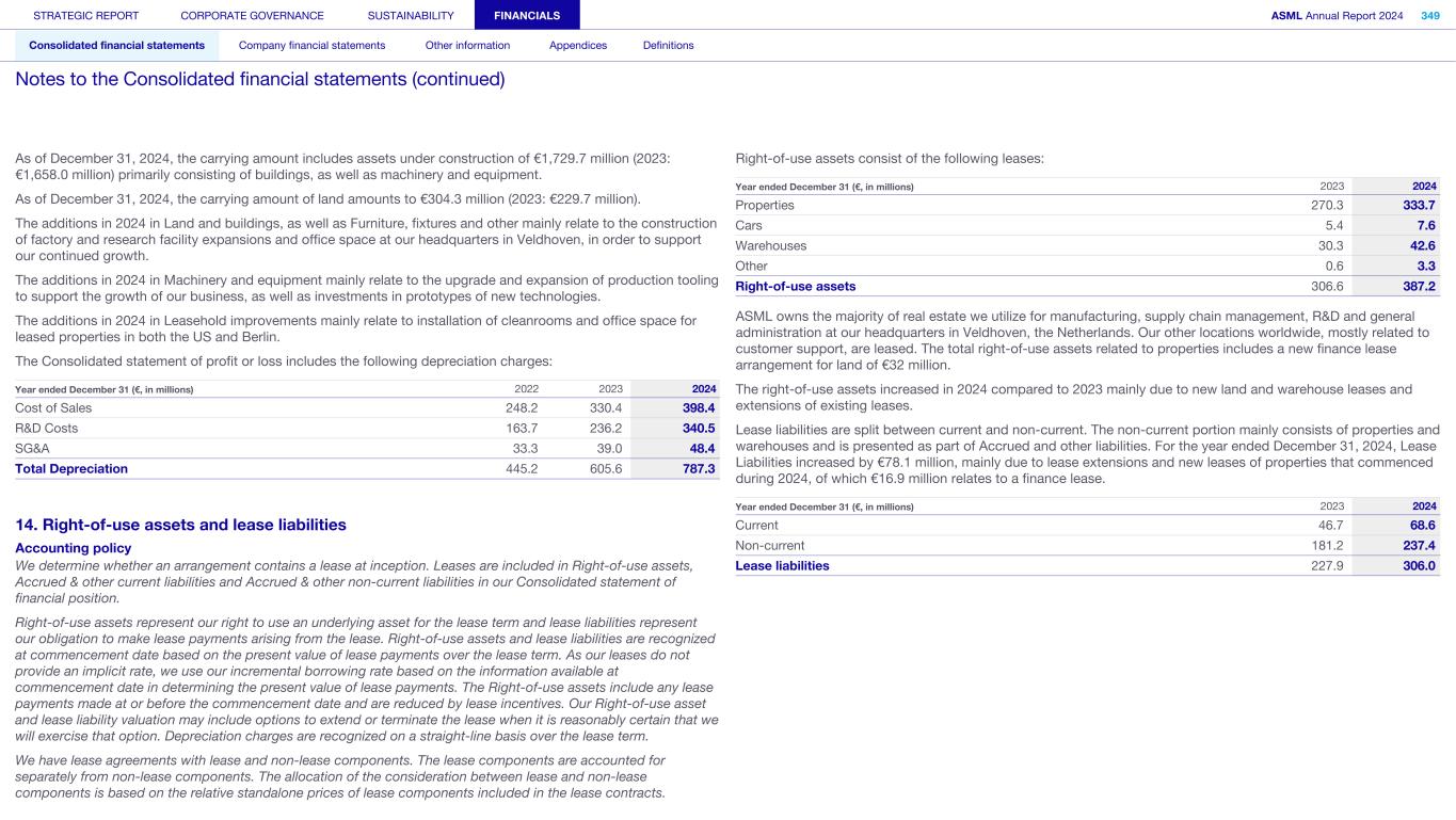 截至2024年12月31日,账面金额包括在建资产17.297亿欧元(2023年:16.580亿欧元),主要包括建筑物以及机器和设备。截至2024年12月31日,土地账面价值为3.043亿欧元(2023年:2.297亿欧元)。2024年增加的土地和建筑物,以及家具、固定装置和其他主要涉及在我们位于Veldhoven的总部建造工厂和研究设施扩建以及办公空间,以支持我们的持续增长。2024年机械设备的新增主要涉及生产工具的升级和扩展,以支持我们的业务增长,以及对新技术原型的投资。2024年新增的租赁物业改善主要涉及为美国和柏林的租赁物业安装洁净室和办公空间。合并损益表包括以下折旧费用:截至12月31日止年度(欧元,单位:百万)202220232024销售成本248.23 30.43 98.4研发成本163.72 36.23 40.5SG & A33.339.04 8.4折旧总额445.2605.67 87.3 14。使用权资产和租赁负债会计政策我们确定一项安排在开始时是否包含租赁。租赁包括在我们的综合财务状况表中的使用权资产、应计及其他流动负债和应计及其他非流动负债中。使用权资产代表我们在租赁期内使用标的资产的权利,租赁负债代表我们支付租赁产生的租赁付款的义务。使用权资产和租赁负债按租赁期内租赁付款额的现值在开始日确认。由于我们的租赁没有提供隐含利率,我们在确定租赁付款的现值时使用基于开始日可获得的信息的增量借款利率。使用权资产包括在开始日期或之前支付并通过租赁奖励减少的任何租赁付款。我们的使用权资产和租赁负债估值可能包括在合理确定我们将行使该选择权时延长或终止租赁的选择权。折旧费用在租赁期内按直线法确认。我们有包含租赁和非租赁组件的租赁协议。租赁部分与非租赁部分分开核算。租赁和非租赁组成部分之间的对价分配是基于租赁合同中包含的租赁组成部分的相对独立价格。使用权资产包括以下租赁:截至12月31日止年度(欧元,百万)20232024 Properties 270.33 33.7 Cars 5.47.6 Warehouses 30.34 2.6 Other 0.6 3.3使用权资产306.63 87.2 ASML拥有我们用于制造、供应链管理、研发和一般管理的大部分房地产,位于我们位于荷兰Veldhoven的总部。我们在世界各地的其他地点,主要与客户支持有关,都是租用的。与物业相关的使用权资产总额包括3200万欧元的新土地融资租赁安排。与2023年相比,2024年的使用权资产有所增加,主要是由于新的土地和仓库租赁以及现有租赁的延期。租赁负债分为流动负债和非流动负债。非流动部分主要包括物业和仓库,并作为应计负债和其他负债的一部分列报。截至2024年12月31日止年度,租赁负债增加了7810万欧元,主要是由于2024年开始的租赁延期和物业新租赁,其中1690万欧元与融资租赁有关。截至12月31日止年度(欧元,百万)20232024流动46.768.6非流动181.22 37.4租赁负债227.93 06.0战略报告公司治理可持续发展财务2024349年度报告合并财务报表公司财务报表其他信息附录定义合并财务报表附注(续)
